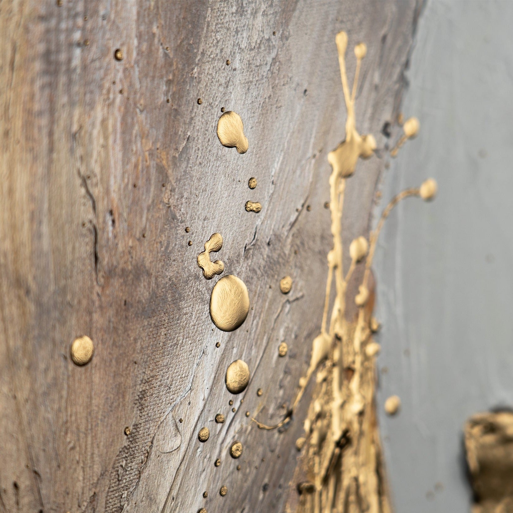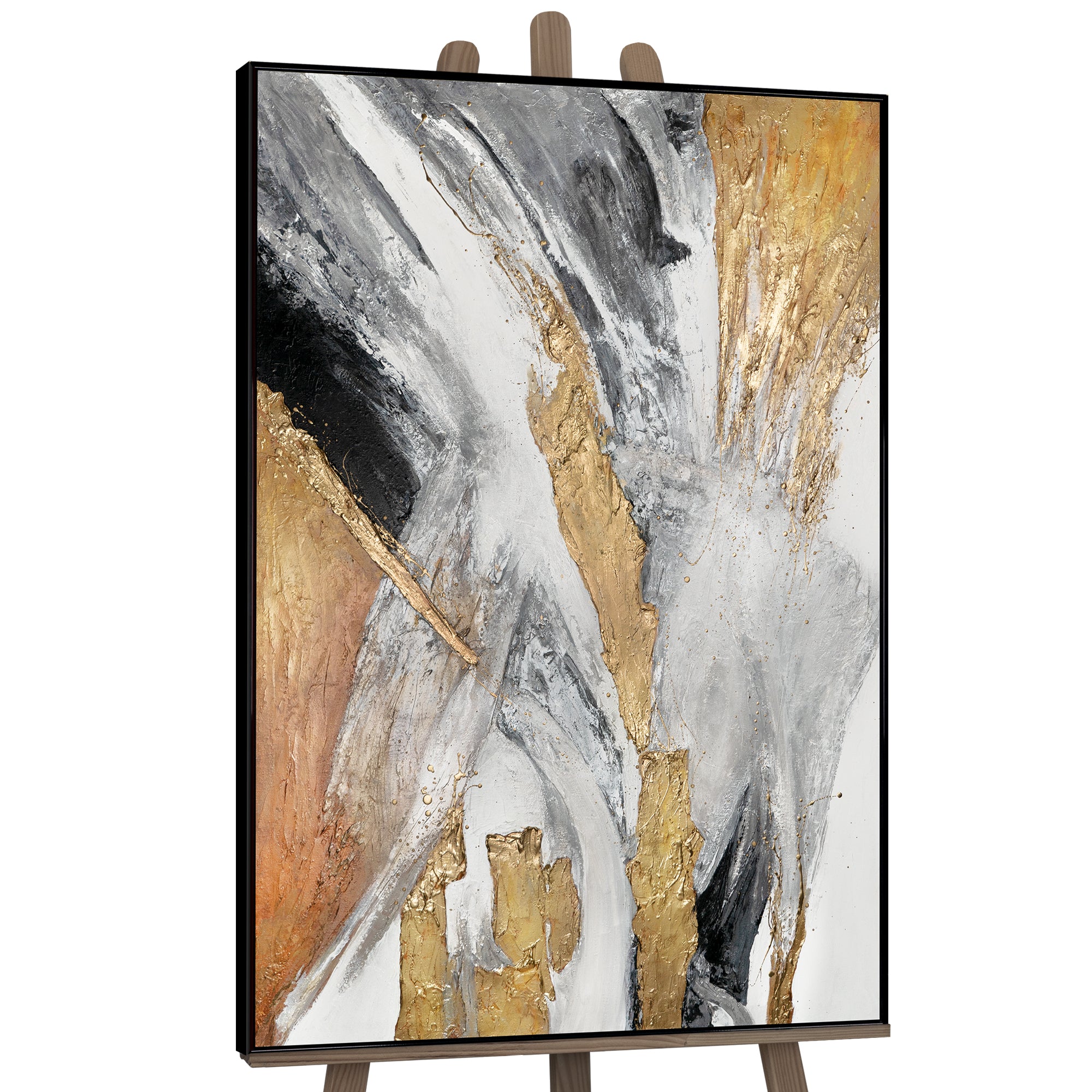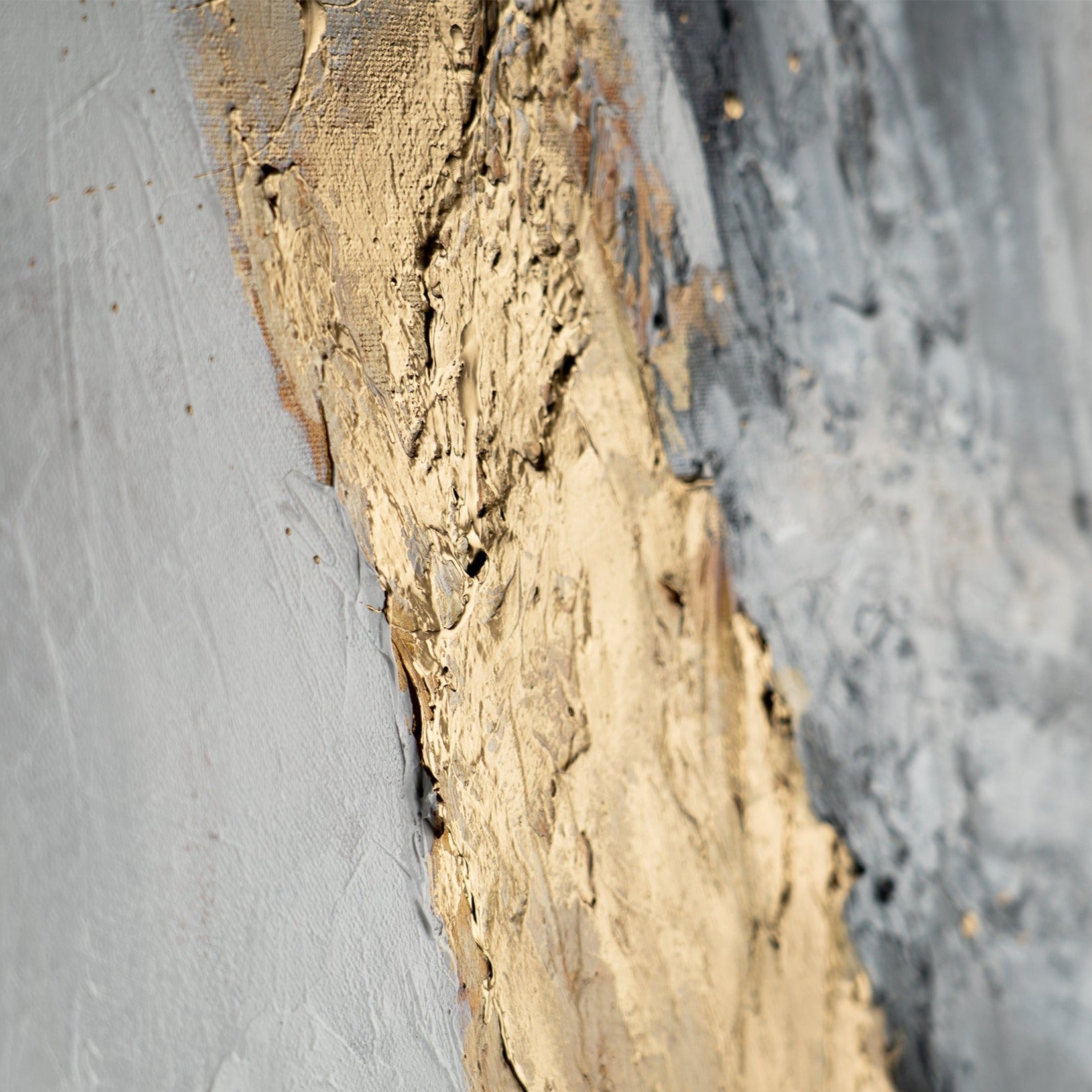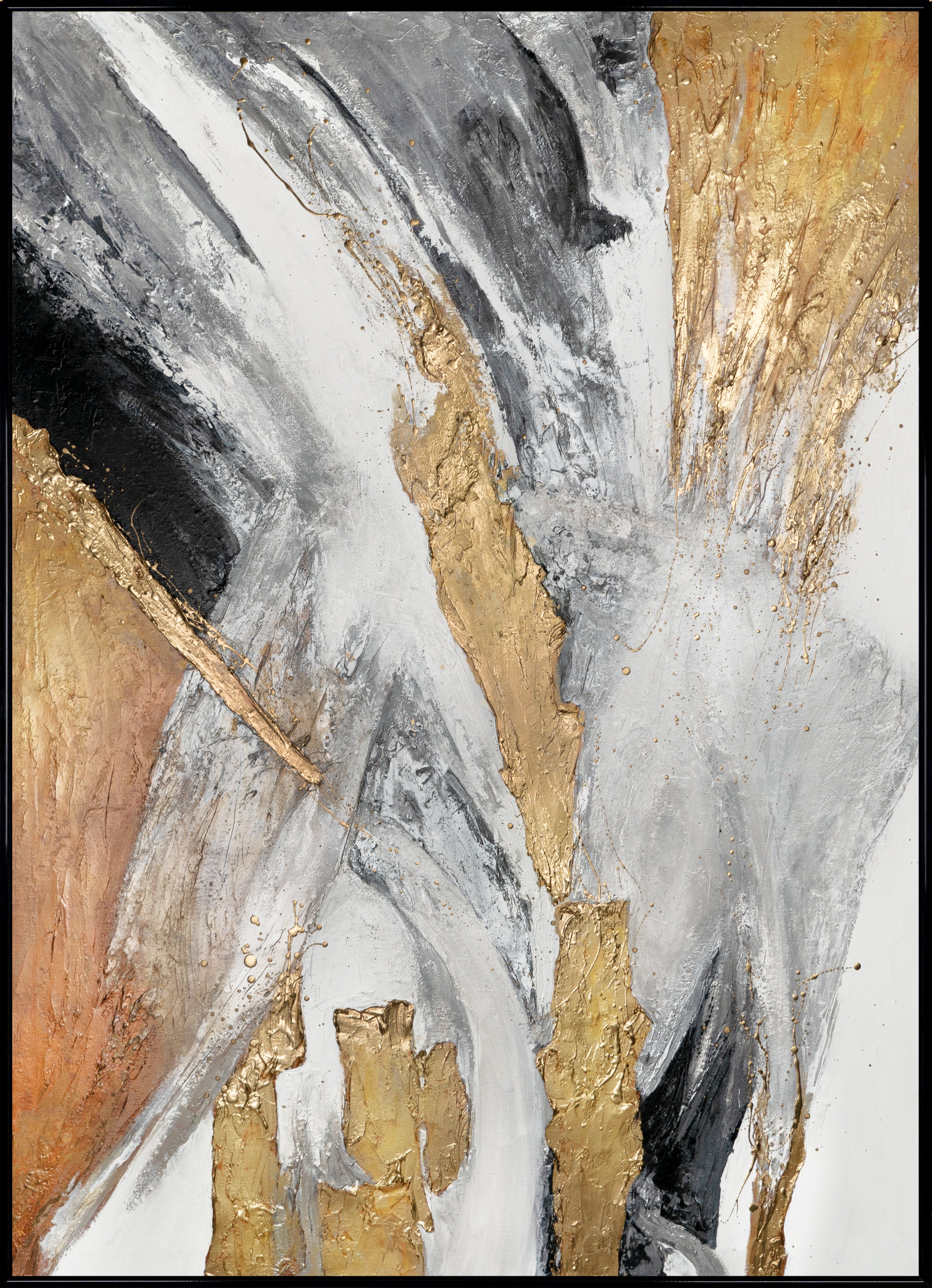 Bereichern Sie Ihr Zuhause oder Büro mit diesem eleganten, abstrakten Kunstwerk, das durch goldene und graue Töne eine dynamische und moderne Komposition darstellt. Das Bild besticht durch kräftige Kontraste und ausdrucksstarke Pinselstriche. Es ist 100% handgemalt und wird durch einen eleganten Rahmen hervorgehoben.