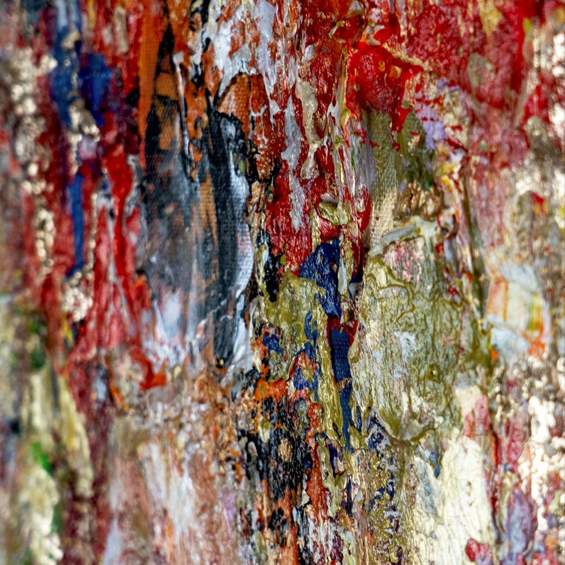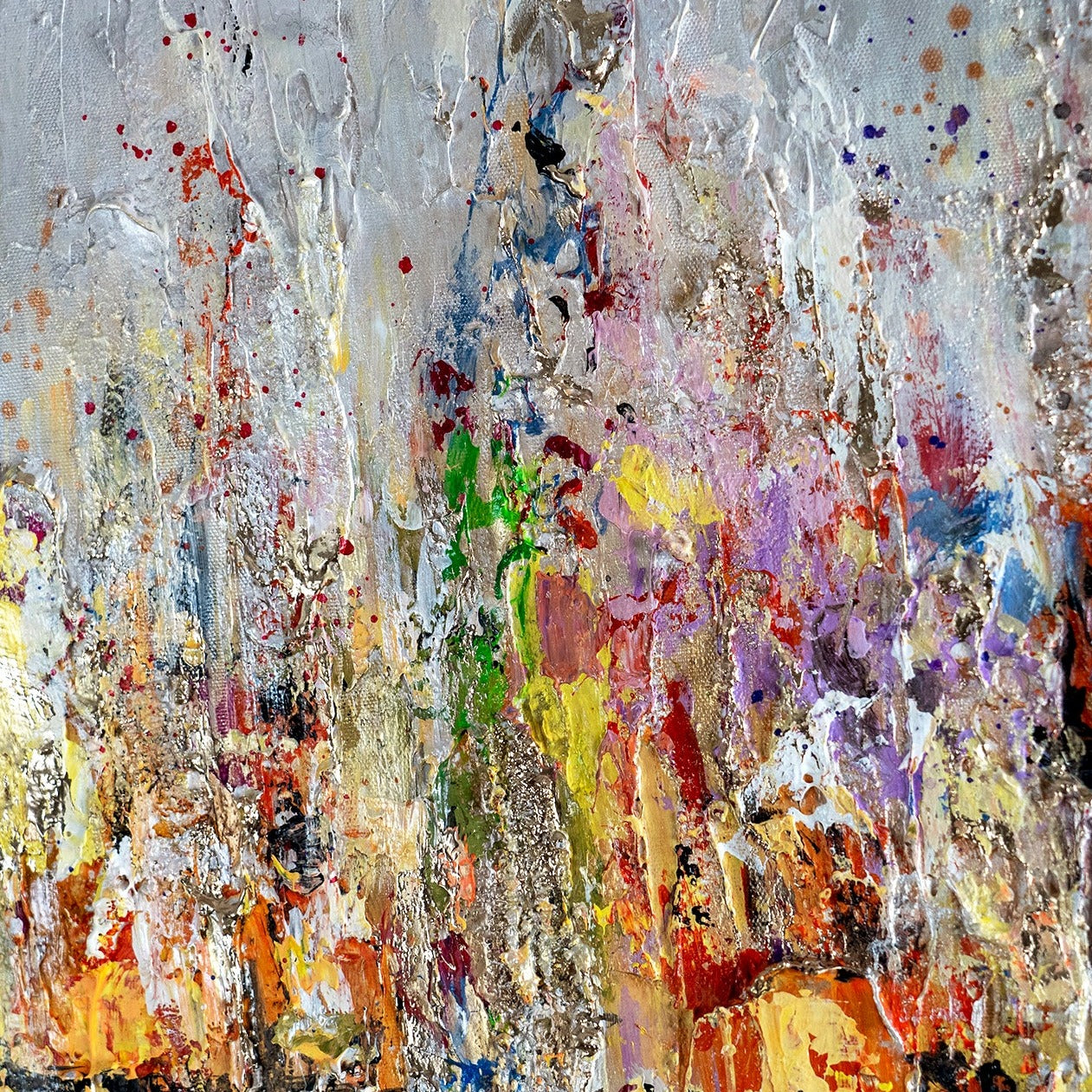 • Detailaufnahme der farbenfrohen Acrylstruktur auf Grau