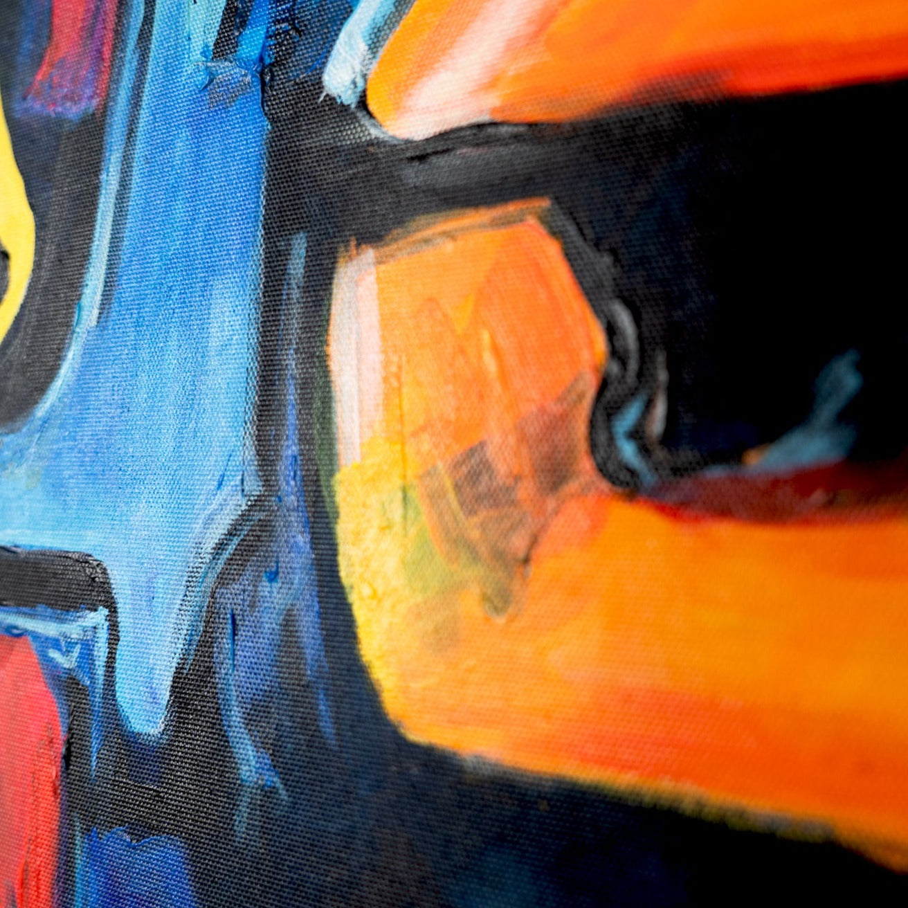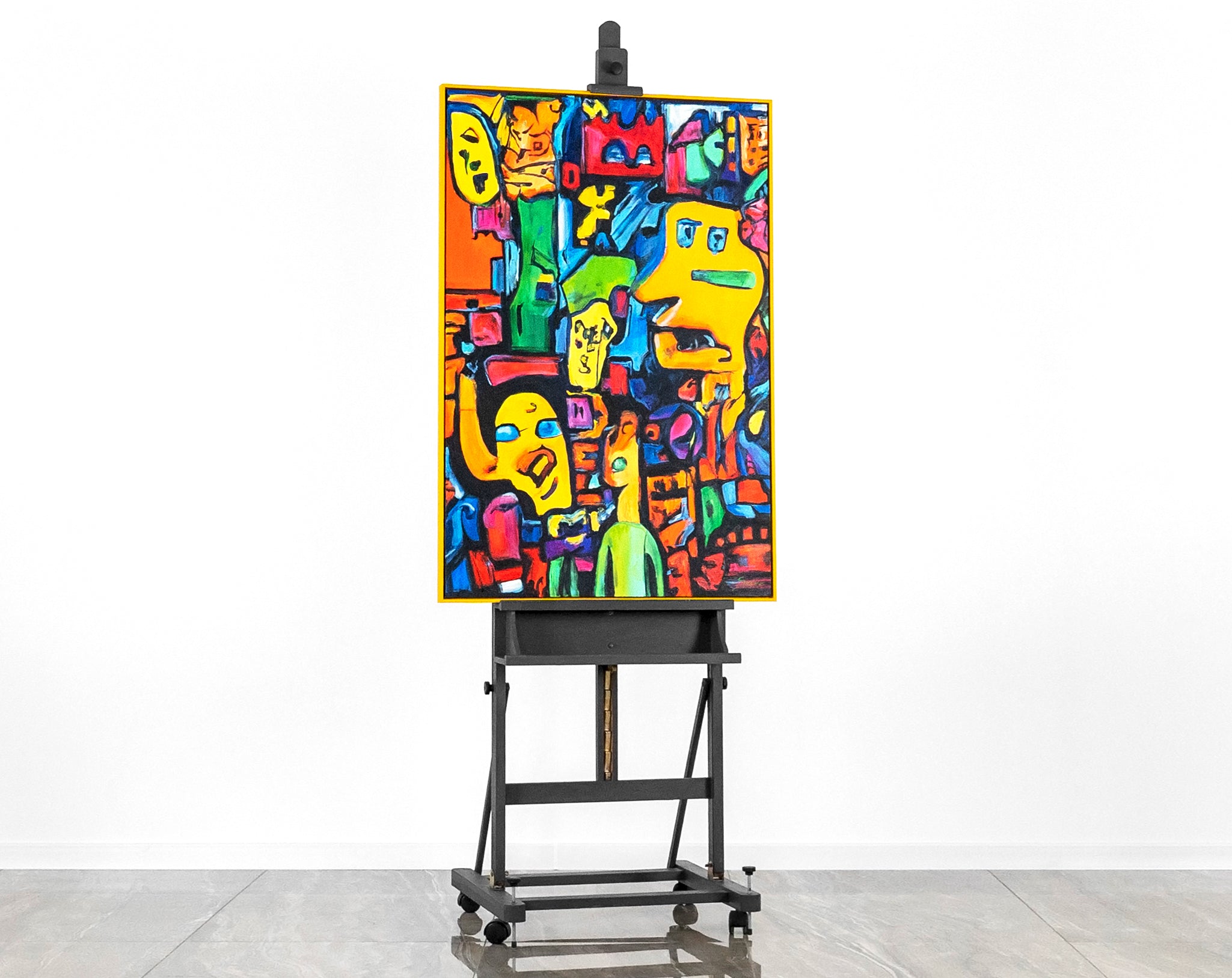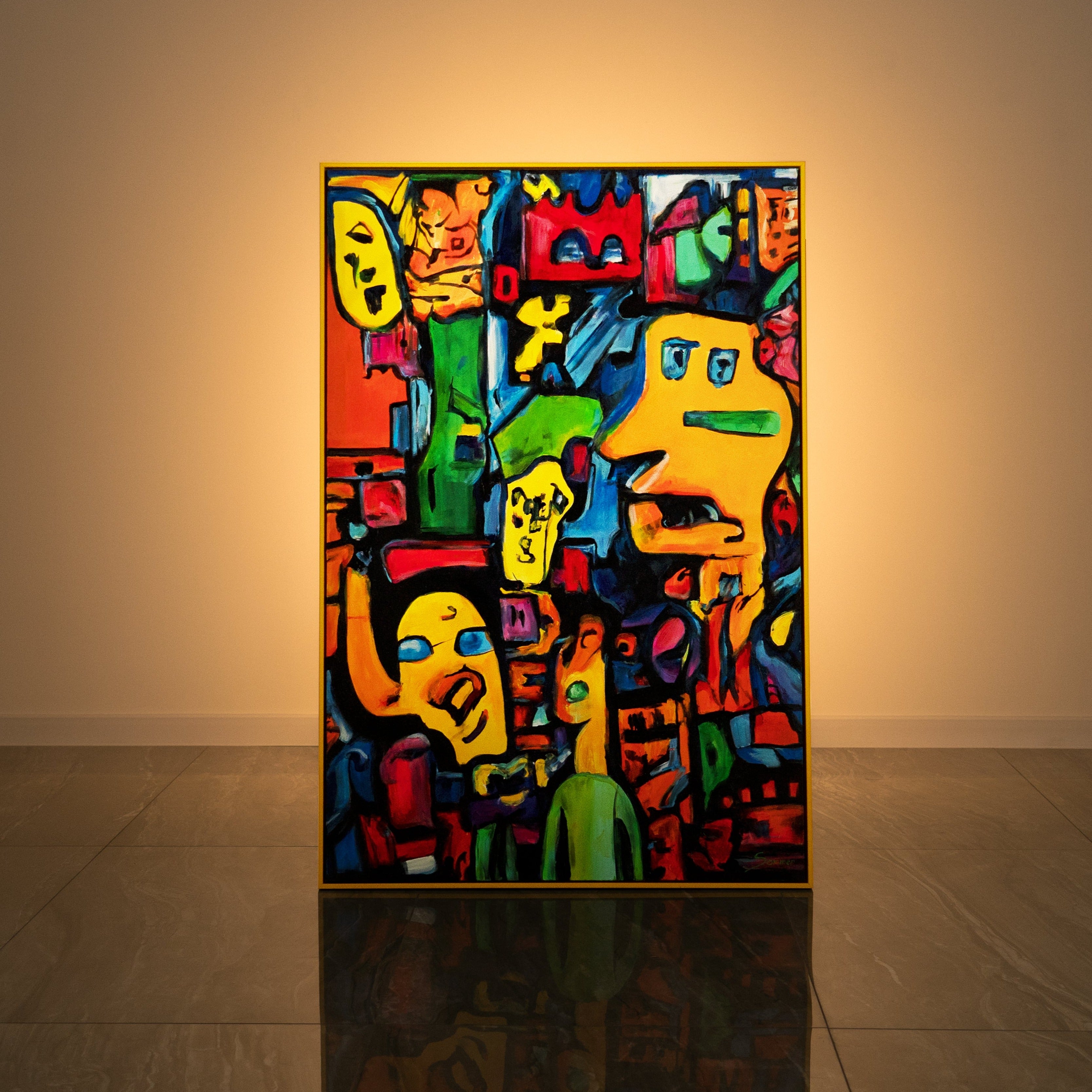 • Pop Art Gemälde mit Figuren im farbenfrohen Interieur