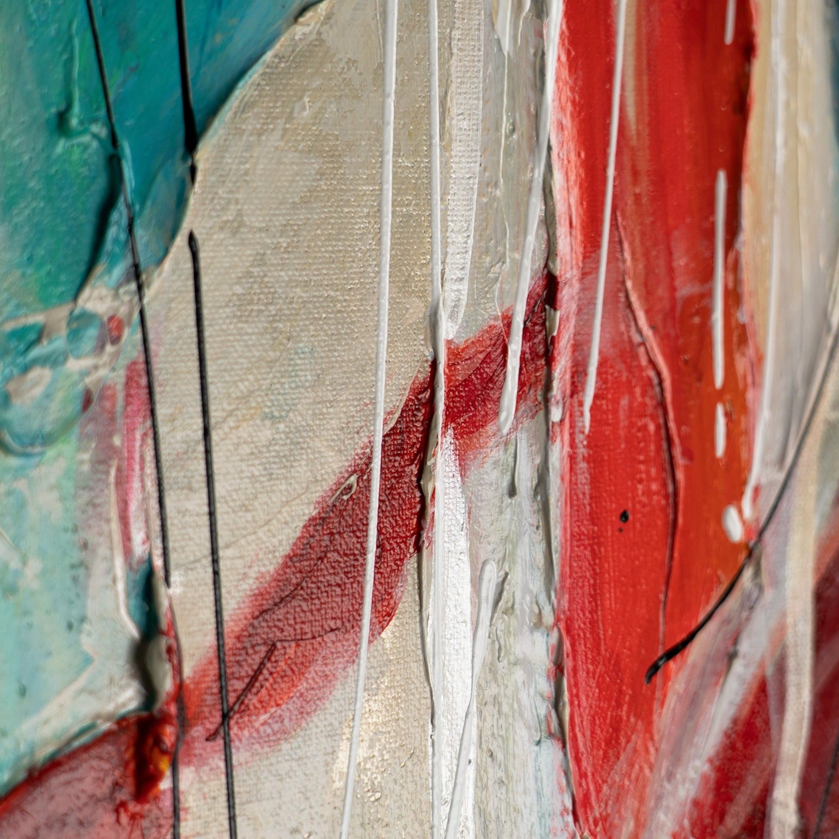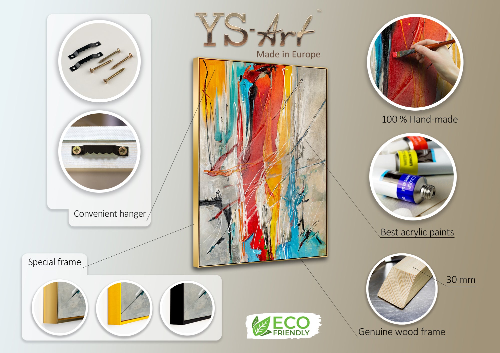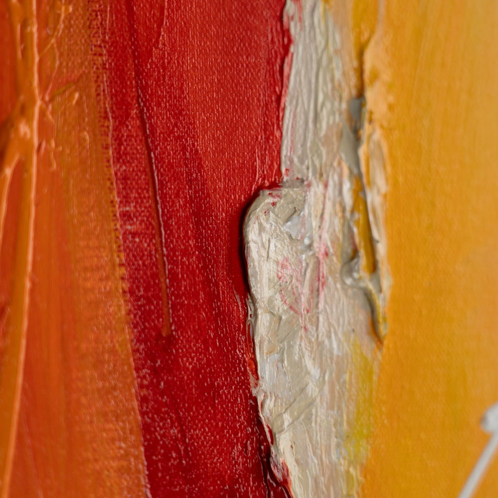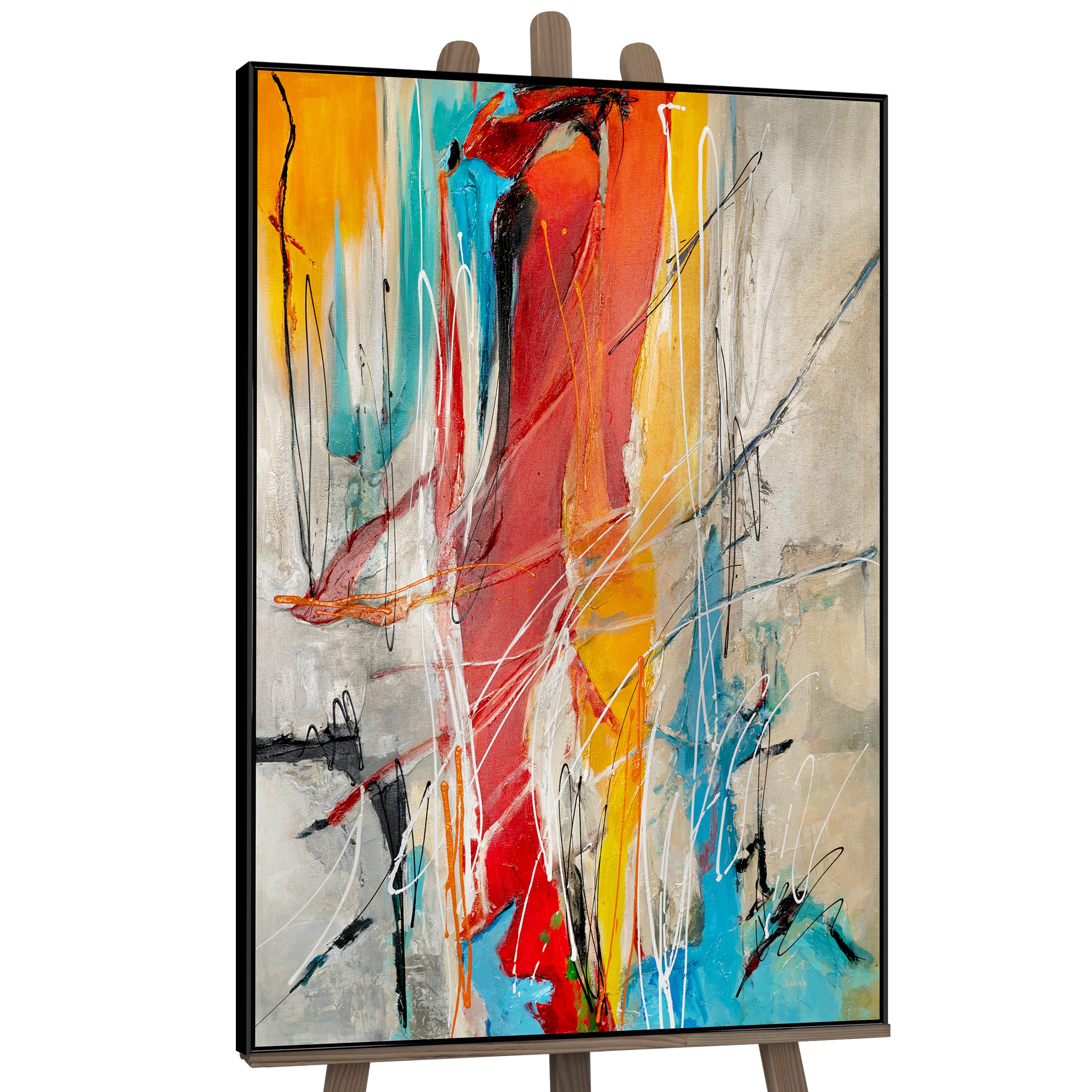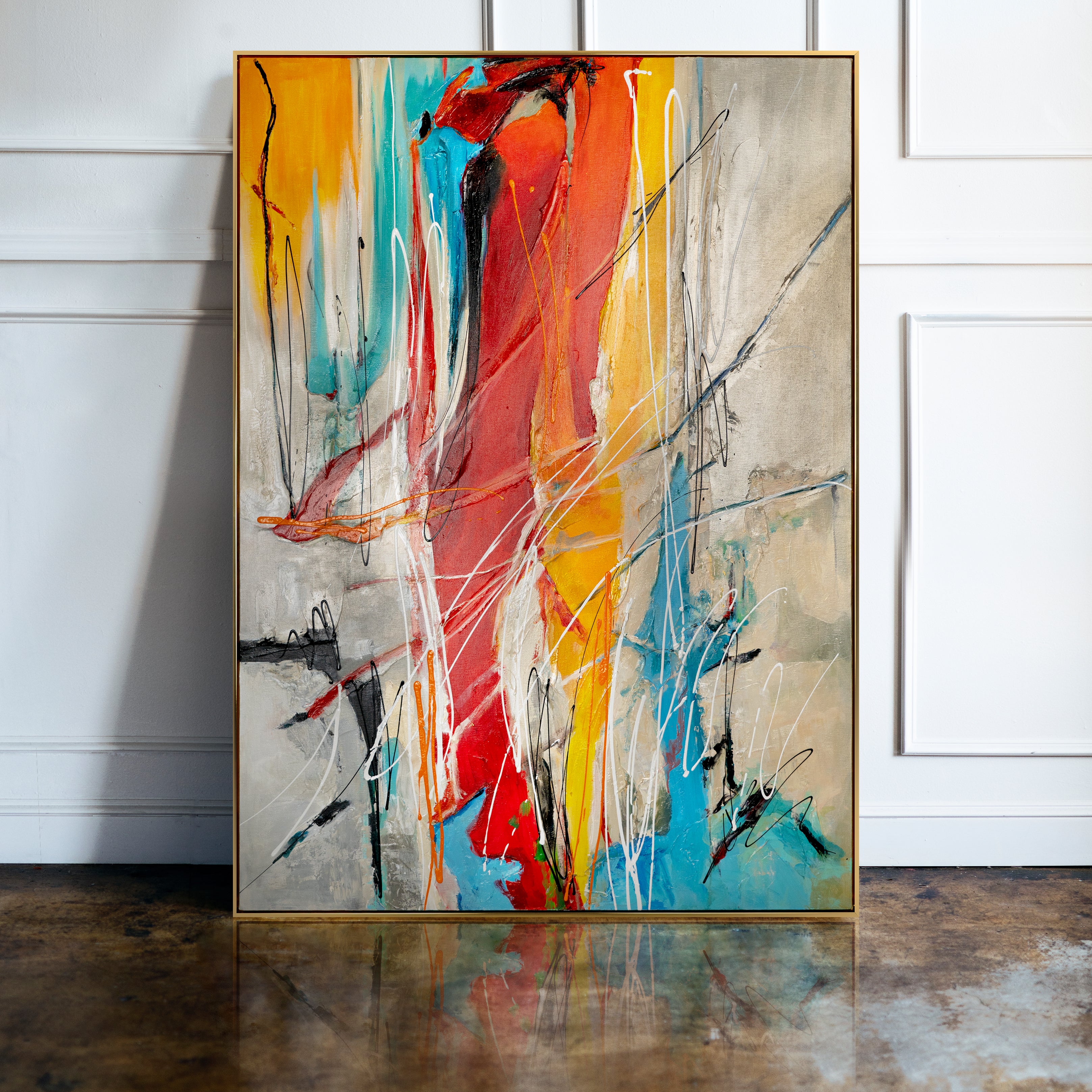 Bereichern Sie Ihr Zuhause oder Büro mit diesem farbenfrohen, abstrakten Kunstwerk, das durch lebhafte Rot-, Gelb- und Blautöne eine dynamische Komposition darstellt. Das Bild besticht durch kräftige Farbtöne und ausdrucksstarke Pinselstriche. Es ist 100% handgemalt und wird durch einen eleganten Rahmen hervorgehoben.