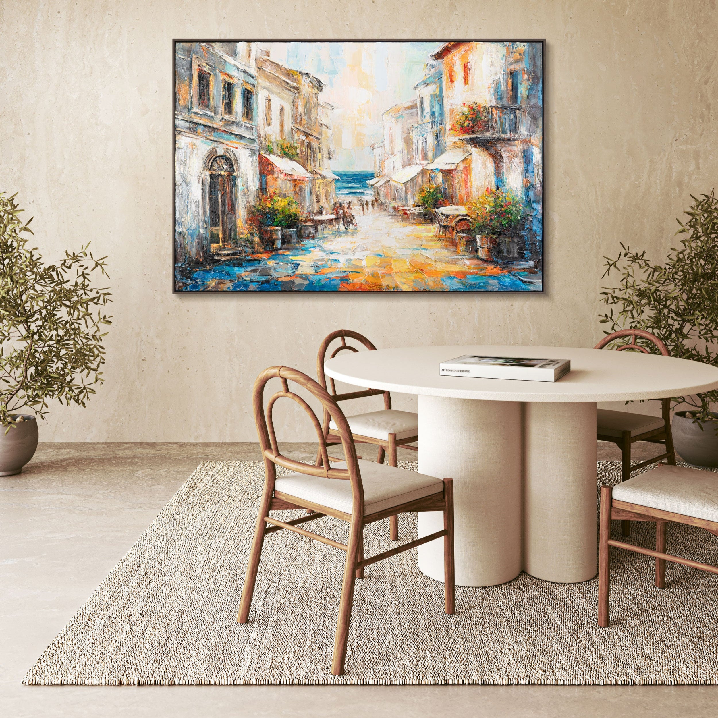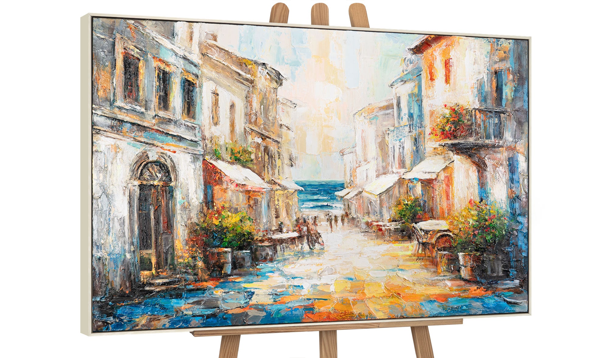 Das Gemälde „Warme Brise“ bringt die sonnige Leichtigkeit eines mediterranen Dorfes direkt in Ihre vier Wände. Mit lebhaften Farben und einer spürbaren Textur zeigt dieses handgemalte Kunstwerk eine charmante Gasse, die sich zum Meer hin öffnet. Die harmonische Komposition aus Licht, Architektur und Natur vermittelt Ruhe und Lebensfreude.