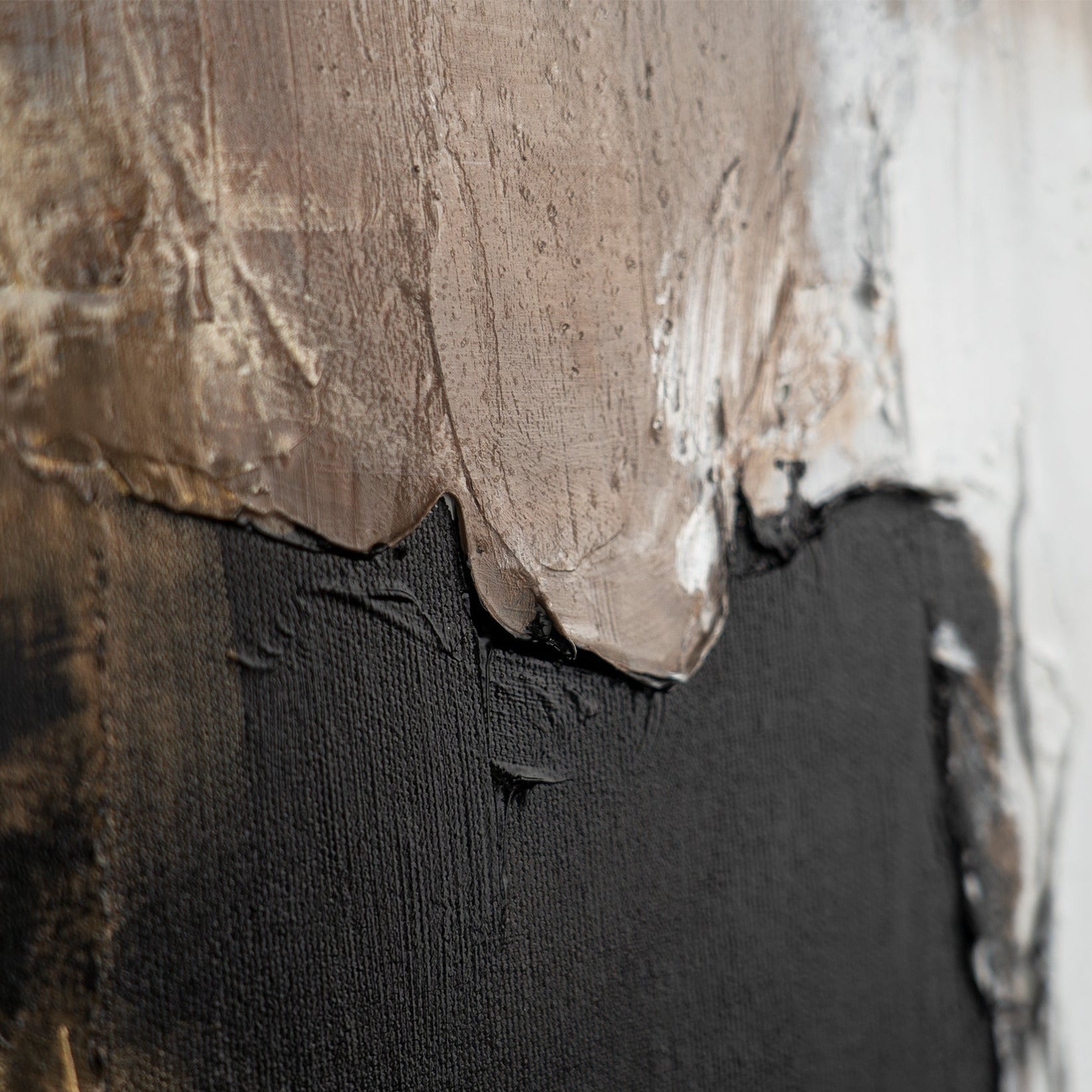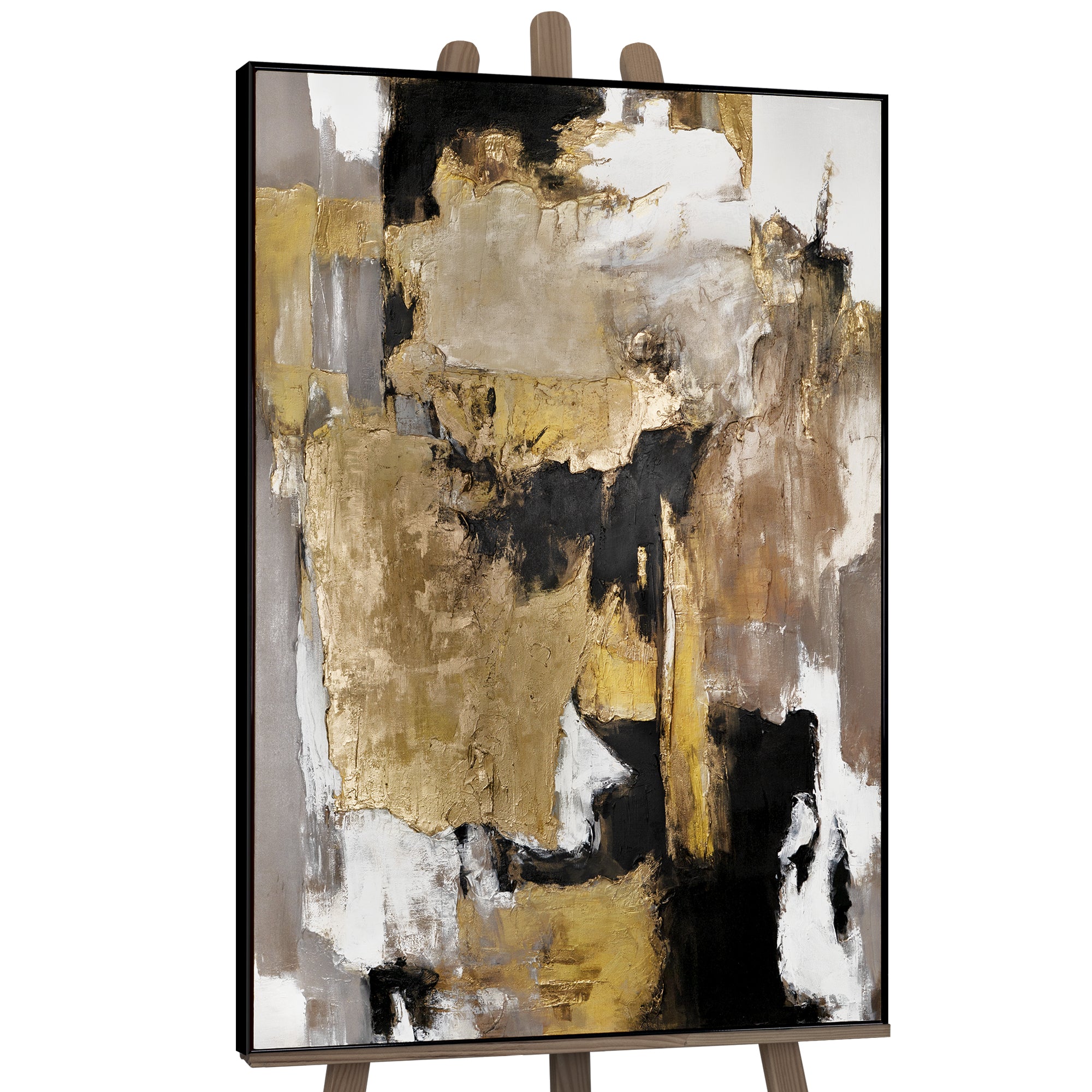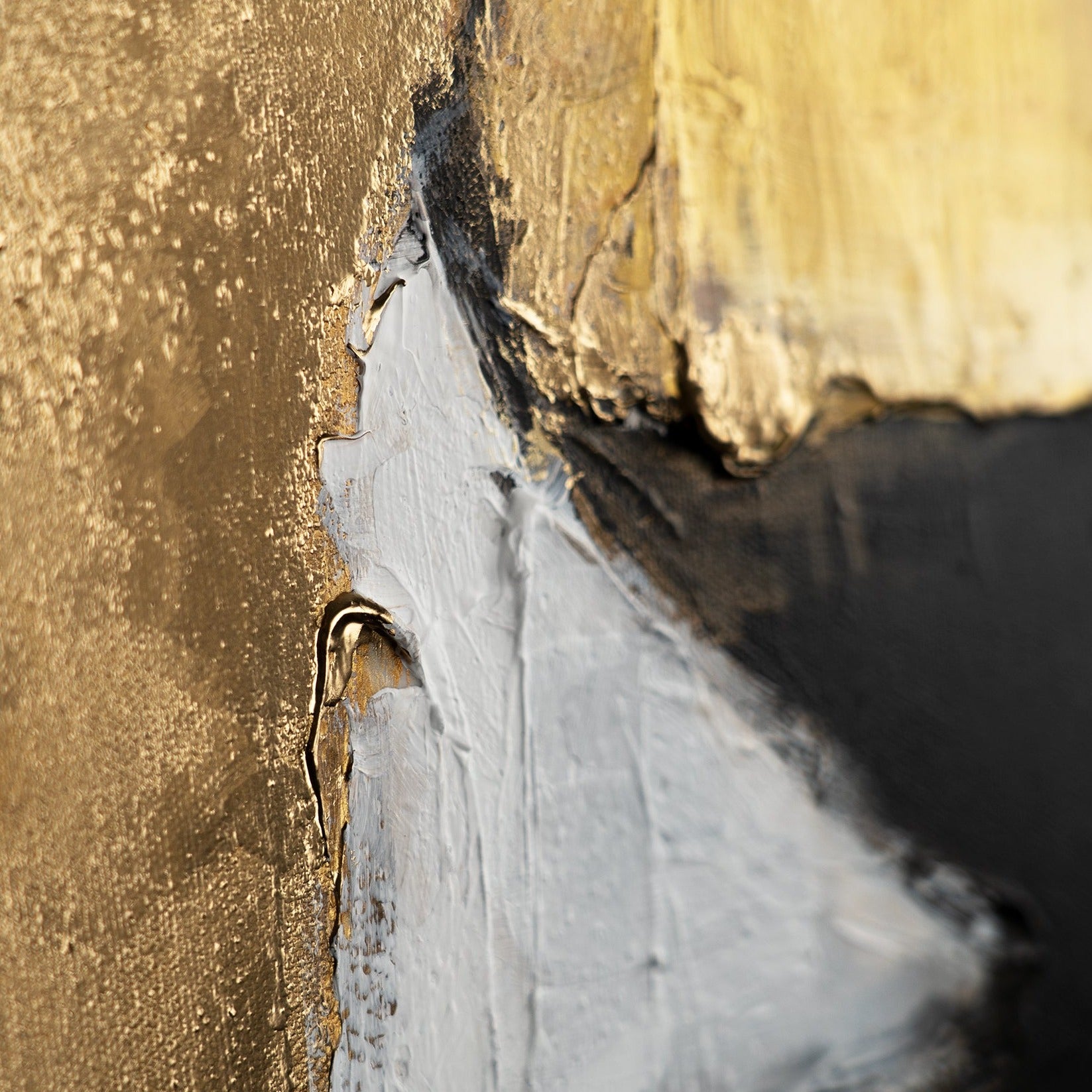 Bereichern Sie Ihr Zuhause oder Büro mit diesem eleganten, abstrakten Kunstwerk, das durch goldene und schwarze Töne eine moderne und dynamische Komposition darstellt. Das Bild besticht durch kräftige Kontraste und ausdrucksstarke Pinselstriche. Es ist 100% handgemalt und wird durch einen eleganten Rahmen hervorgehoben.