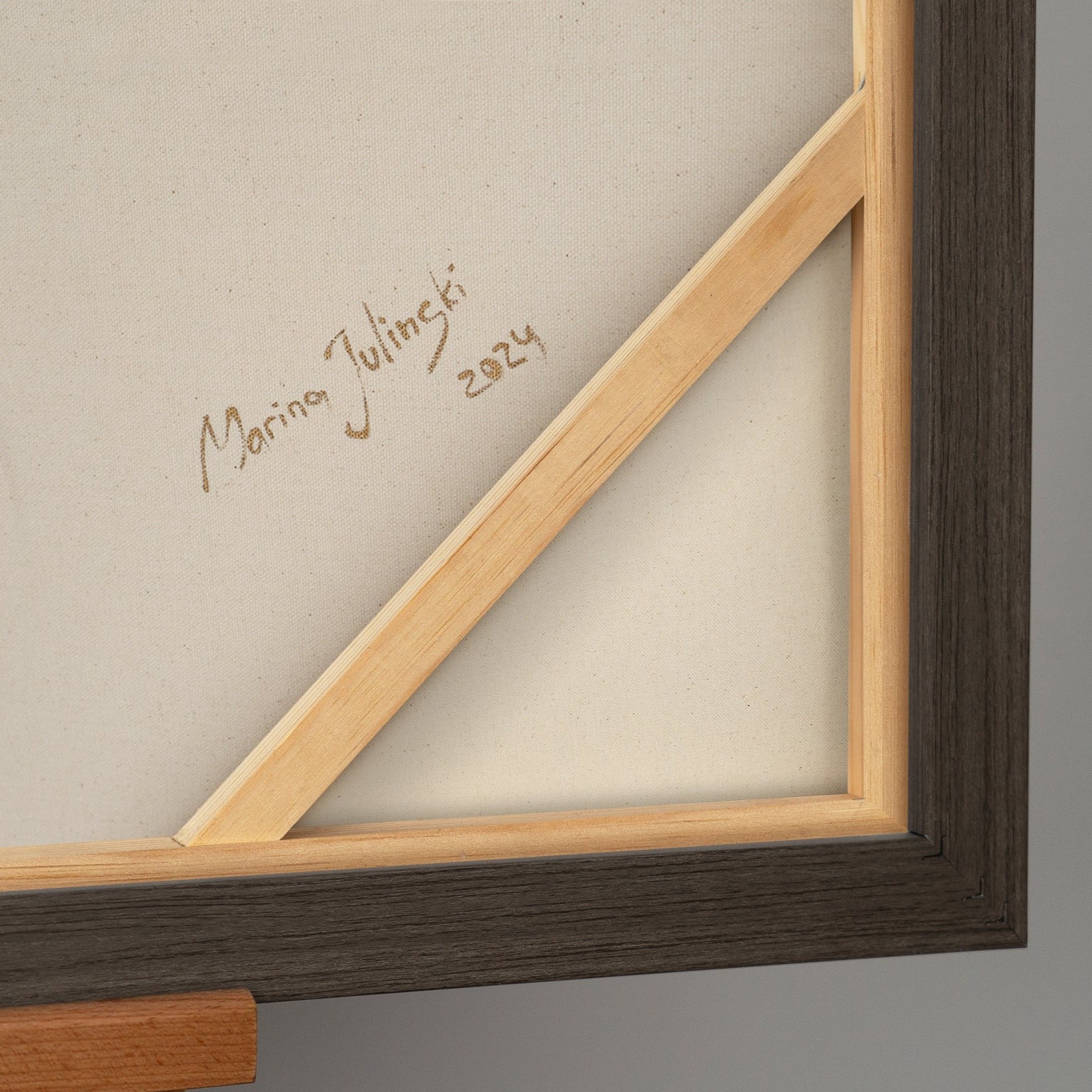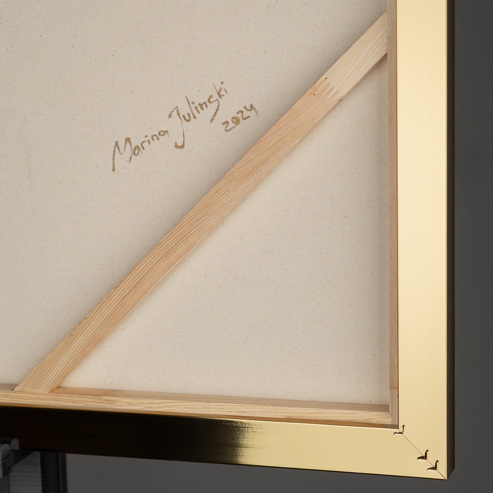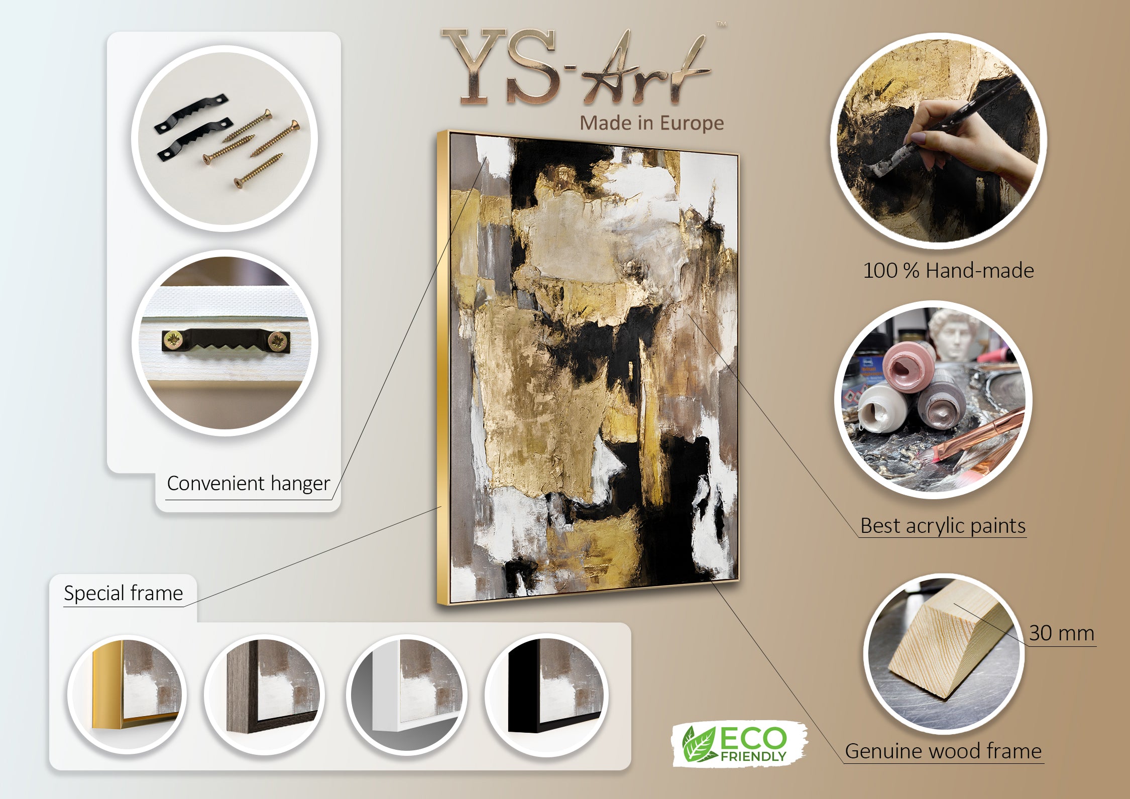 Bereichern Sie Ihr Zuhause oder Büro mit diesem eleganten, abstrakten Kunstwerk, das durch goldene und schwarze Töne eine moderne und dynamische Komposition darstellt. Das Bild besticht durch kräftige Kontraste und ausdrucksstarke Pinselstriche. Es ist 100% handgemalt und wird durch einen eleganten Rahmen hervorgehoben.