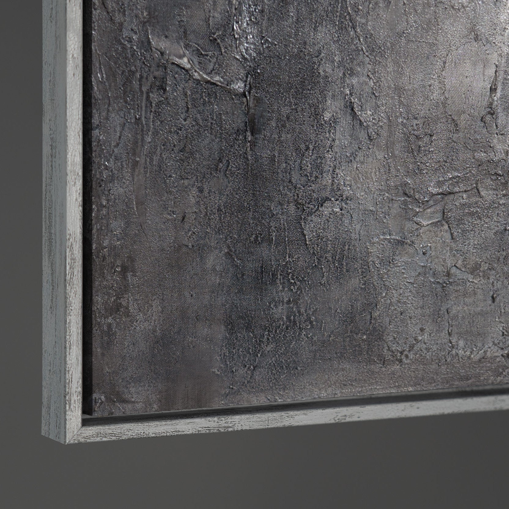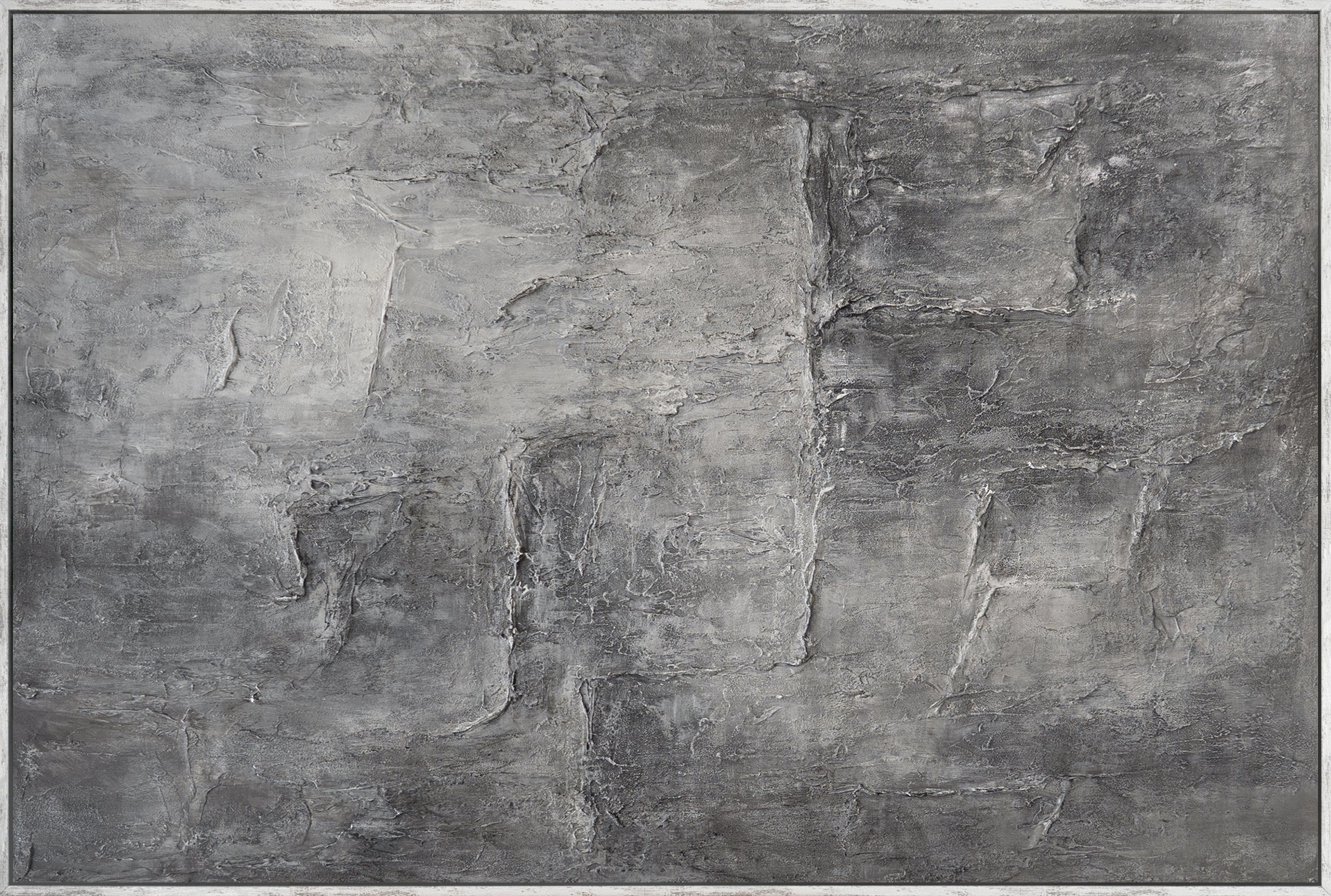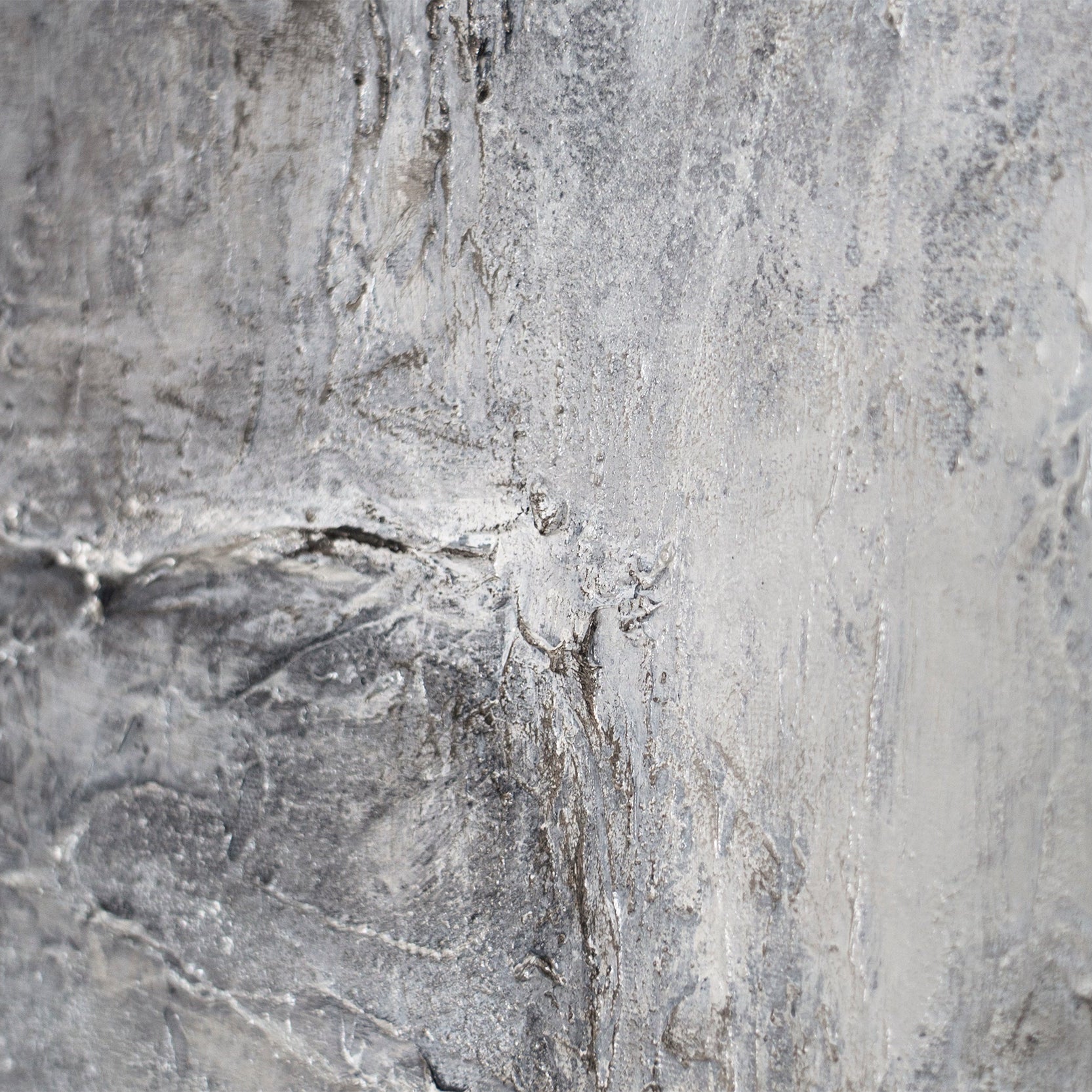 Cette peinture abstraite utilise une palette de gris multicouche et une texture prononcée, évoquant la pierre. Des surfaces irrégulières, des transitions subtiles et des structures délibérément visibles créent de la profondeur et un effet matériel apaisant. La surface rappelle les formations rocheuses naturelles, conférant à l'œuvre une présence sobre et intemporelle.