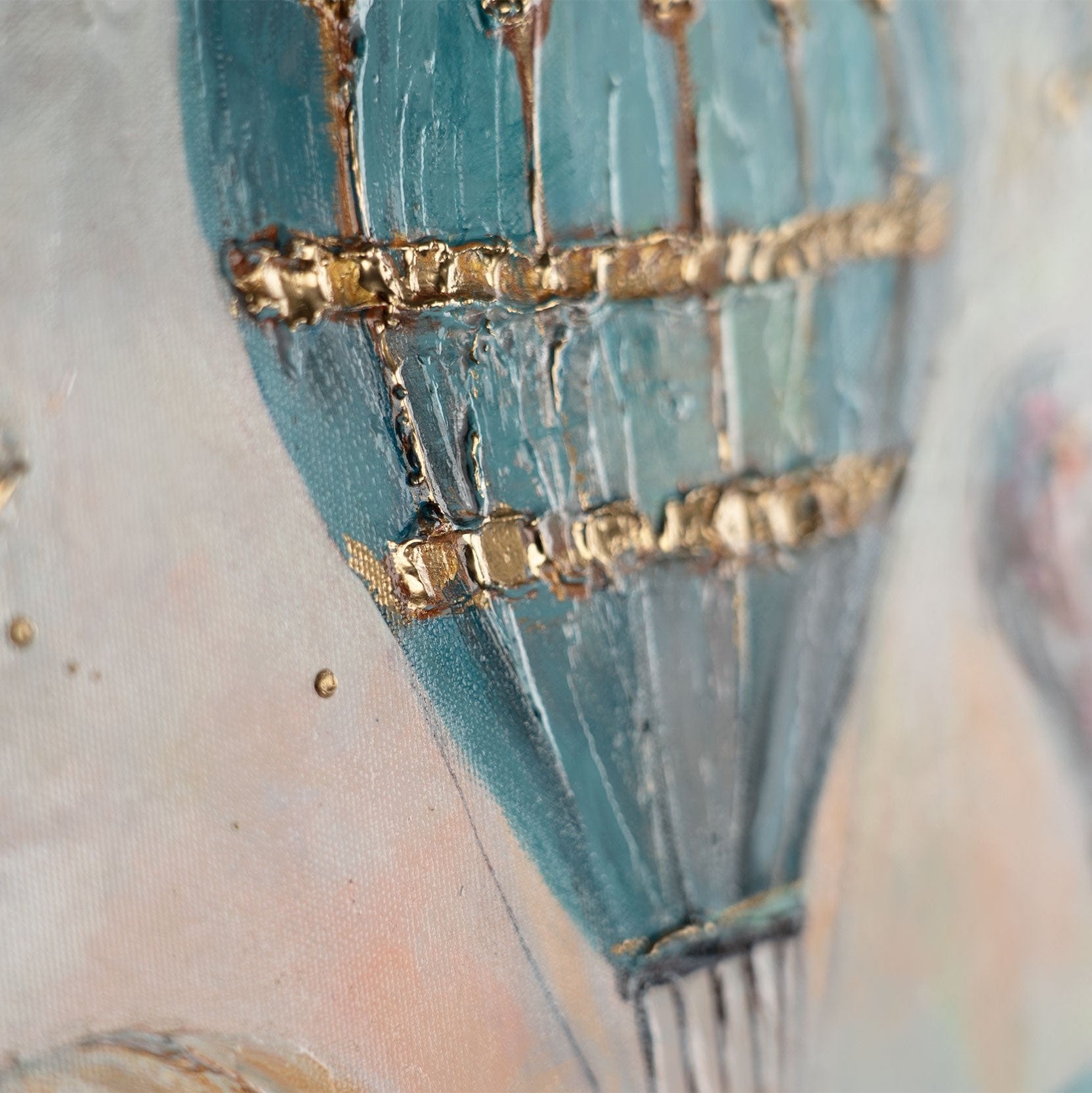 Das dreiteilige Leinwandbild „Luftige Träume“ ist ein bezauberndes Acryl-Triptychon, das mit sanften Pastelltönen und liebevollen Ballon-Motiven Kinder- und Babyzimmer in eine verträumte Atmosphäre taucht. Die handgemalte Struktur verleiht jedem der drei Teile eine lebendige Tiefe und betont die filigranen Details der Goldakzente und der flauschigen Wolkenlandschaft. Dieses Kunstwerk erzeugt ein Gefühl von Leichtigkeit und Geborgenheit, das perfekt für die Gestaltung von behaglichen Rückzugsorten für die Kleinsten ist.