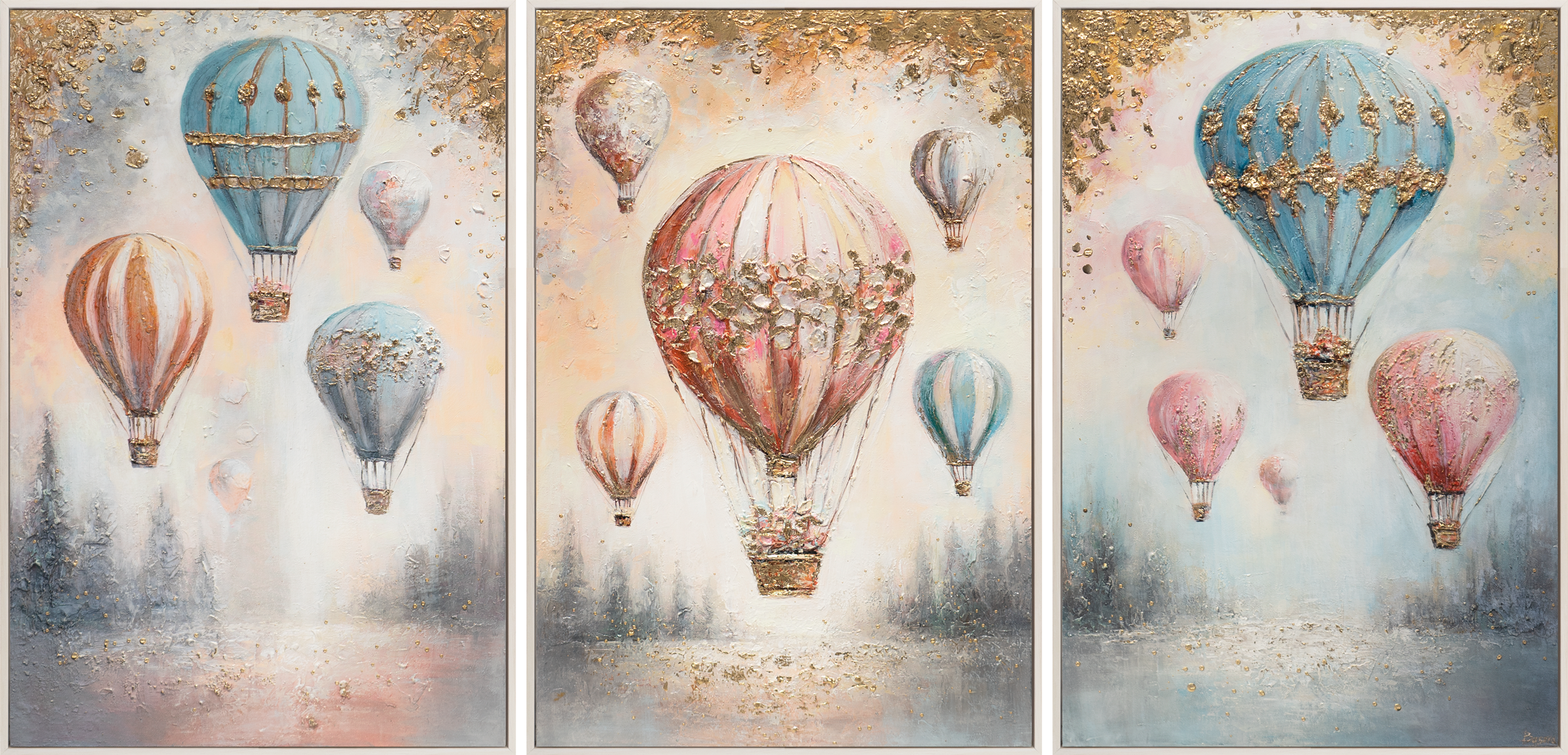 Abstrakte Acrylbild „Luftige Träume“ Triptychon auf Leinwand – Sanfte Ballon-Motive 180x120cm