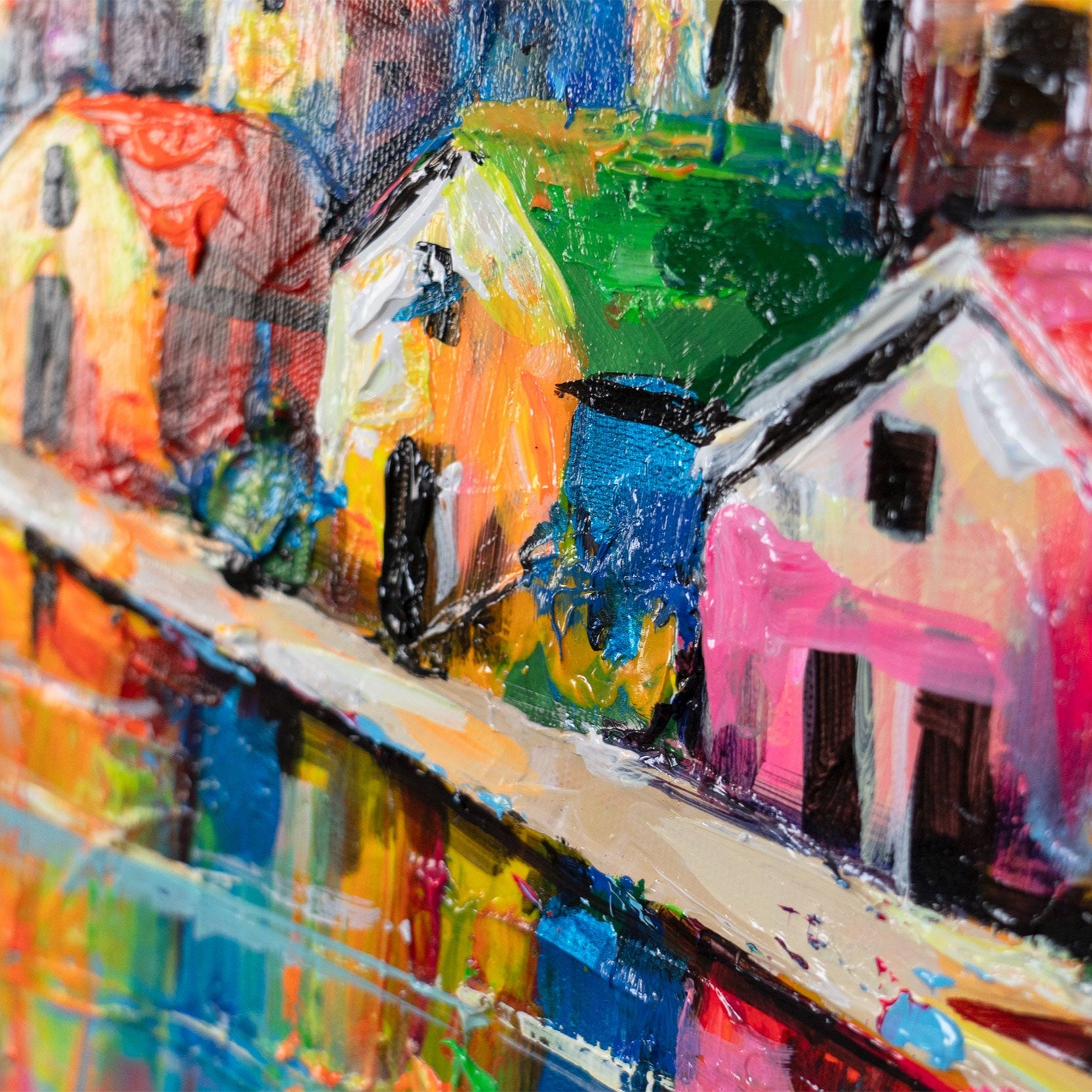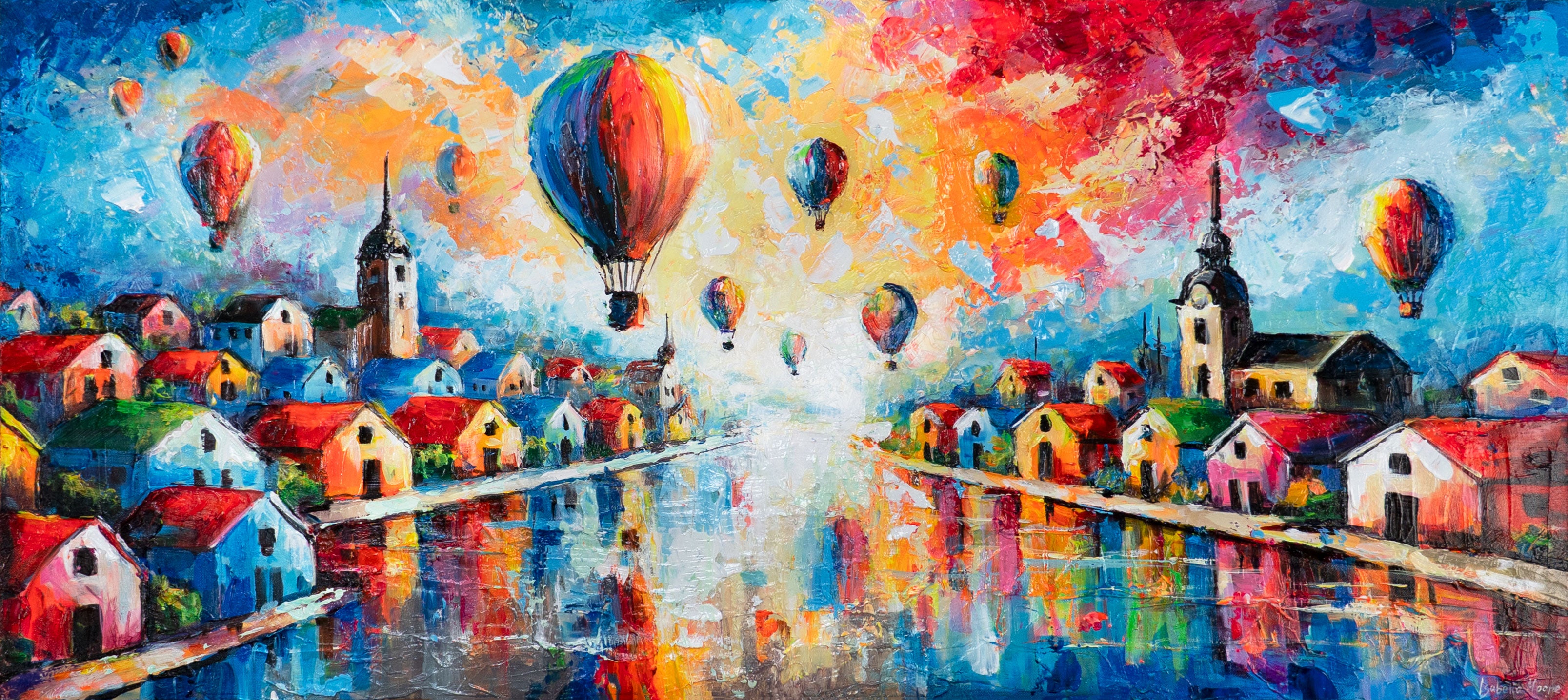 „Himmlische Entfernungen“ ist ein handgemaltes Acrylgemälde auf Leinwand, das eine farbenfrohe Stadtlandschaft mit bunten Häusern und schwebenden Ballons inszeniert. Expressive Pinselstriche und kräftige Farbfelder erzeugen Tiefe und dynamische Reflexionen.