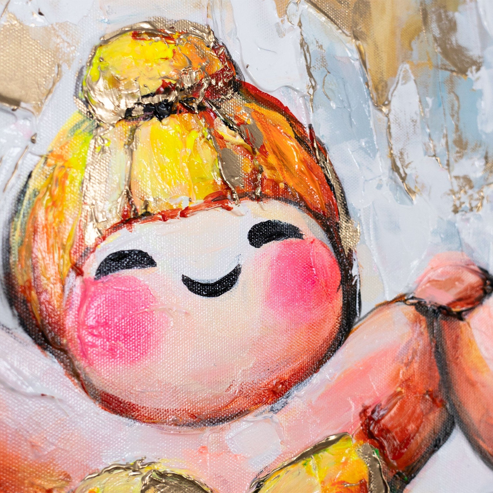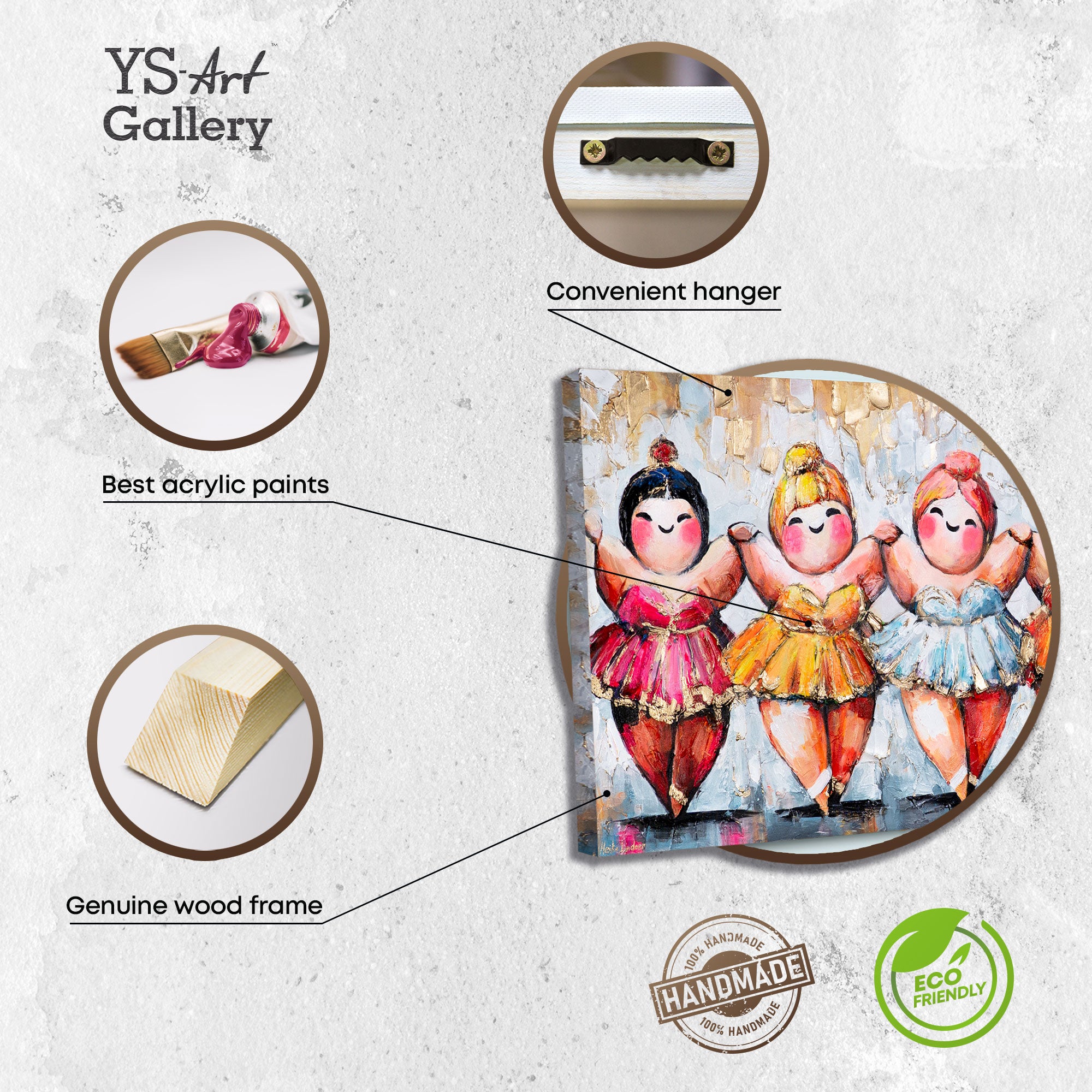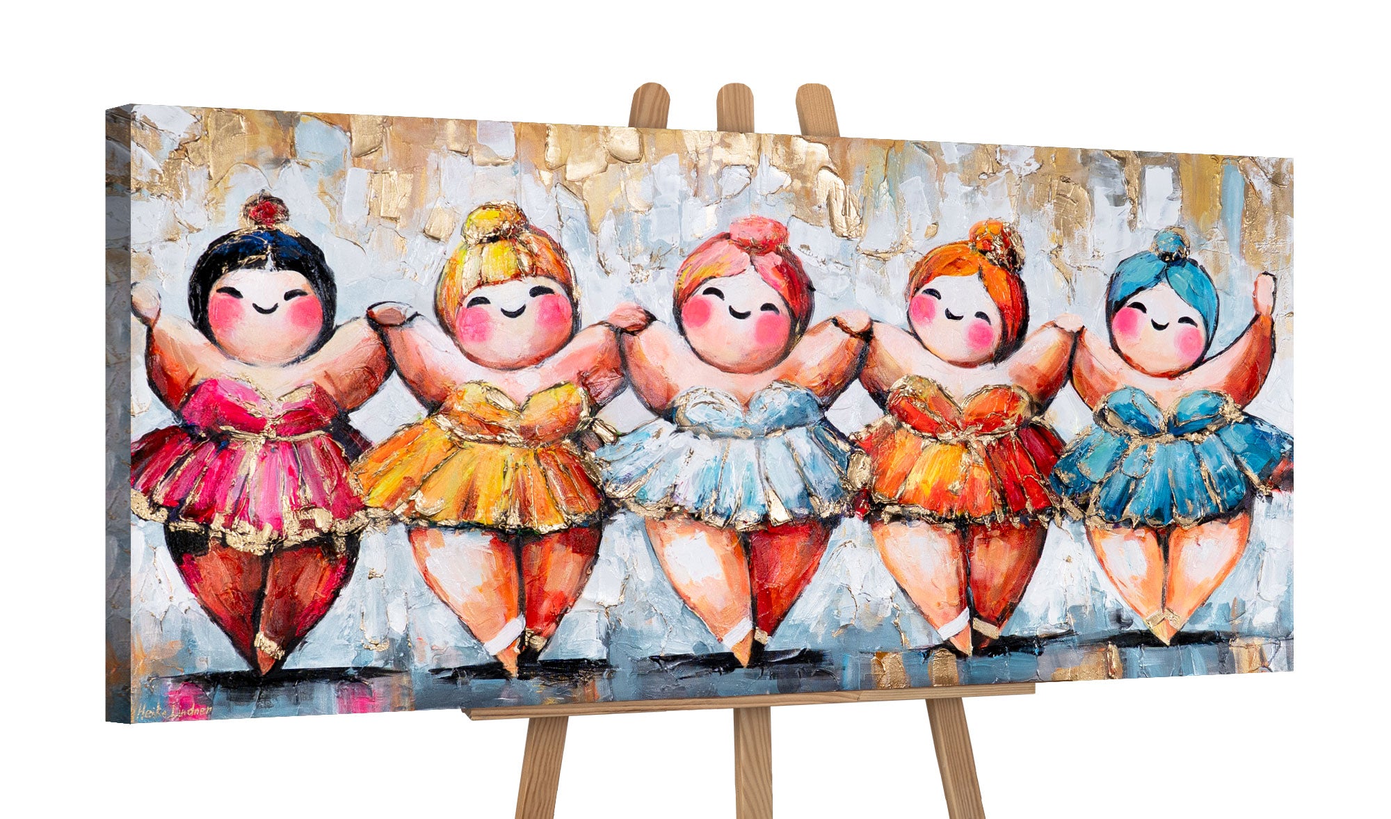„Helles Ensemble“ ist ein humorvolles, handgemaltes Acrylbild auf Leinwand, das fünf fröhliche Tänzerinnen in bunten Kleidern zeigt. Die lebendige Farbgebung in Rot, Gelb, Blau und Orange, kombiniert mit einer strukturierten Oberfläche, verleiht dem Gemälde eine charmante Energie und Leichtigkeit.