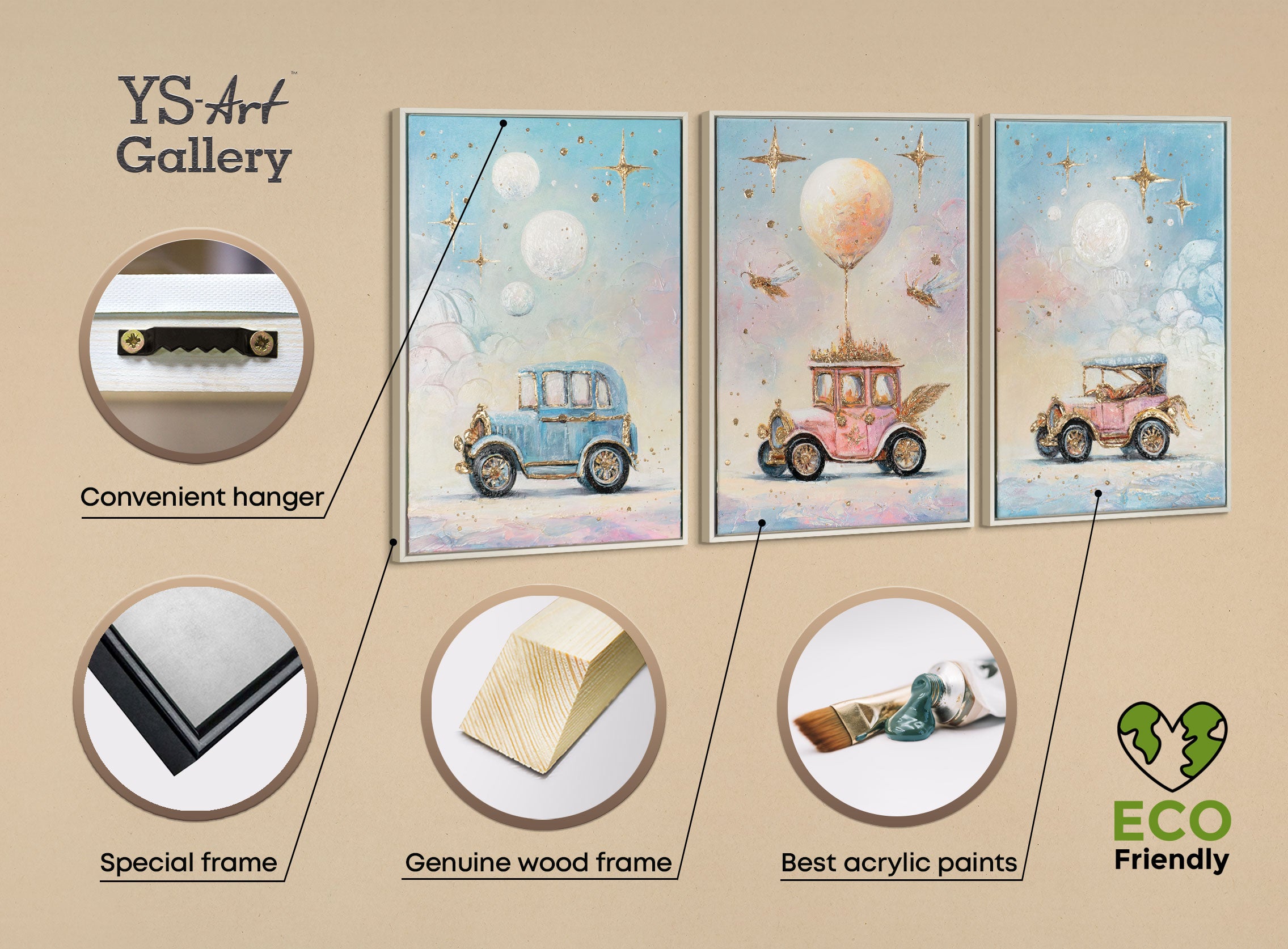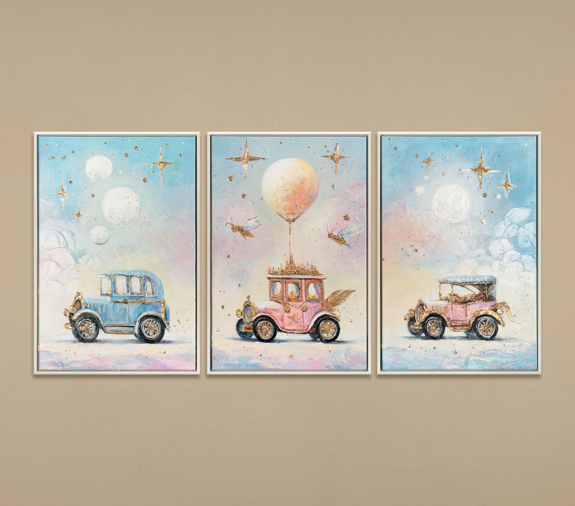 Verwandeln Sie das Kinderzimmer in einen märchenhaften Raum mit dieser einzigartigen handgemalten Wanddekoration. Dieses Triptychon zeigt drei Vintage-Autos in Pastelltönen und ist umgeben von einer himmlischen Kulisse voller Sterne und sanfter Wolken. Perfekt als Kinderzimmerdeko, um eine gemütliche und inspirierende Atmosphäre zu schaffen!