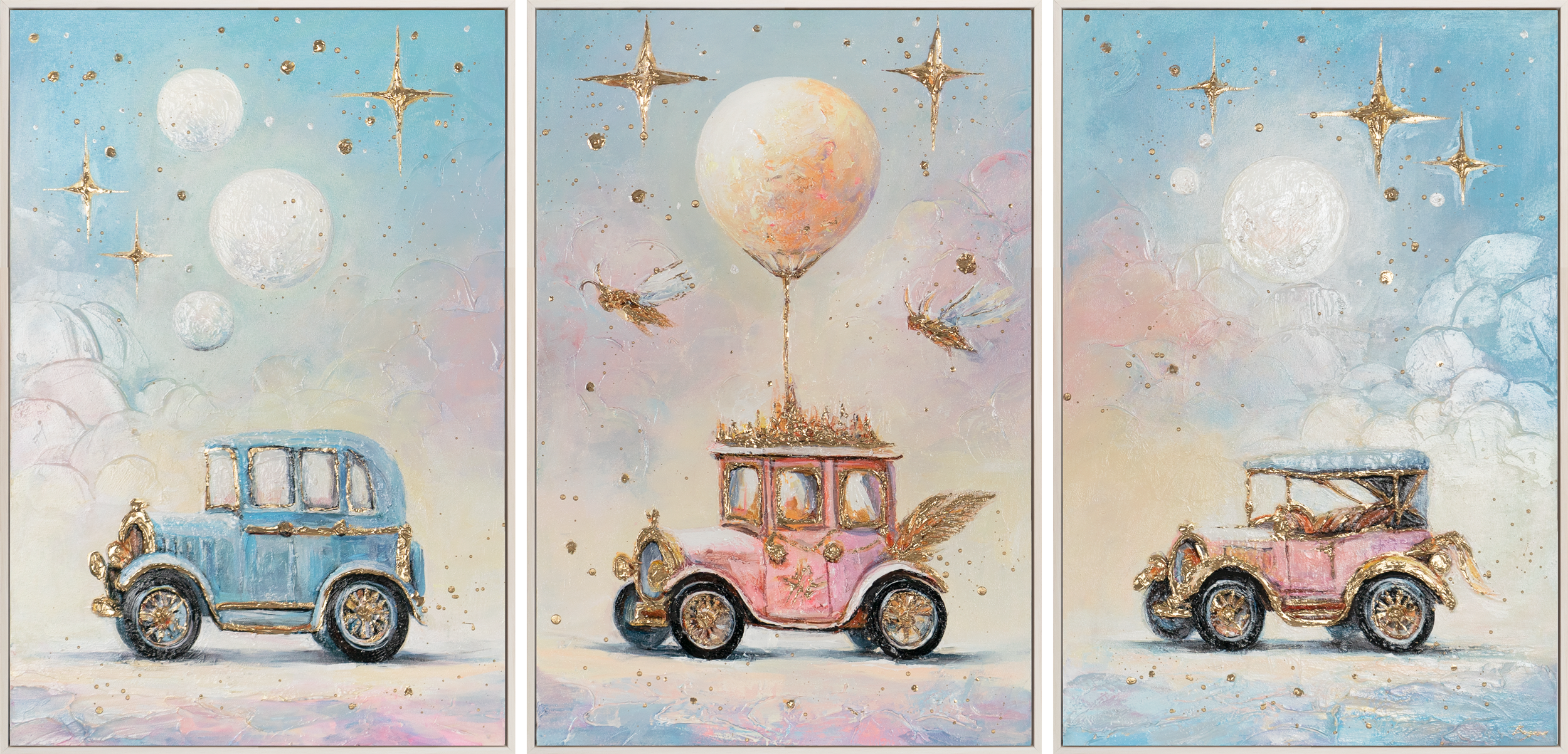 Das Triptychon „Märchenhafte Straße“ entführt in eine zauberhafte Fantasiewelt mit liebevoll gemalten, nostalgischen Autos und einem verträumten Himmel, der mit sanften Pastelltönen und goldenen Details glänzt. Jede der drei Leinwandtafeln fügt sich zu einer harmonischen Gesamtkomposition zusammen, die Geschichten erzählt und Kinderzimmer in magische Orte verwandelt. Die strukturierte Oberfläche und die warmen Farbakzente schaffen eine einzigartige Atmosphäre voller Geborgenheit und Fantasie.