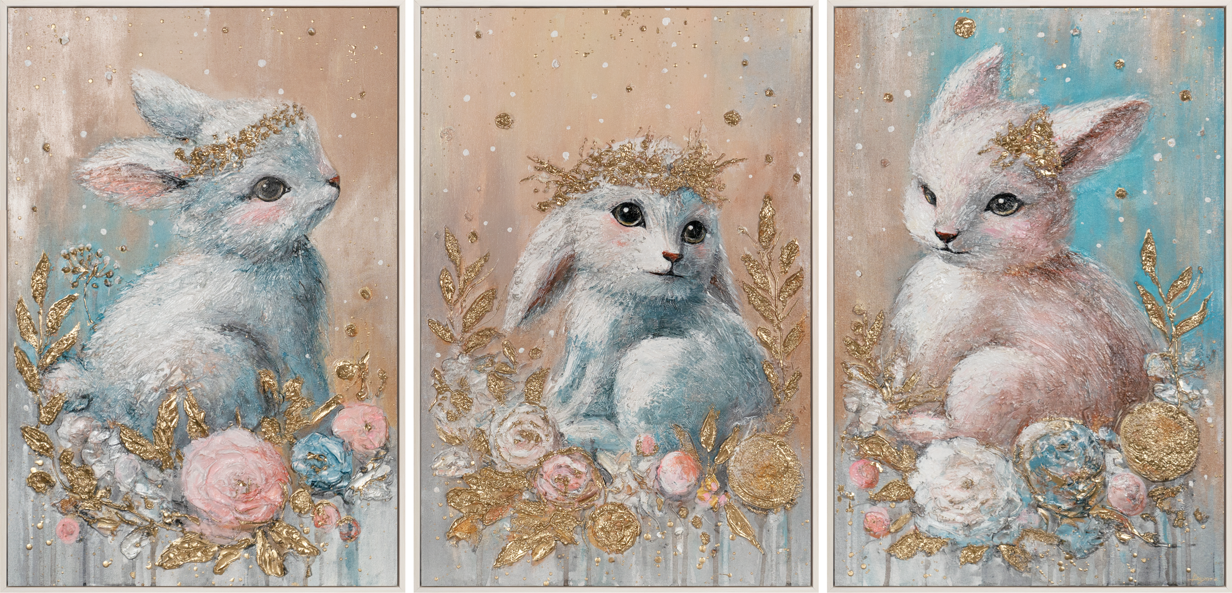 Das Triptychon „Waldkinder“ ist ein zauberhaftes Acryl Leinwandbild, das drei liebevoll gestaltete Motive von Waldtieren in sanften Pastellfarben zeigt. Die handgemalte, strukturierte Oberfläche unterstreicht die feinen Details der Waldkinder und verleiht dem Kunstwerk eine warme, einladende Atmosphäre. Dieses Original-Triptychon bringt eine märchenhafte Stimmung in jedes Kinderzimmer oder jeden ruhigen Wohnraum.