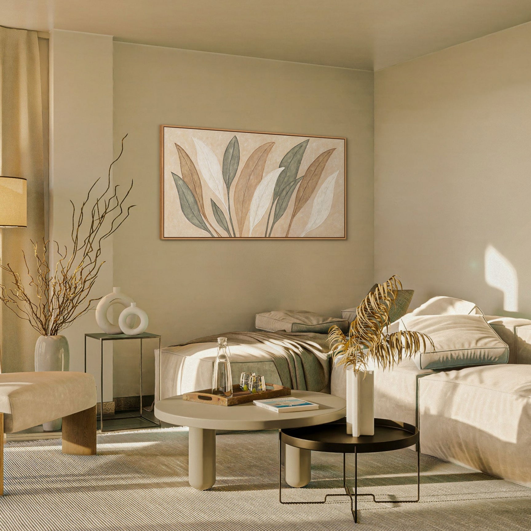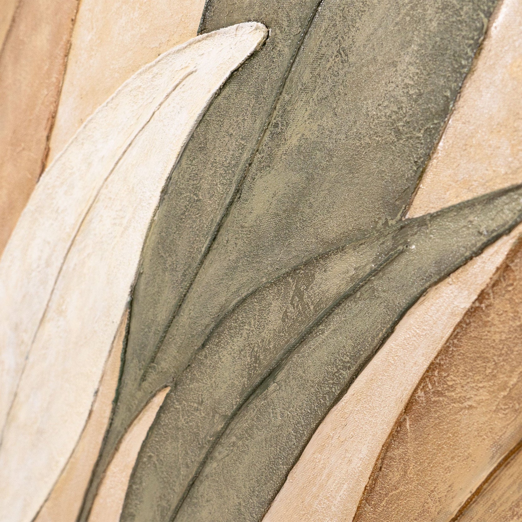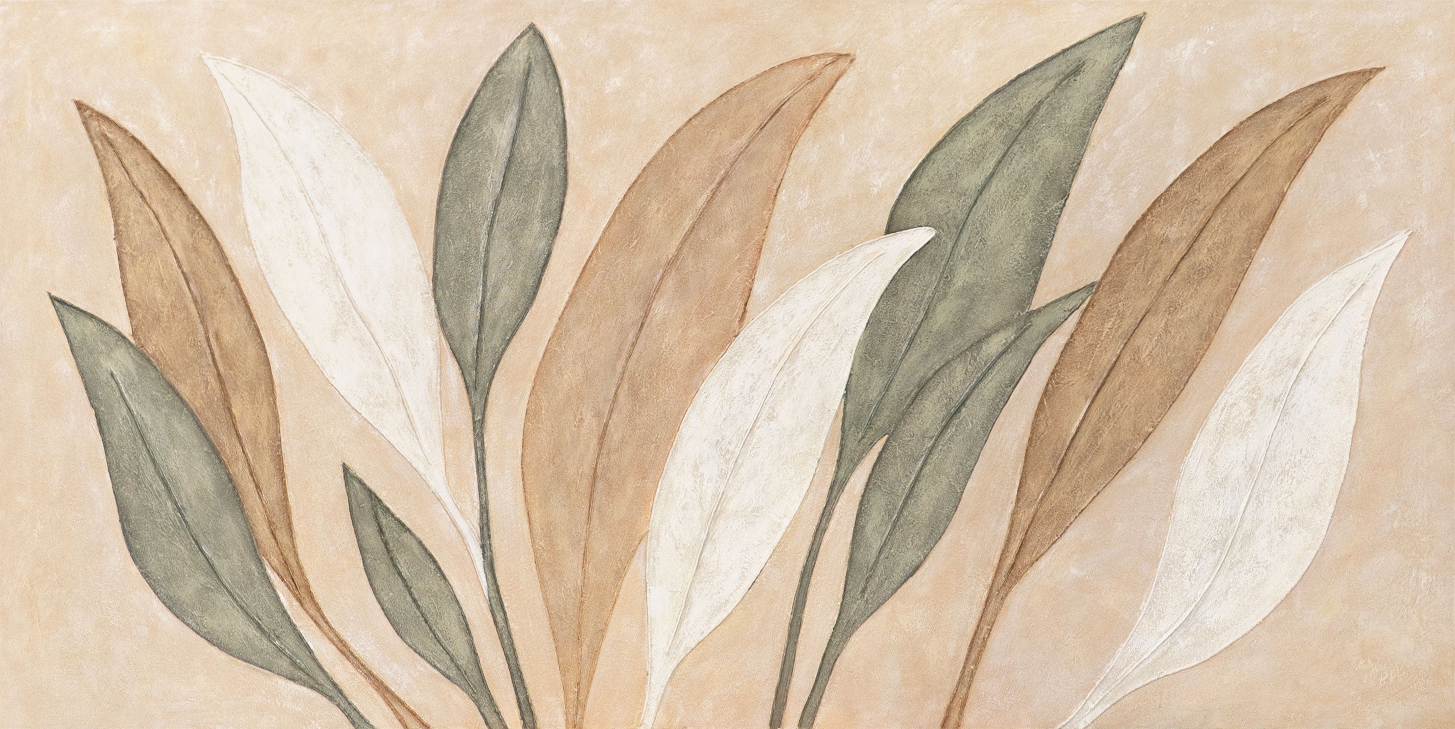Apportez la beauté de la nature dans votre intérieur avec cette peinture sur toile réalisée à la main, intitulée "Danse des Feuilles". Des tons doux de beige, brun et vert se mélangent harmonieusement avec des lignes nettes et une surface texturée. La composition élégante dégage calme et naturel, tandis que les formes organiques des feuilles diffusent une légèreté intemporelle.