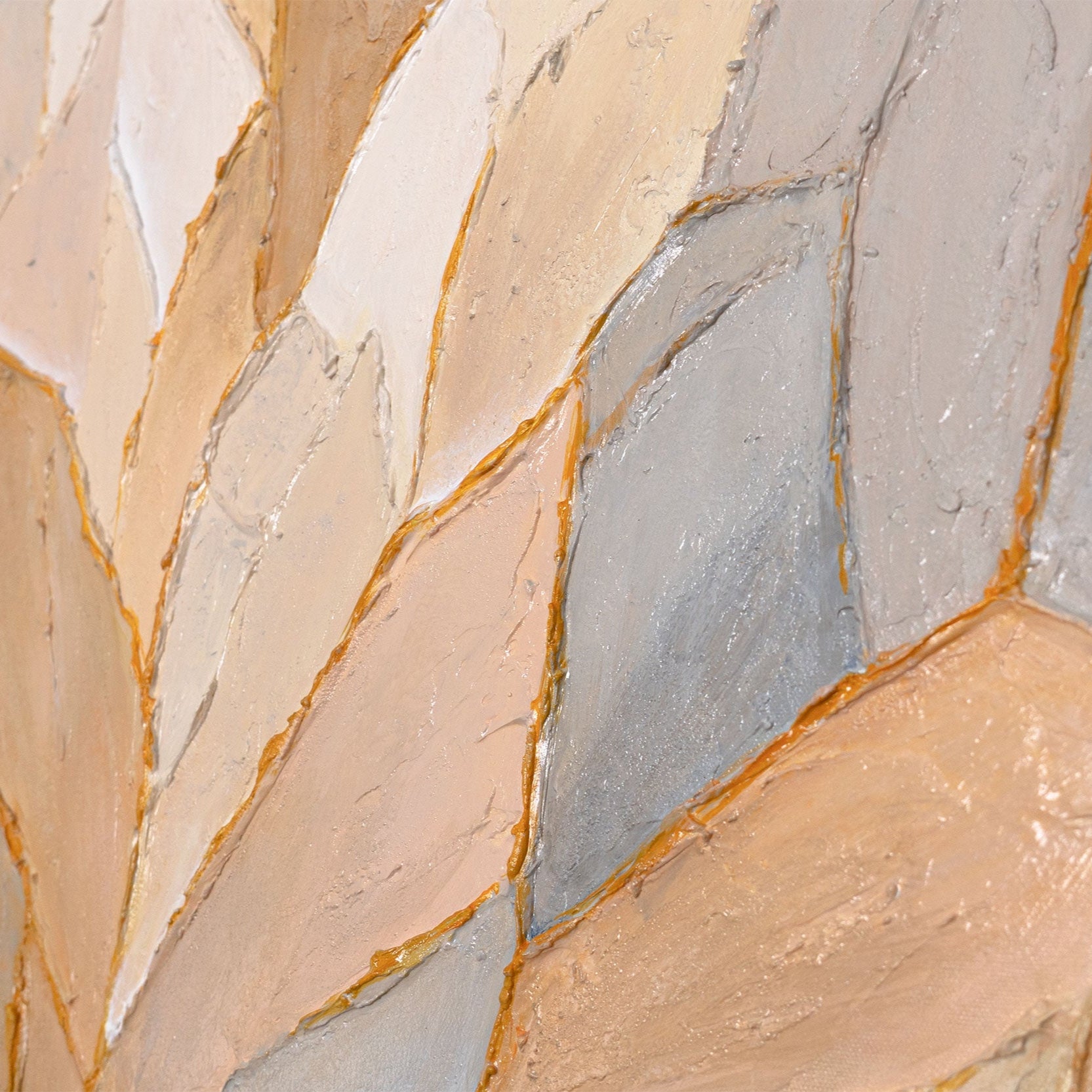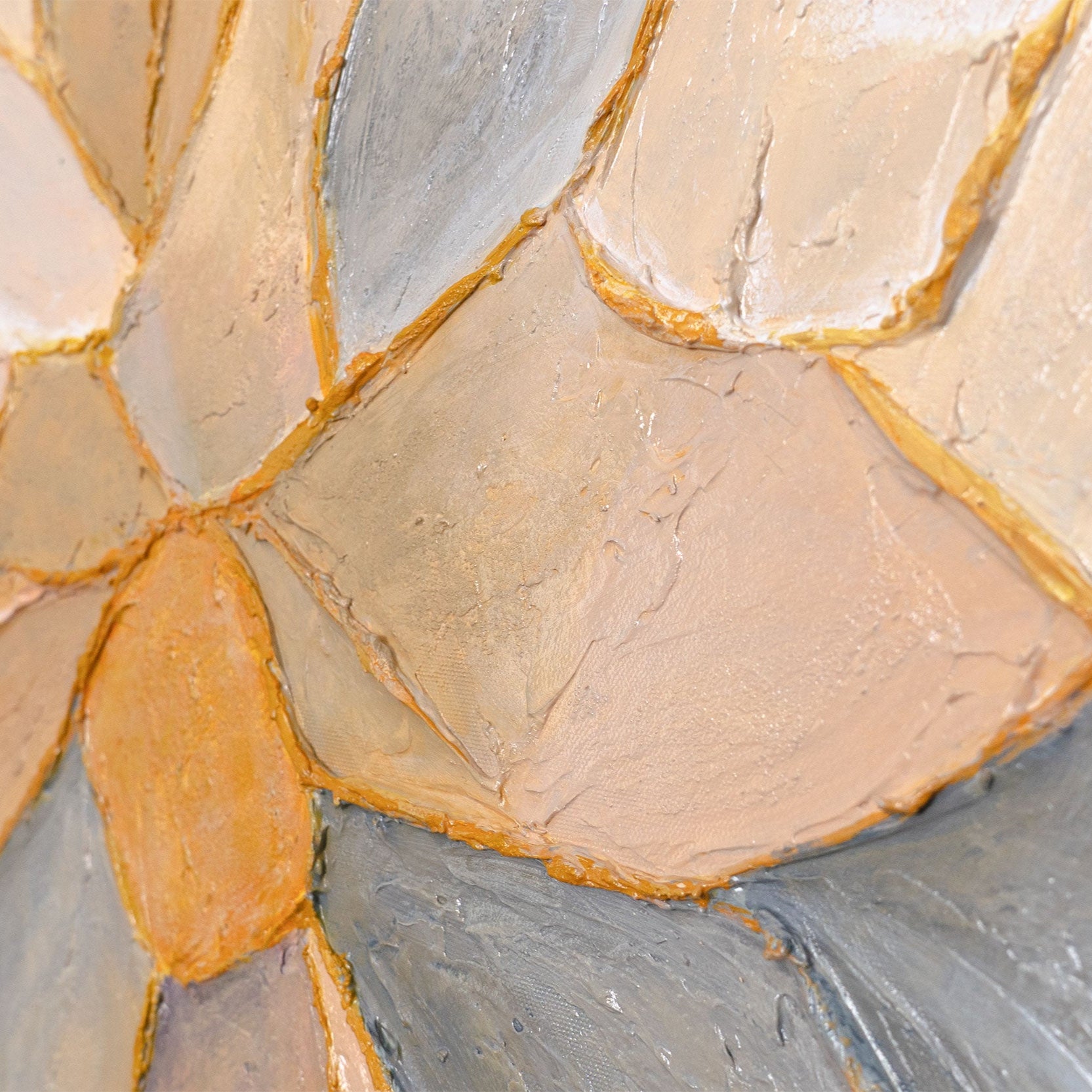 « Faces de pétales » est une peinture acrylique réalisée à la main qui capture la beauté des formes florales dans une interprétation abstraite et moderne. Des tons doux de beige et de gris, entrelacés de touches dorées, créent un jeu harmonieux qui respire l'élégance et la sérénité. La texture en relief ajoute profondeur et dynamisme, permettant à l'œuvre de déployer pleinement son impact dans n'importe quelle pièce.