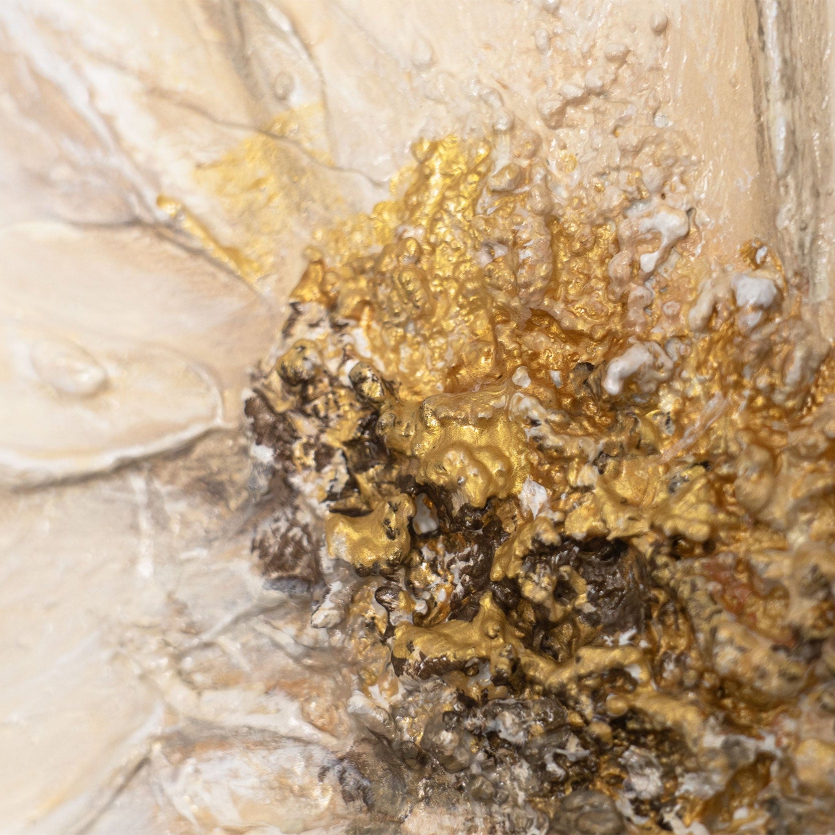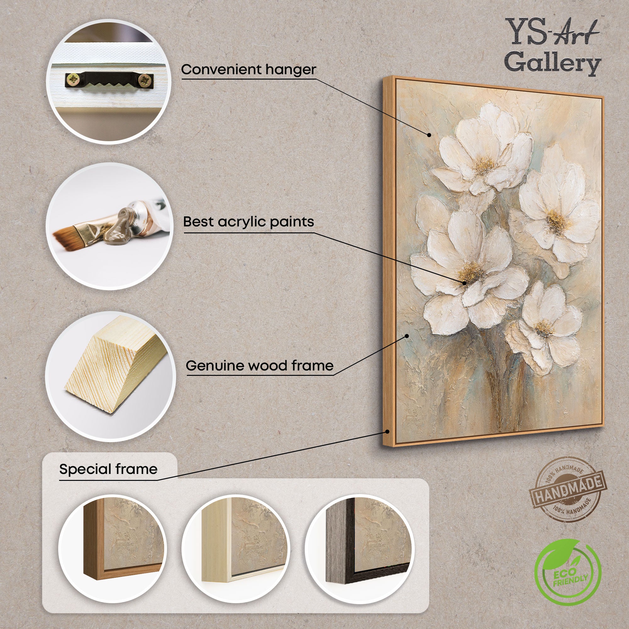« Voile de Tendresse » est une peinture acrylique réalisée à la main, qui enchante par ses délicates fleurs blanches se détachant sur un fond beige chaleureux. La texture en relief des pétales leur confère un réalisme saisissant et une profondeur raffinée. De subtils dégradés de couleurs, entre crème, beige et or, créent une ambiance harmonieuse et sereine.