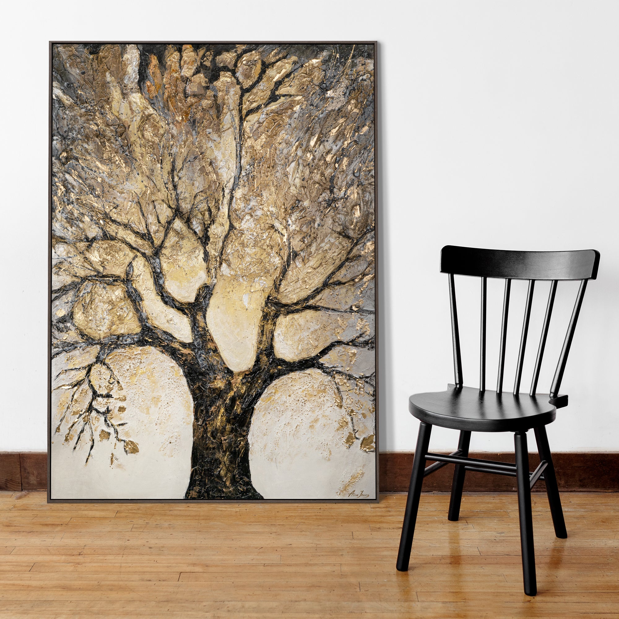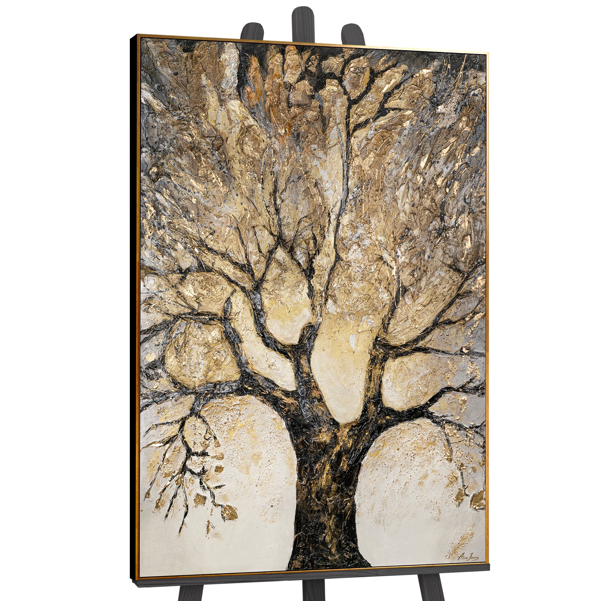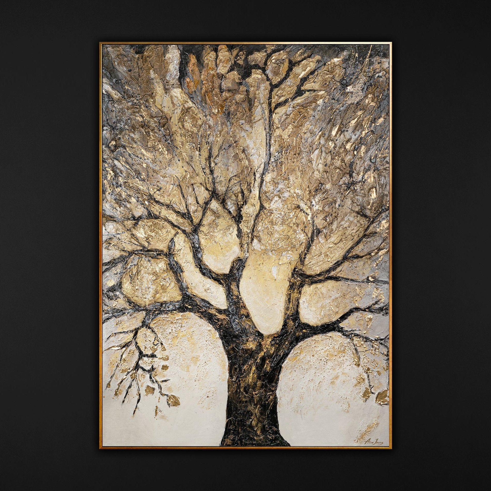 Dieses atemberaubende Acrylgemälde zeigt einen majestätischen Lebensbaum, der mit goldenen Akzenten veredelt wurde. Die kunstvoll gearbeiteten Texturen und die Kombination aus Schwarz und Gold machen dieses Werk zu einem perfekten Blickfang für jede moderne Einrichtung.