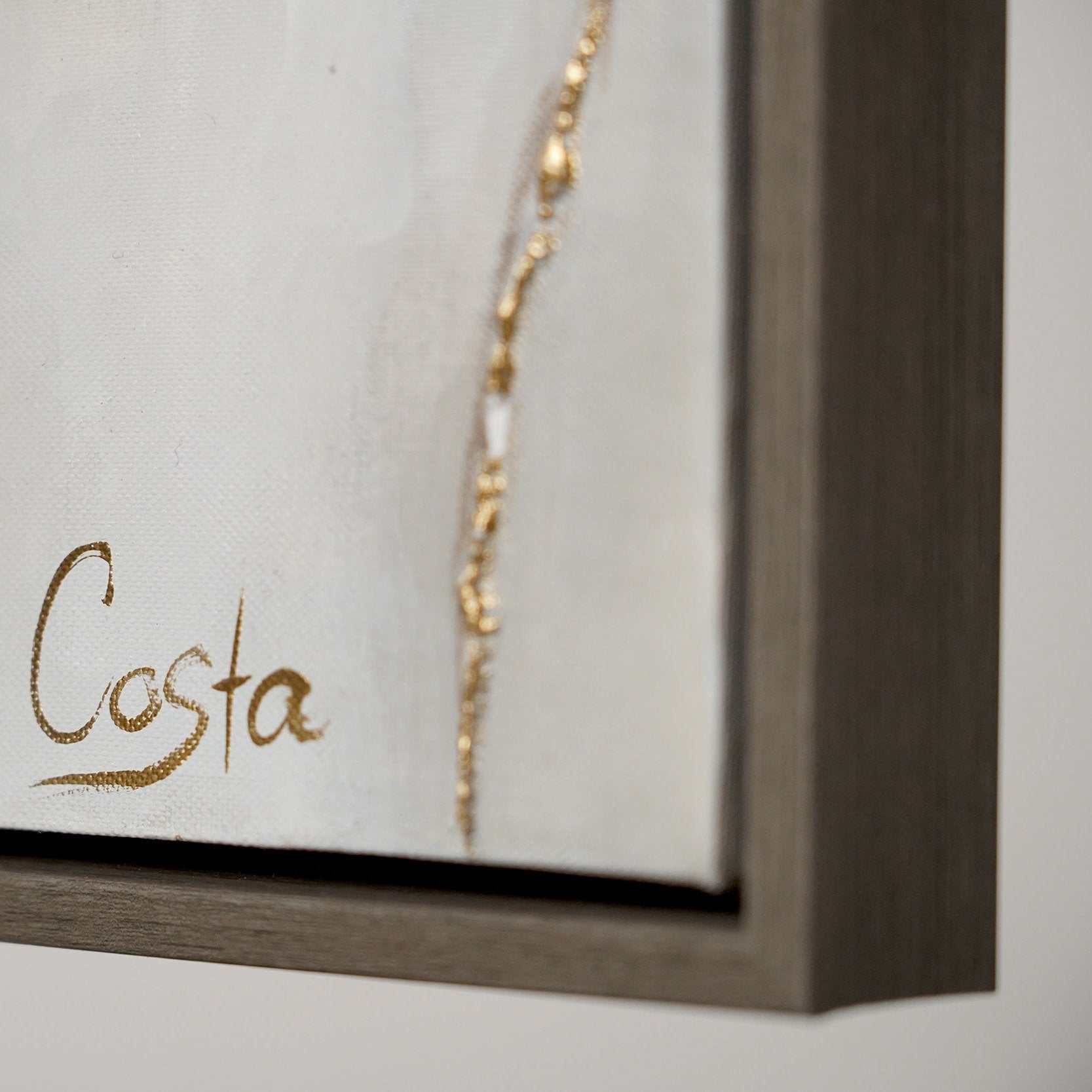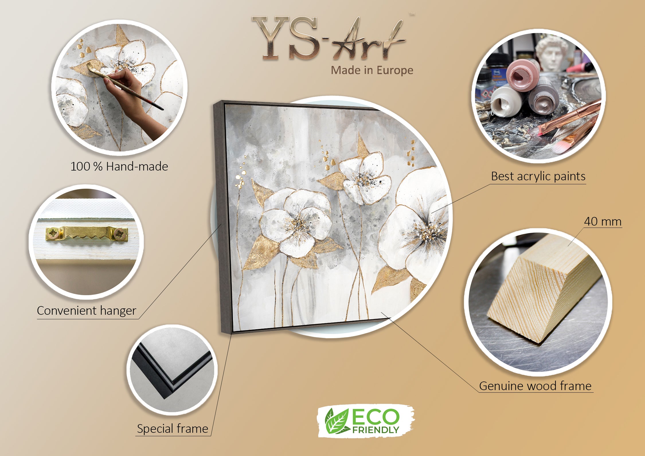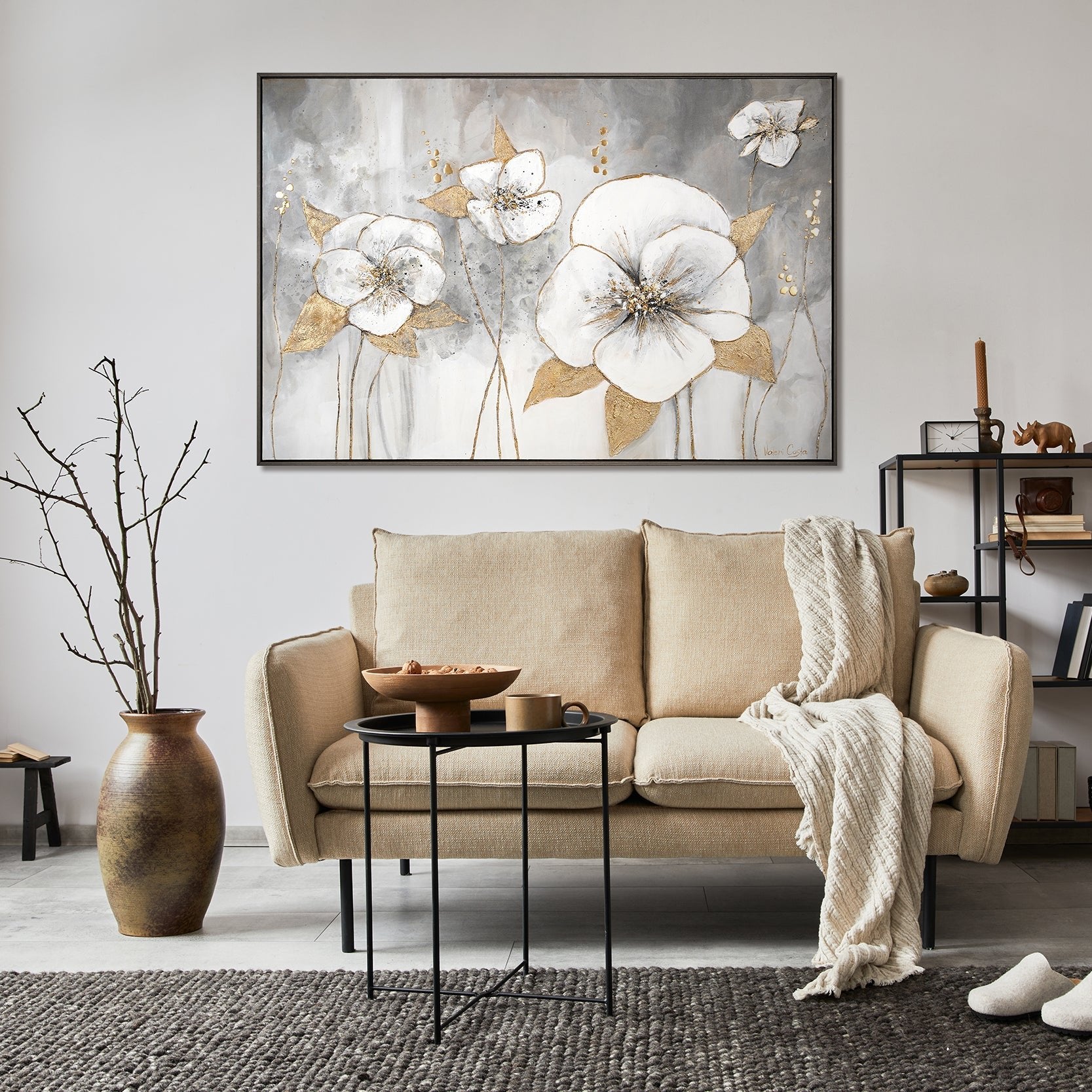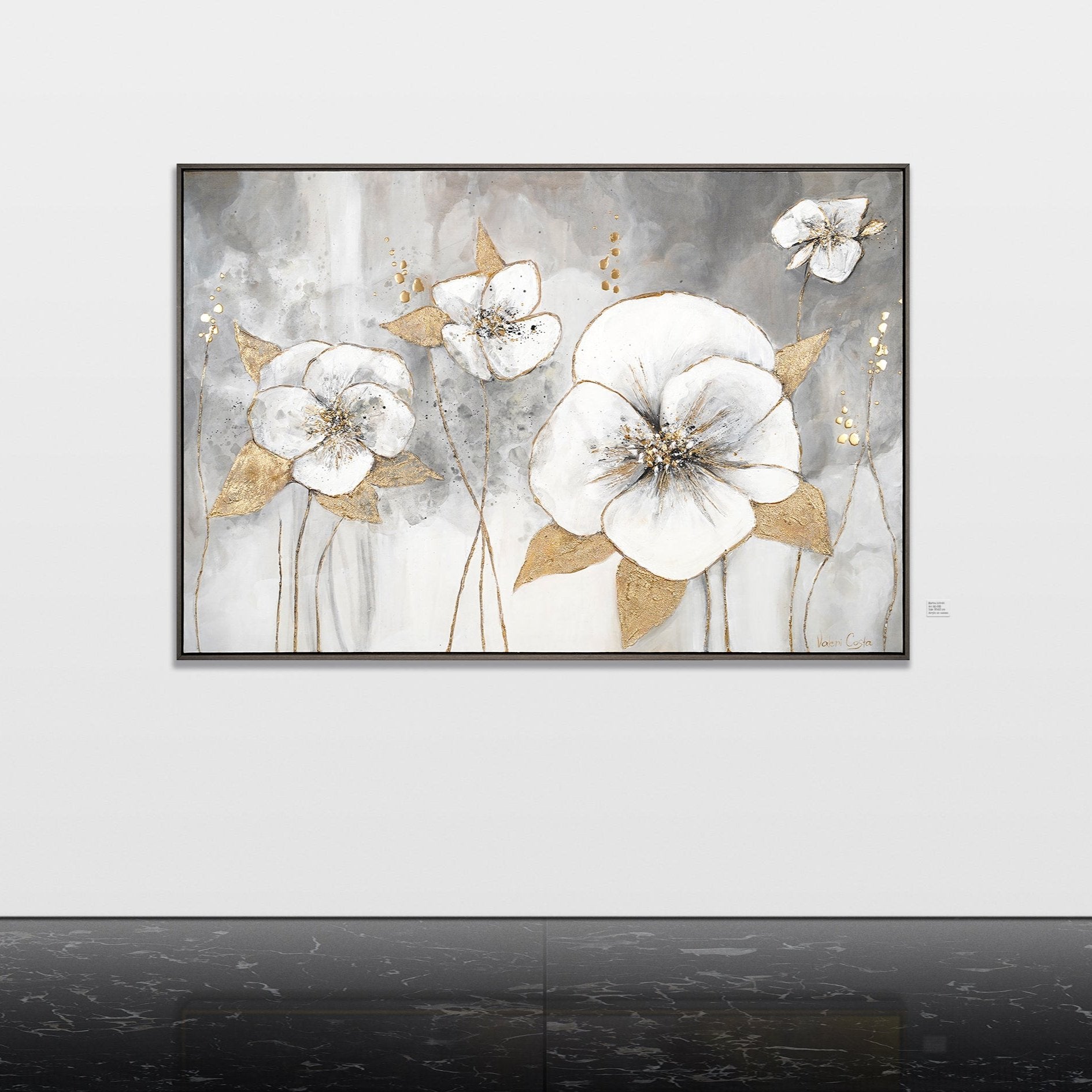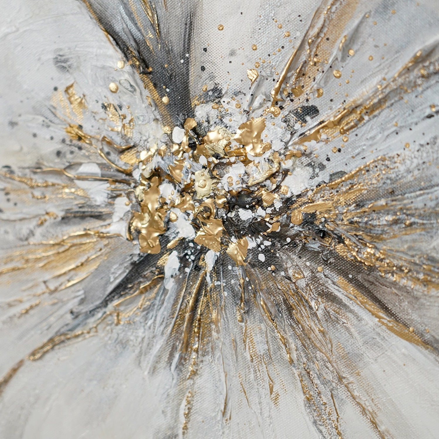 'Zarte Goldblüten' ist ein handgemaltes Acrylgemälde, das mit seiner subtilen Eleganz und den sanften Grau- und Goldtönen jede Wohnraumdekoration bereichert.
