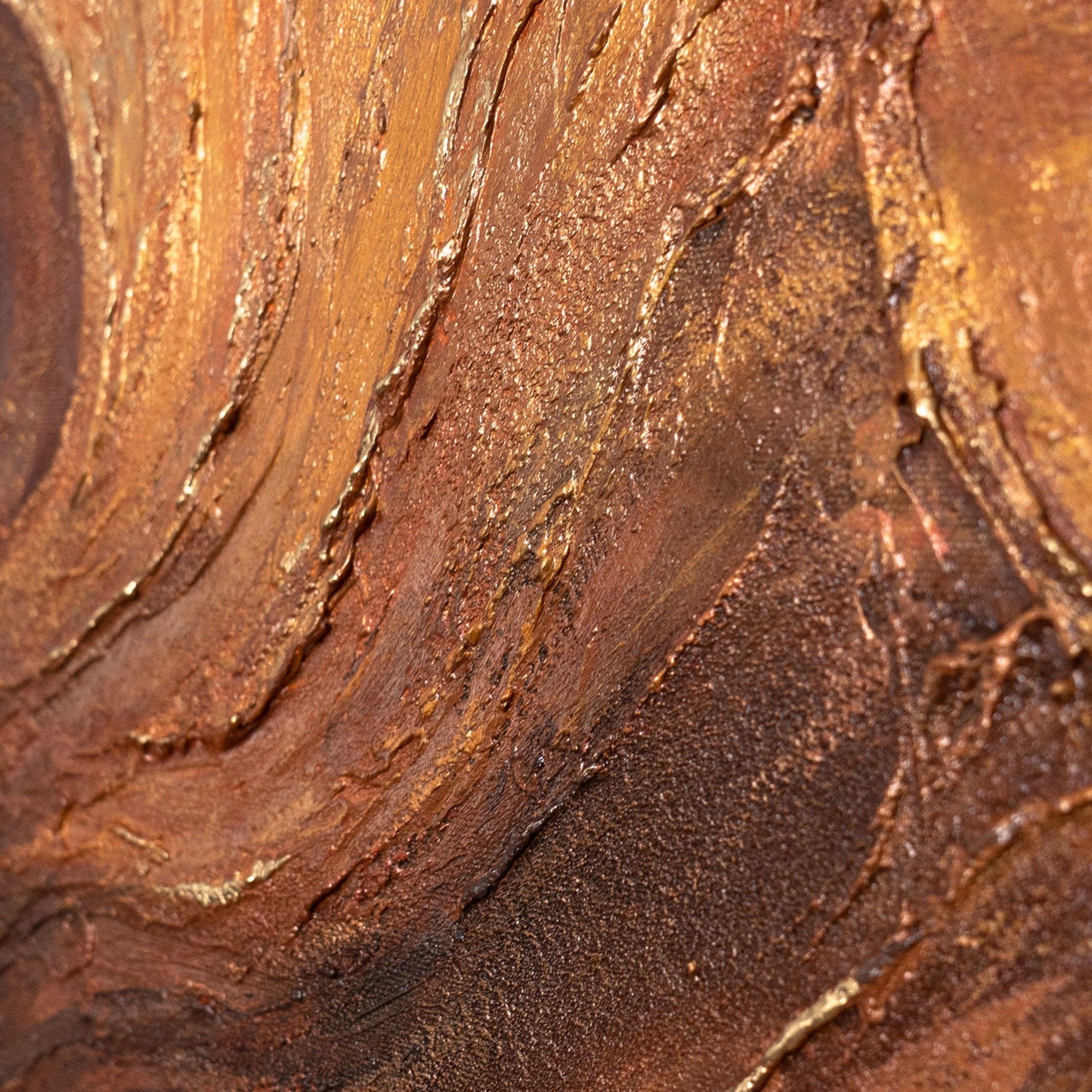 « Ruisseaux d’ambre » allie chaleur, mouvement et élégance. Cette œuvre originale peinte à la main apporte une touche d’exclusivité à toute pièce grâce à sa texture et à l’intensité de ses couleurs.