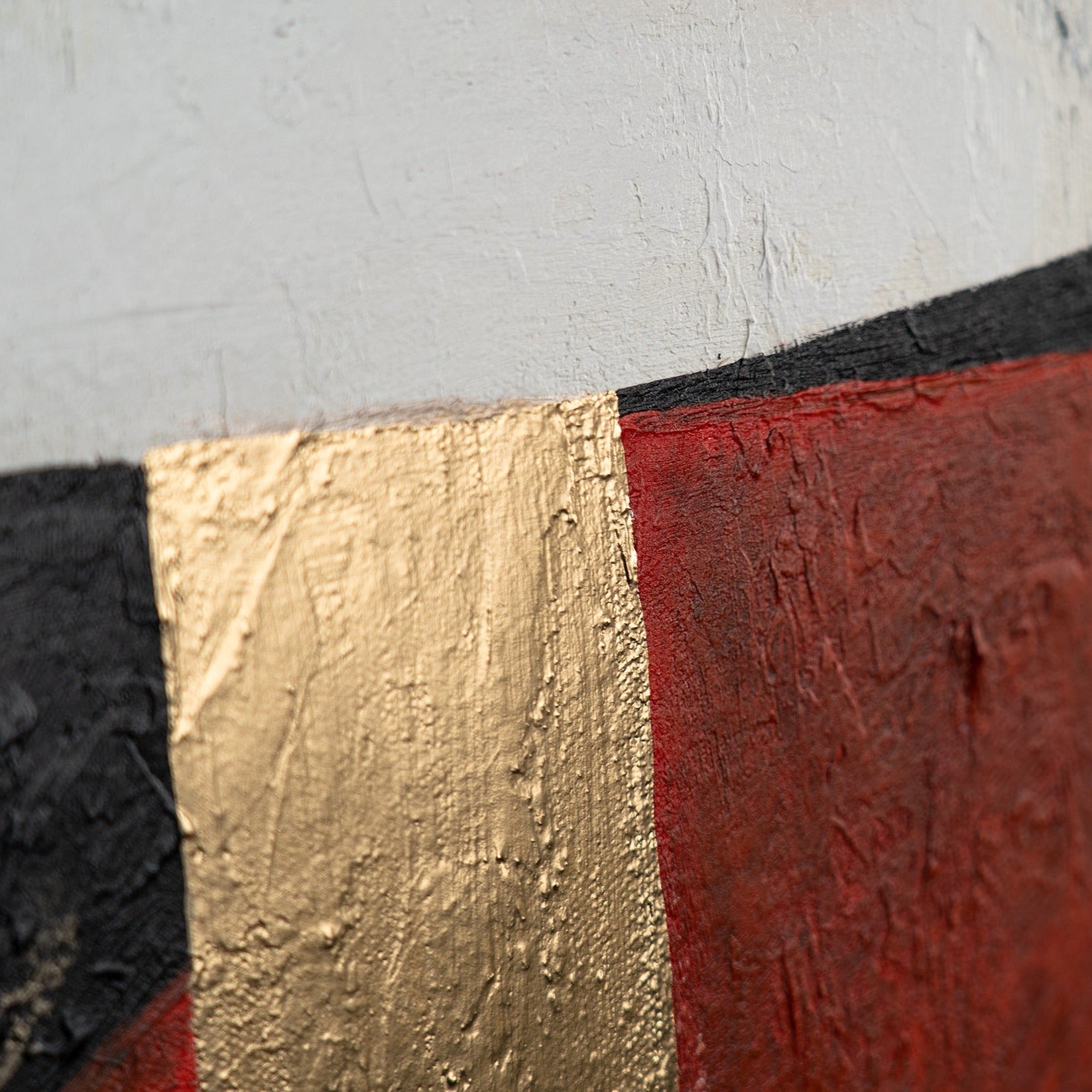 Bereichern Sie Ihr Zuhause oder Büro mit diesem farbenfrohen, abstrakten Kunstwerk, das durch Rot-, Gold- und Schwarztöne eine moderne Komposition darstellt. Das Bild besticht durch kräftige Kontraste und ausdrucksstarke Pinselstriche. Es ist 100% handgemalt und wird durch einen eleganten Rahmen hervorgehoben.