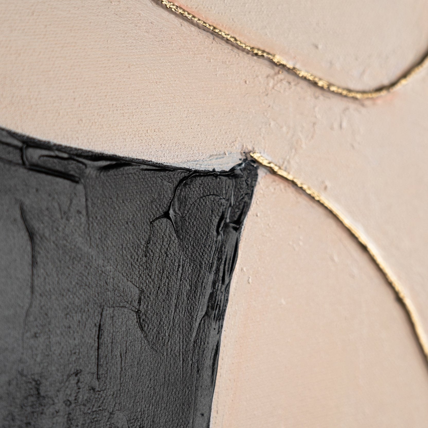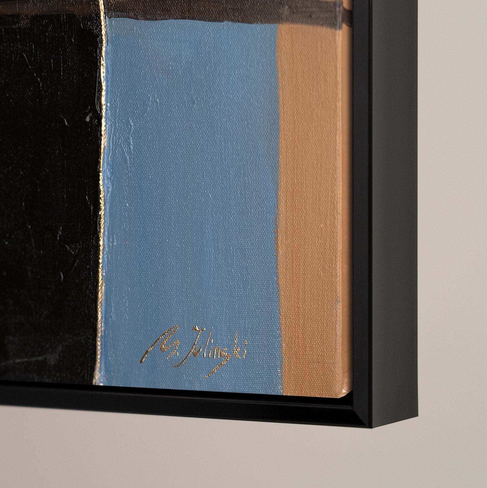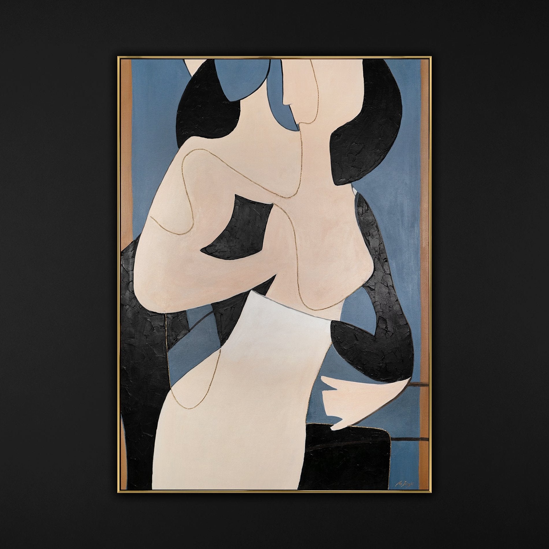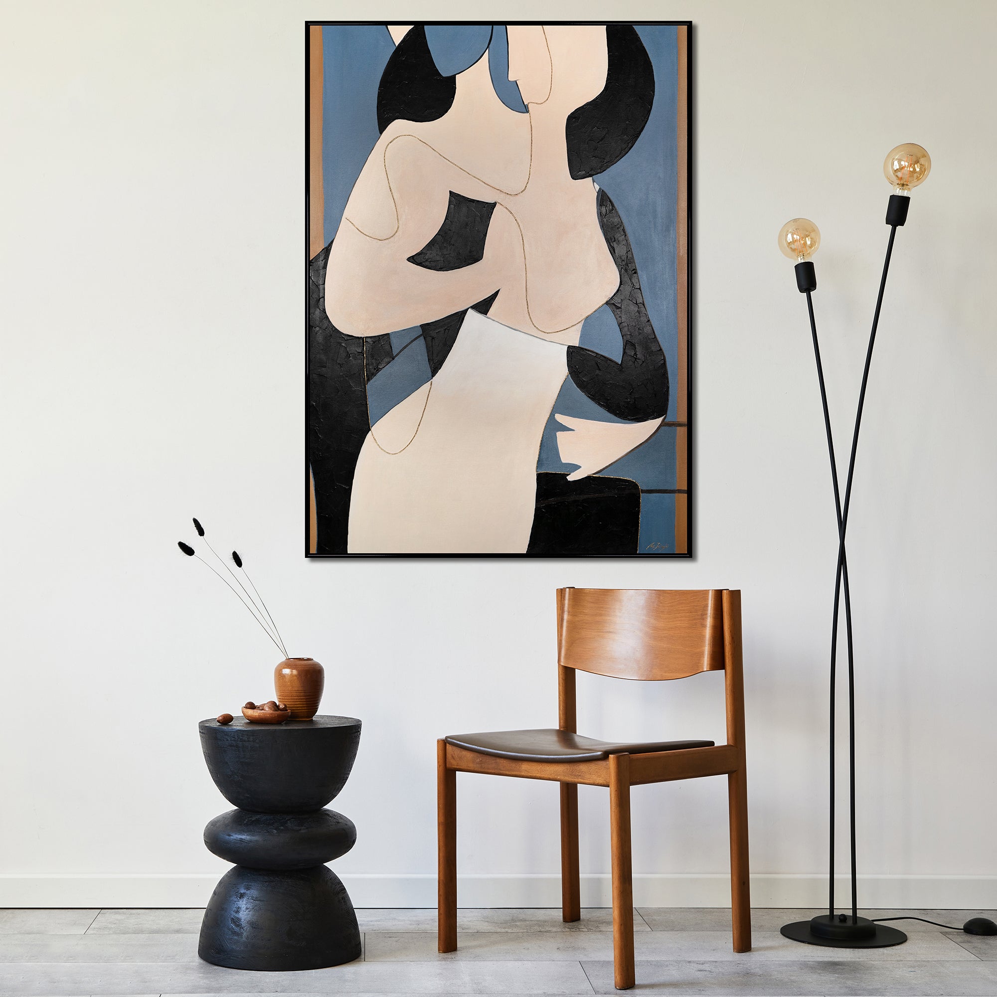 Dieses abstrakte Acrylgemälde stellt eine figurative Komposition dar, die durch klare Linien und sanfte Farbtöne besticht. Die reduzierten Formen und der Kontrast von Schwarz, Beige und Blau verleihen dem Bild eine ruhige, aber gleichzeitig dynamische Ausstrahlung.