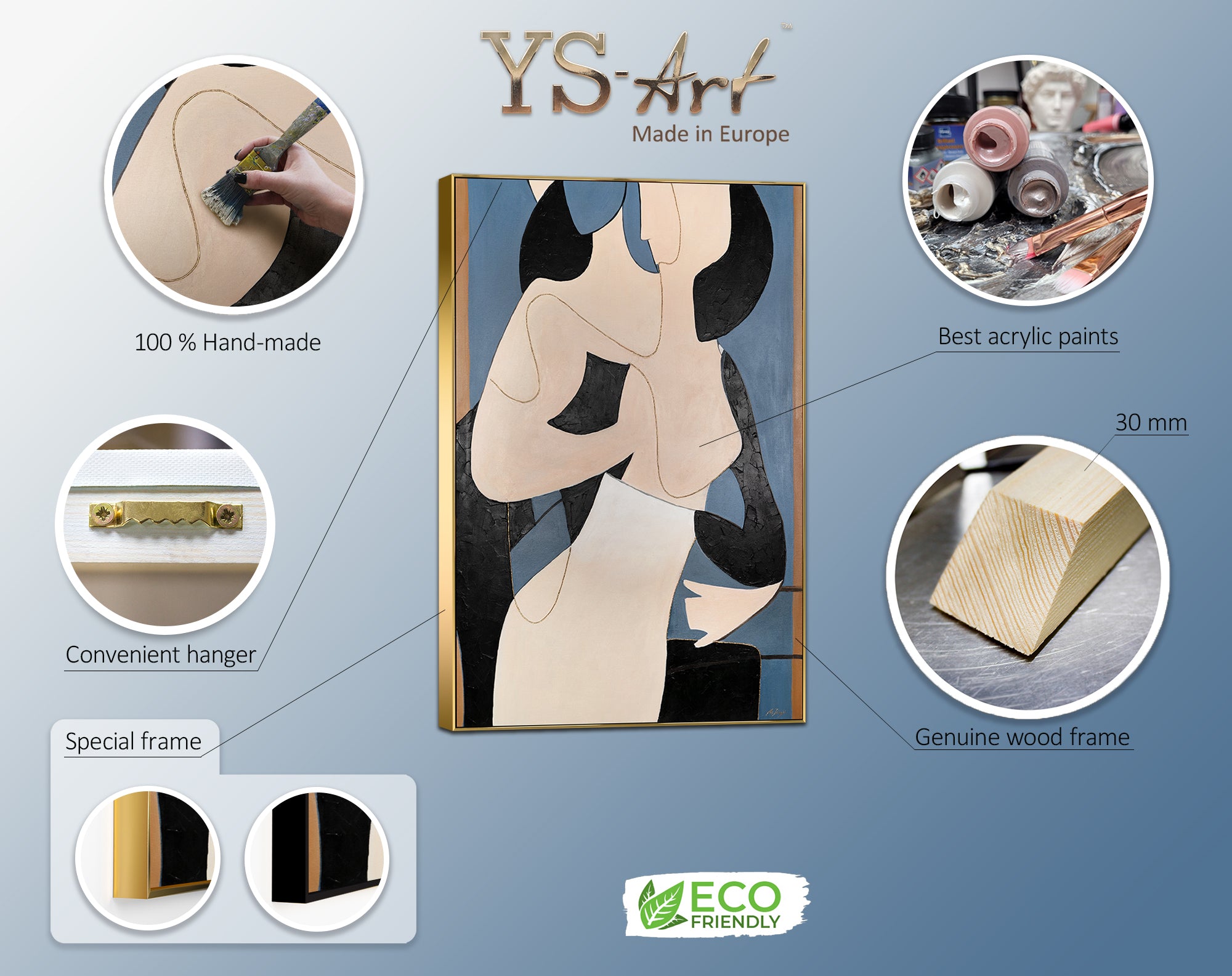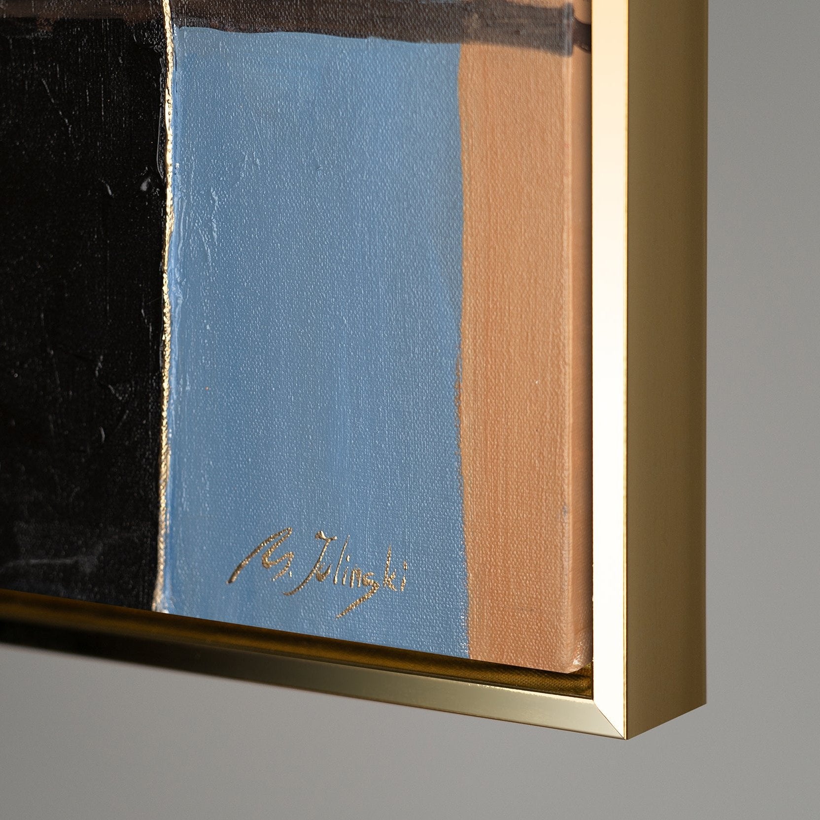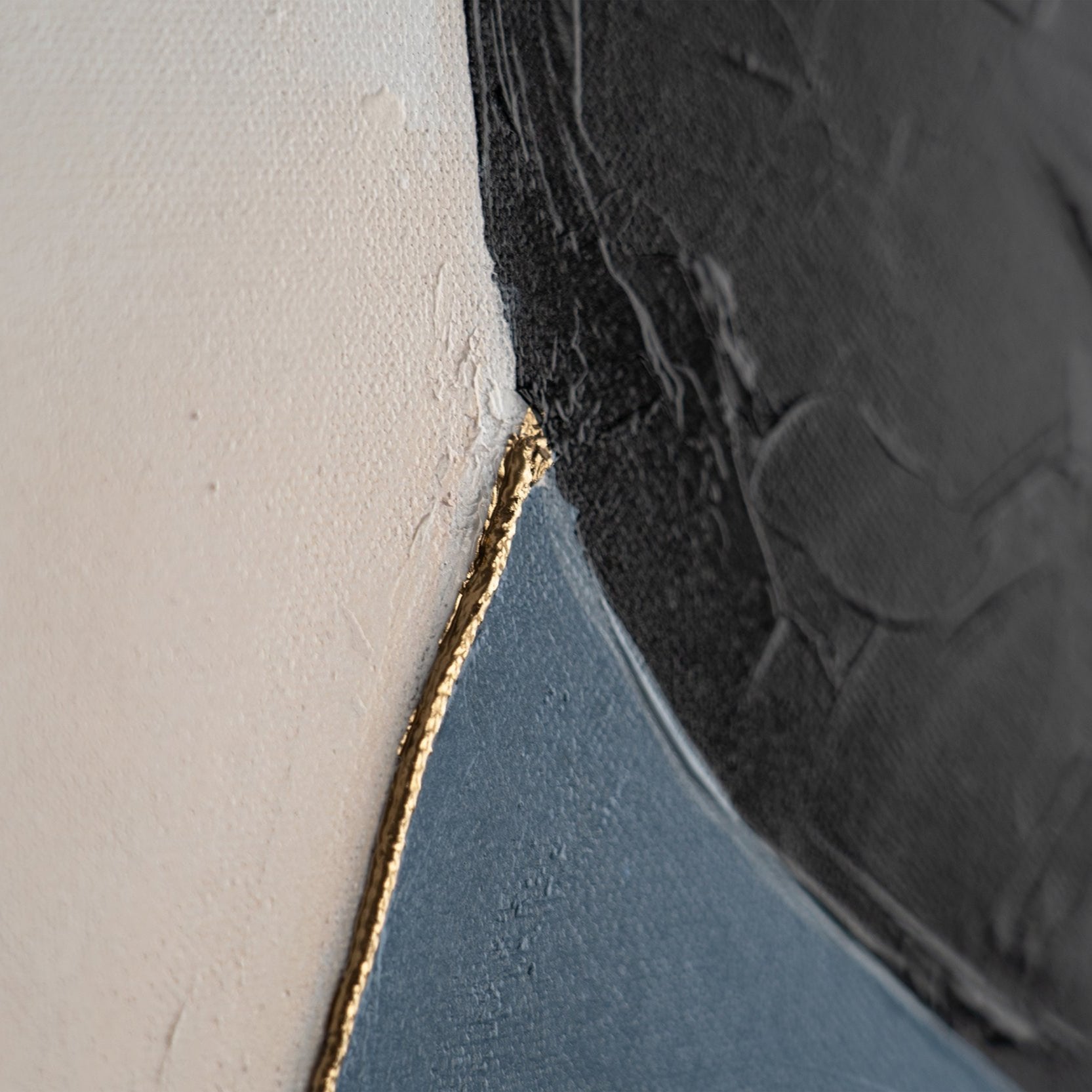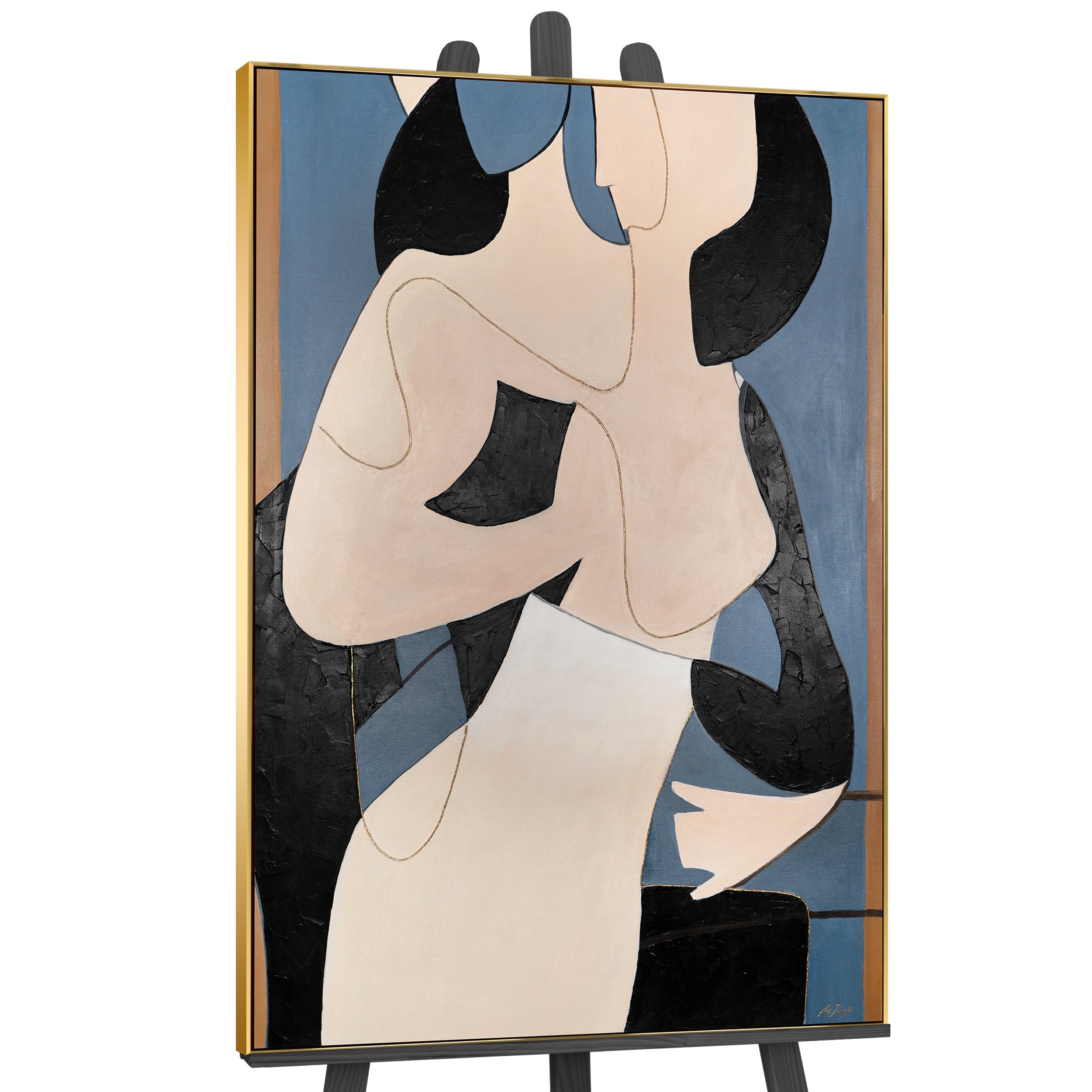 Dieses abstrakte Acrylgemälde stellt eine figurative Komposition dar, die durch klare Linien und sanfte Farbtöne besticht. Die reduzierten Formen und der Kontrast von Schwarz, Beige und Blau verleihen dem Bild eine ruhige, aber gleichzeitig dynamische Ausstrahlung.