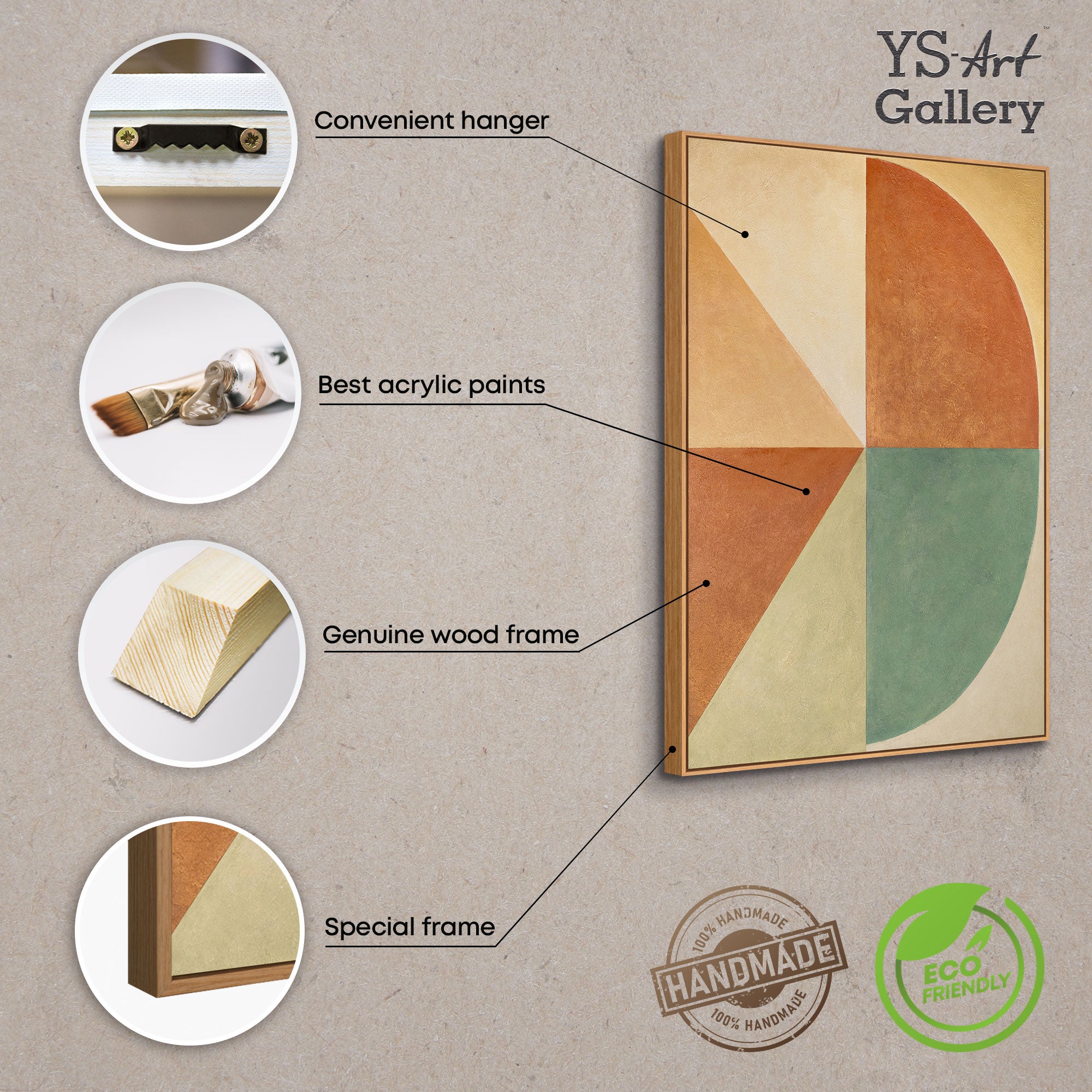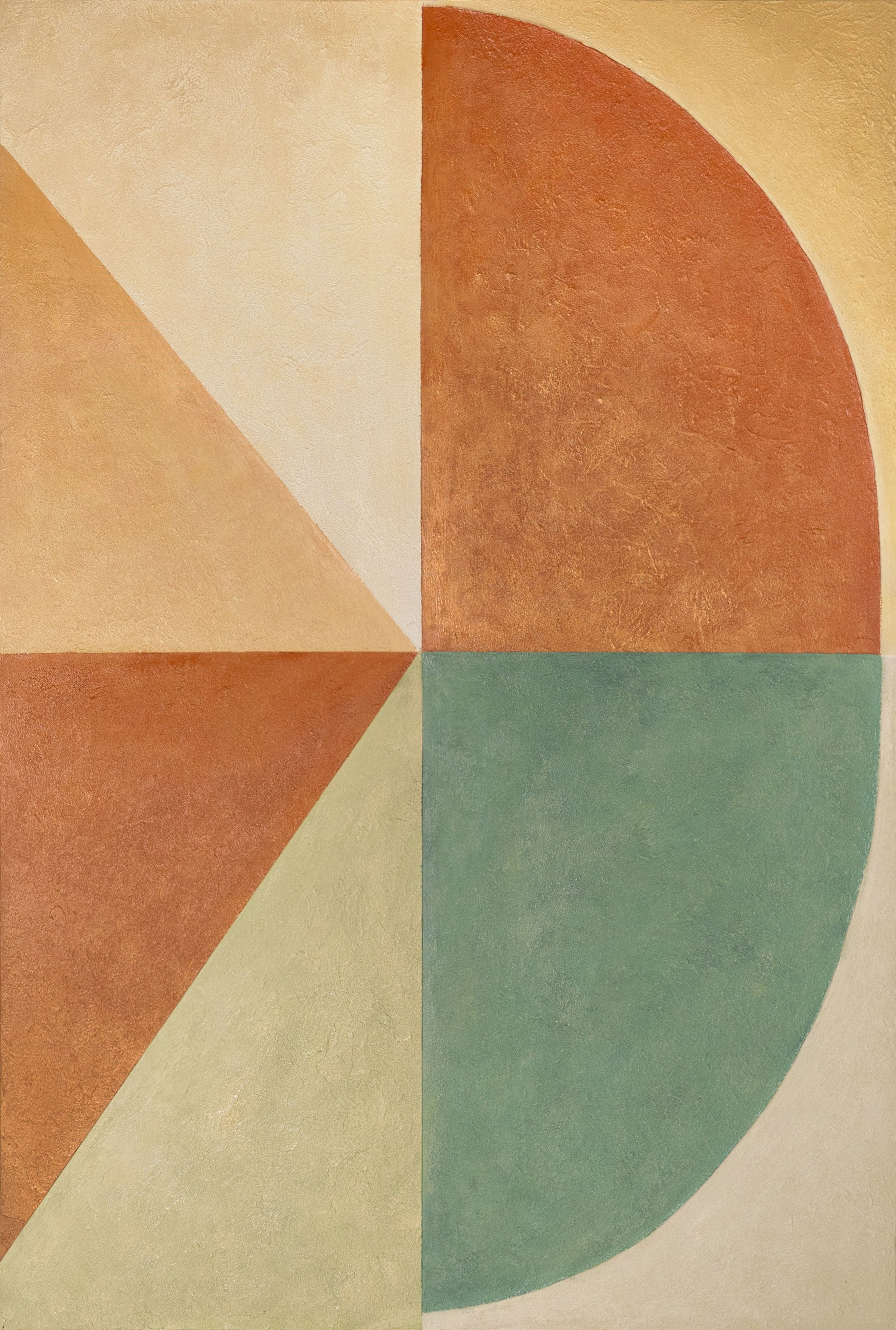 « Formes en équilibre » est une peinture acrylique réalisée à la main qui captive par ses formes géométriques et son harmonie de couleurs. Les tons chauds d'orange et de beige côtoient le vert frais et le crème doux, créant une composition équilibrée qui respire la tranquillité et l'harmonie. La texture de la surface confère de la profondeur à l'œuvre et souligne le travail artisanal de l'artiste.