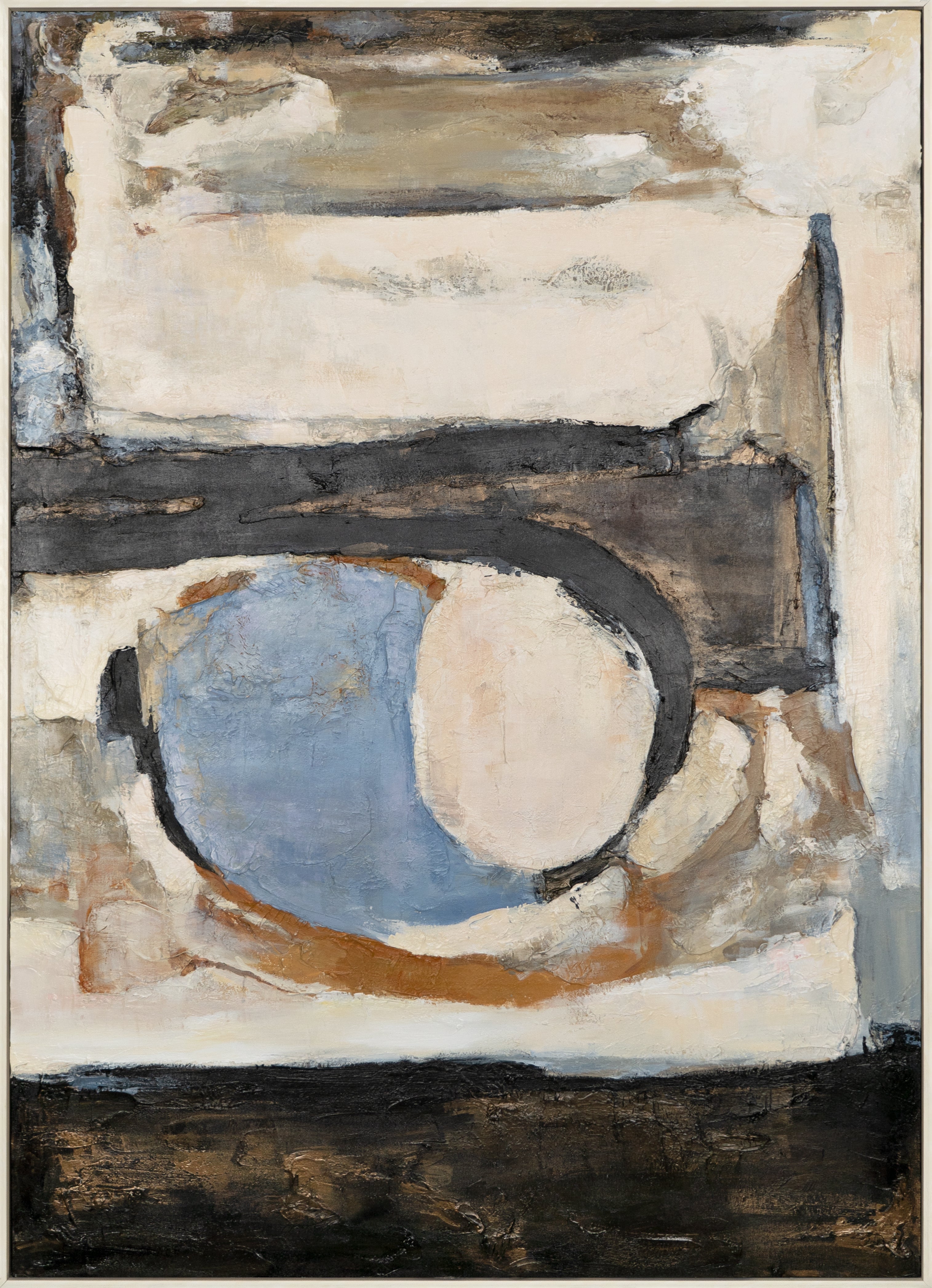 Oberfläche in gedeckten Tönen. Helle Beigetöne und sanftes Blau werden durch kontrastierende Schwarz- und Rostakzente ergänzt. Der aufgeraute Auftrag der Farbe verleiht dem Bild eine greifbare Dimension, die Tiefe und Bewegung suggeriert. Die reduzierte, aber kraftvolle Komposition erinnert an urbane Formen, Mauern oder architektonische Fragmente, die abstrakt interpretiert wurden.