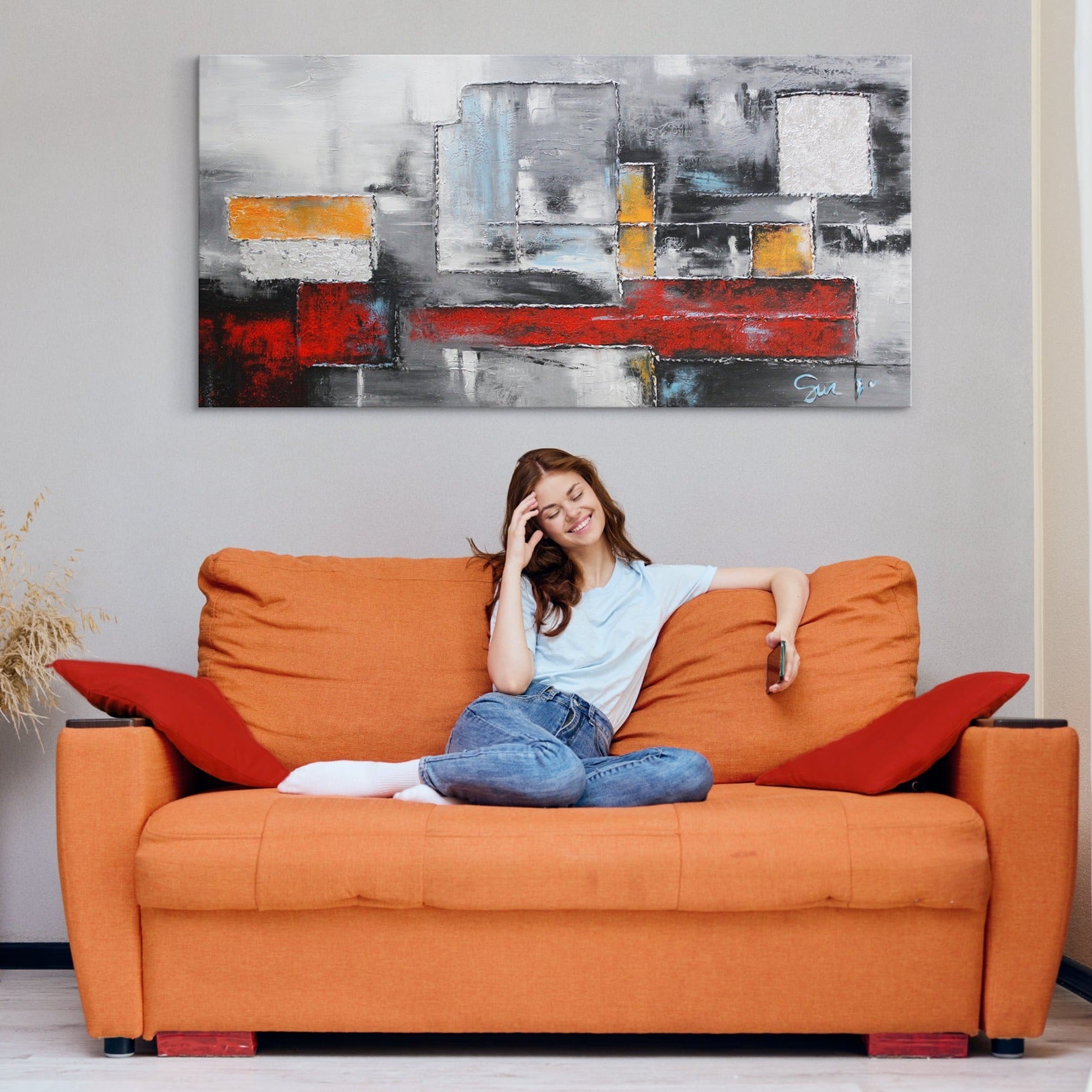 Bereichern Sie Ihr Zuhause oder Büro mit diesem beeindruckenden, abstrakten Kunstwerk, das durch kräftige Rot-, Orange- und Blautöne eine moderne und dynamische Komposition darstellt. Das Bild besticht durch kräftige Kontraste und ausdrucksstarke Pinselstriche. Es ist 100% handgemalt und wird durch einen eleganten Rahmen hervorgehoben.