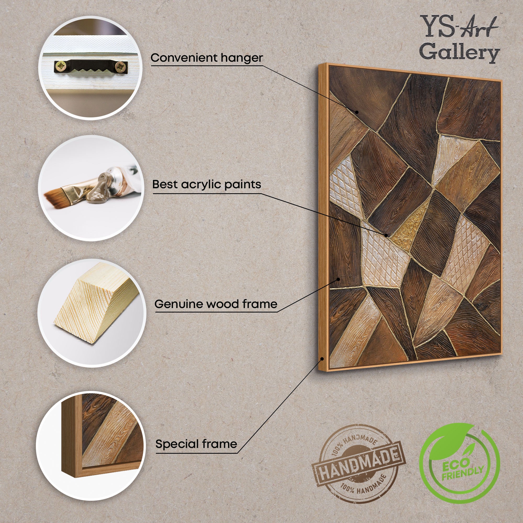 Cette peinture acrylique, réalisée à la main sur toile texturée, est l'expression d'une élégance moderne. L'association de tons or, brun et naturels crée une ambiance à la fois sereine et luxueuse. Idéale pour les espaces à l'atmosphère raffinée – salon, bureau ou galerie. Fabriquée en Allemagne, confectionnée avec soin, emballée avec précaution et livrée gratuitement.