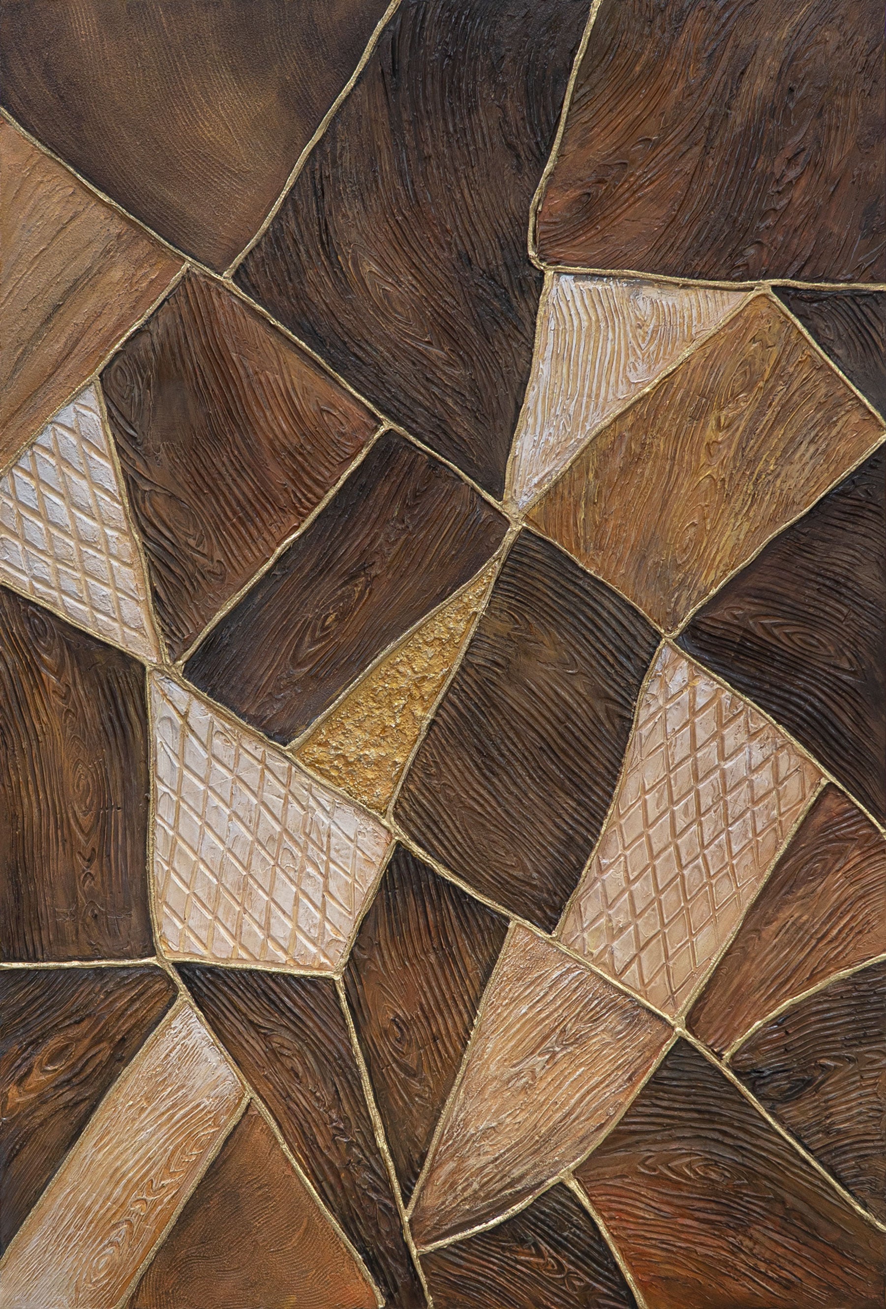 « Géométrie de l'Or » allie austérité et chaleur. Dans un réseau rythmé de formes géométriques, les textures du bois rencontrent des surfaces métalliques dorées. Chaque surface possède sa propre texture et sa propre lumière ; ensemble, elles créent mouvement, profondeur et une impression d'équilibre intemporel. La peinture évoque l'harmonie de l'architecture et de la nature, le jeu de l'ordre et de l'irrégularité.