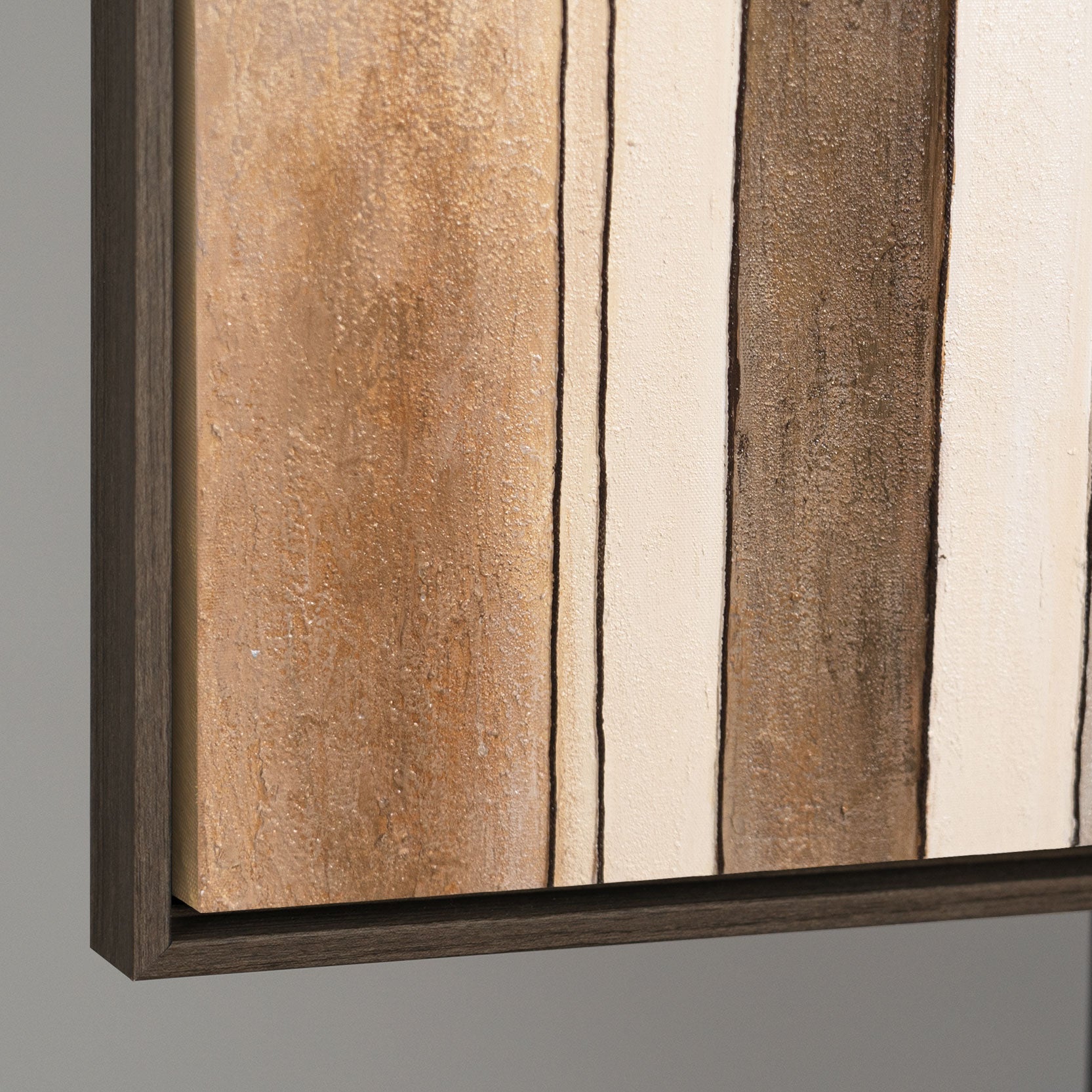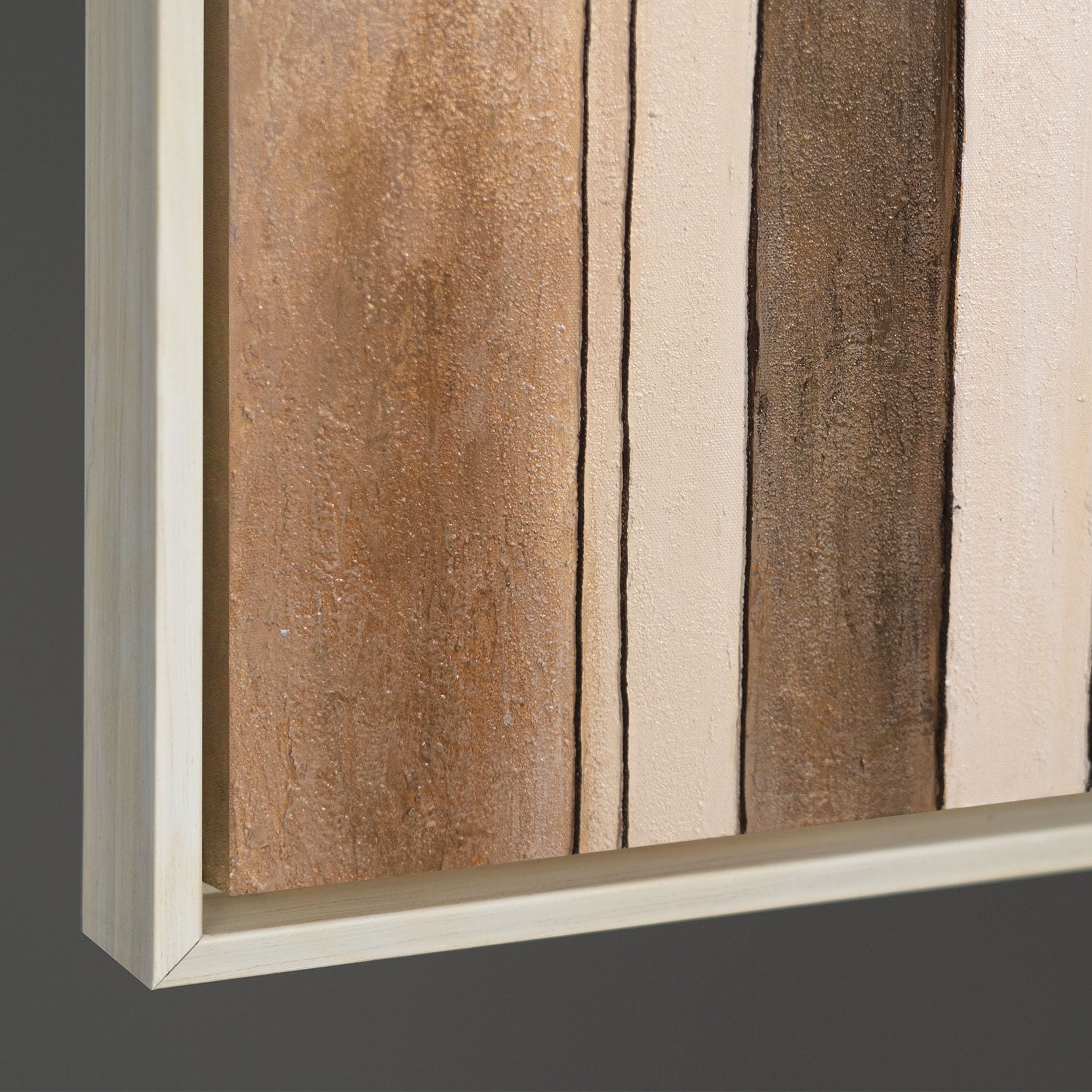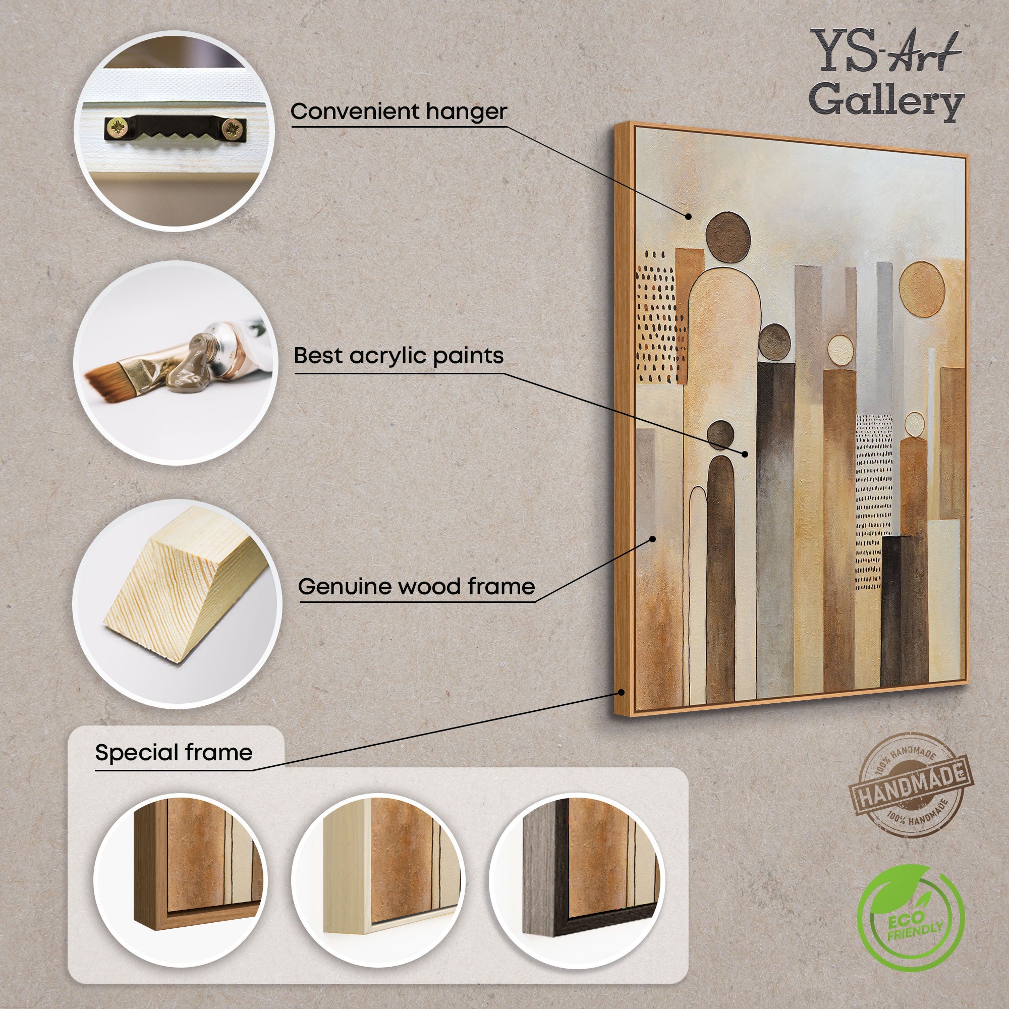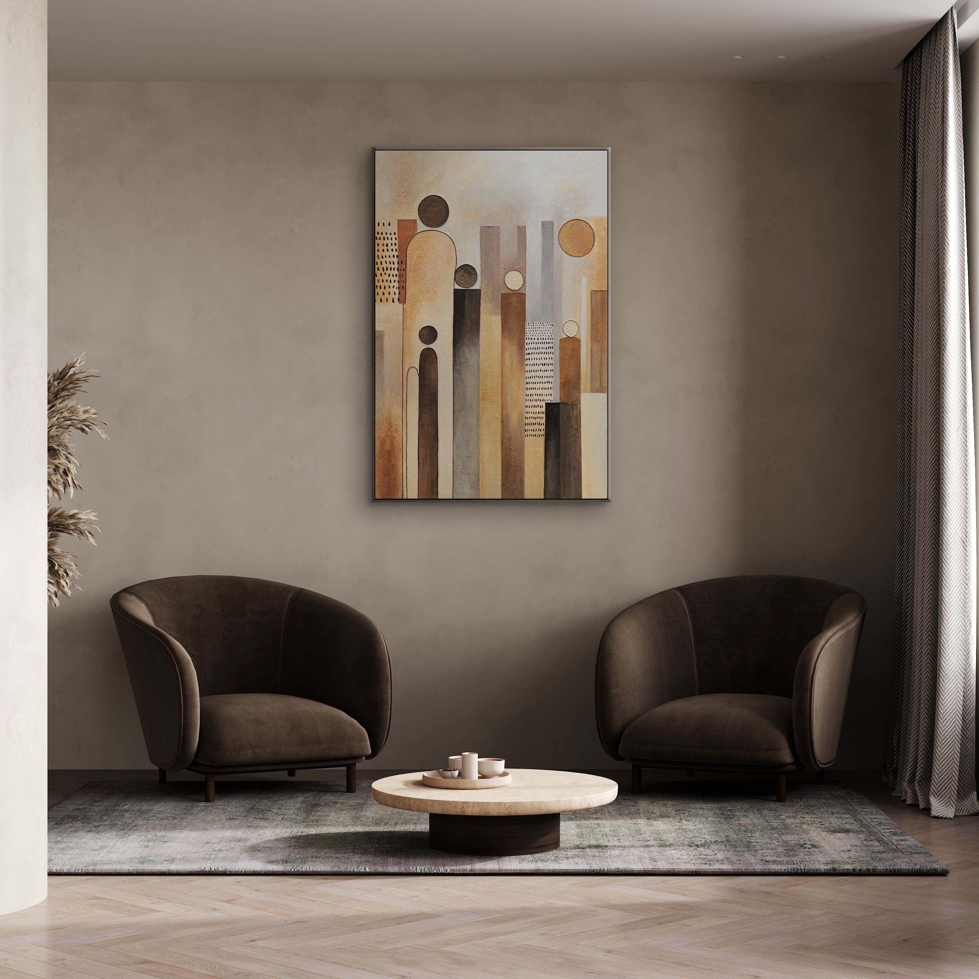 « Cité de figures » est un hommage à la vie urbaine, réduite à l’essentiel : formes, rythme et relations. Des lignes verticales s’élèvent vers le ciel, telles des maisons, tandis que des cercles symbolisent la présence humaine. La composition, aux tons chauds de beige, de brun et d’ocre, traduit à la fois mouvement et sérénité. Sa structure épurée évoque le pouls d’une ville, vibrant entre proximité et distance.