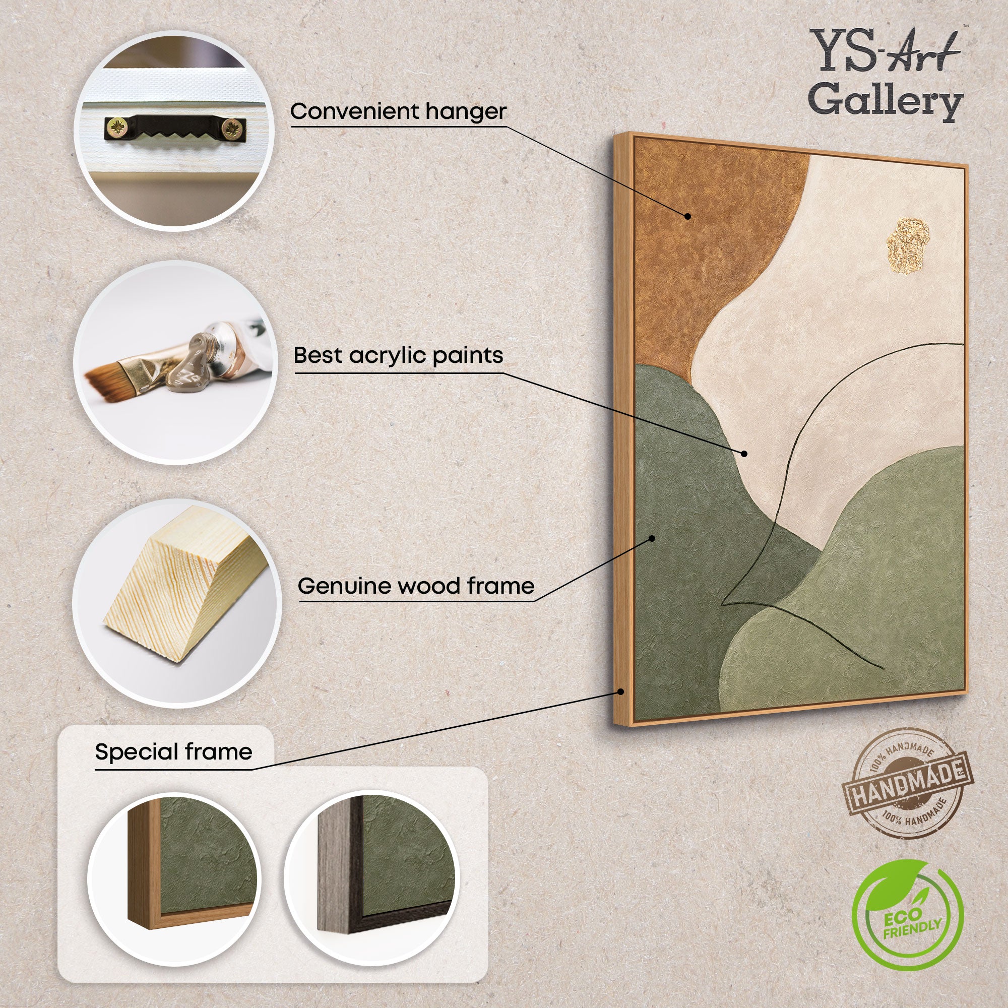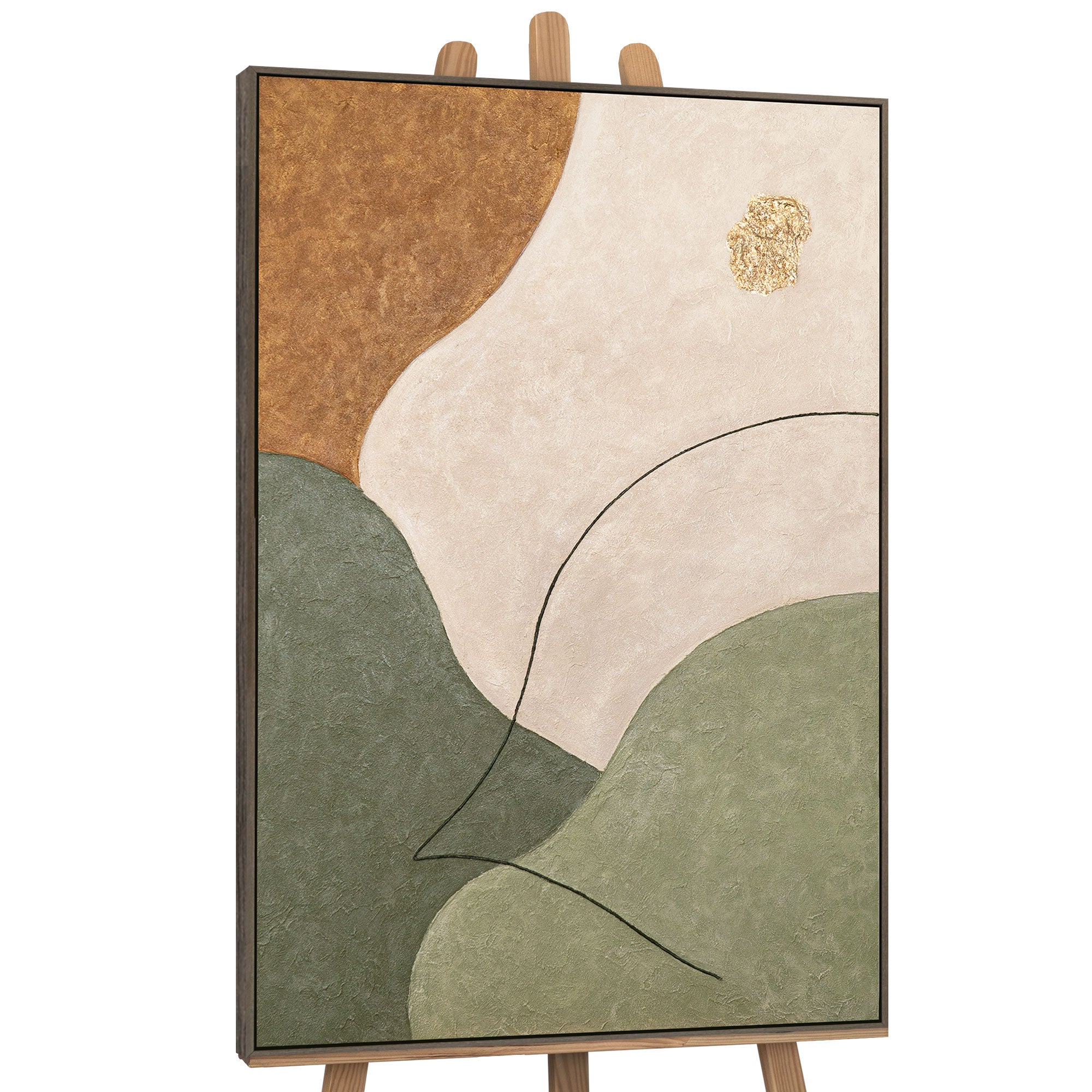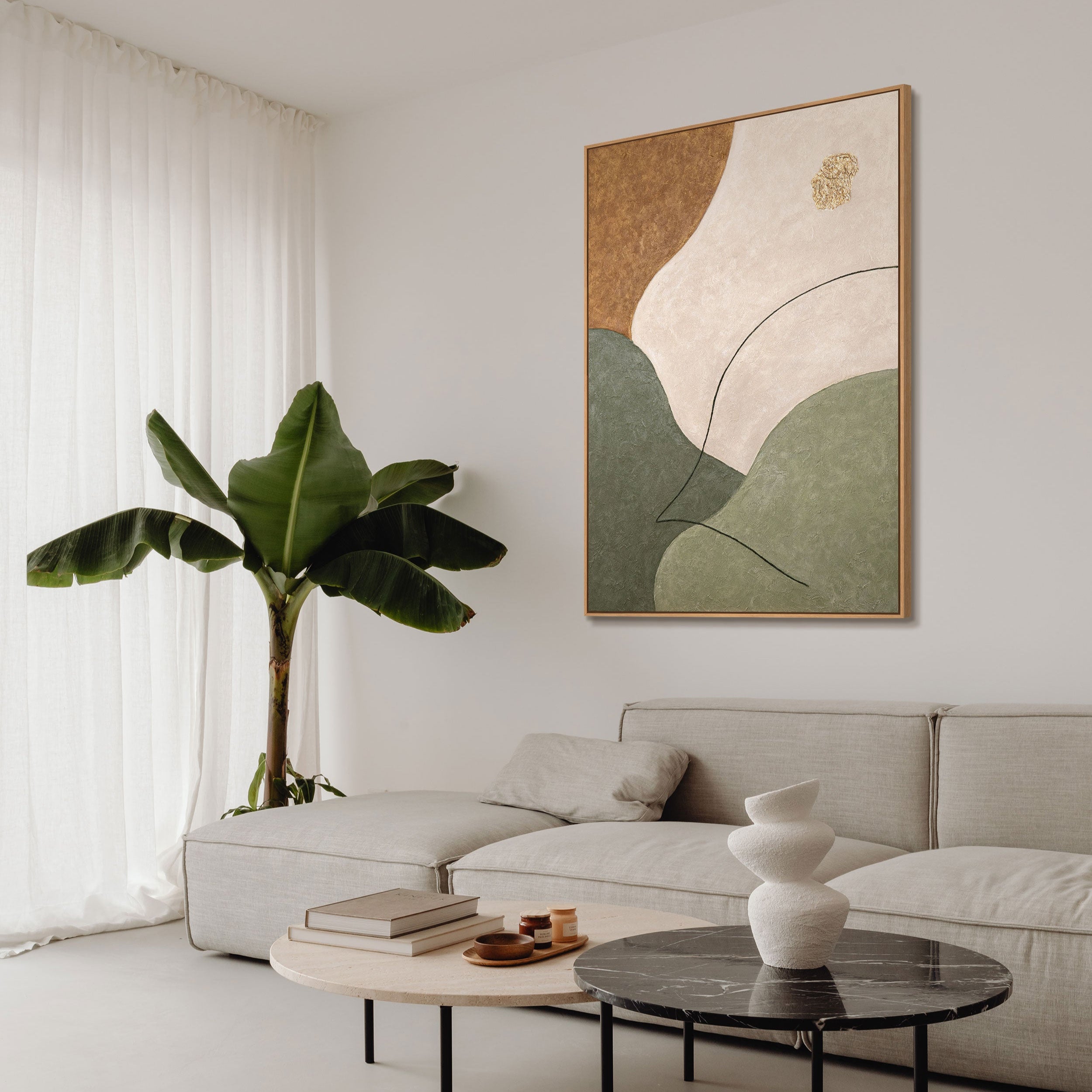 Apportez élégance et sérénité dans votre maison avec ce tableau abstrait fait main. La combinaison harmonieuse de brun chaud, de beige doux, de vert apaisant et de touches dorées fait de cette œuvre un véritable point focal.