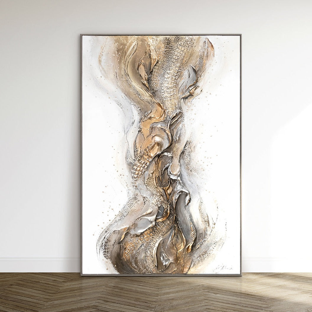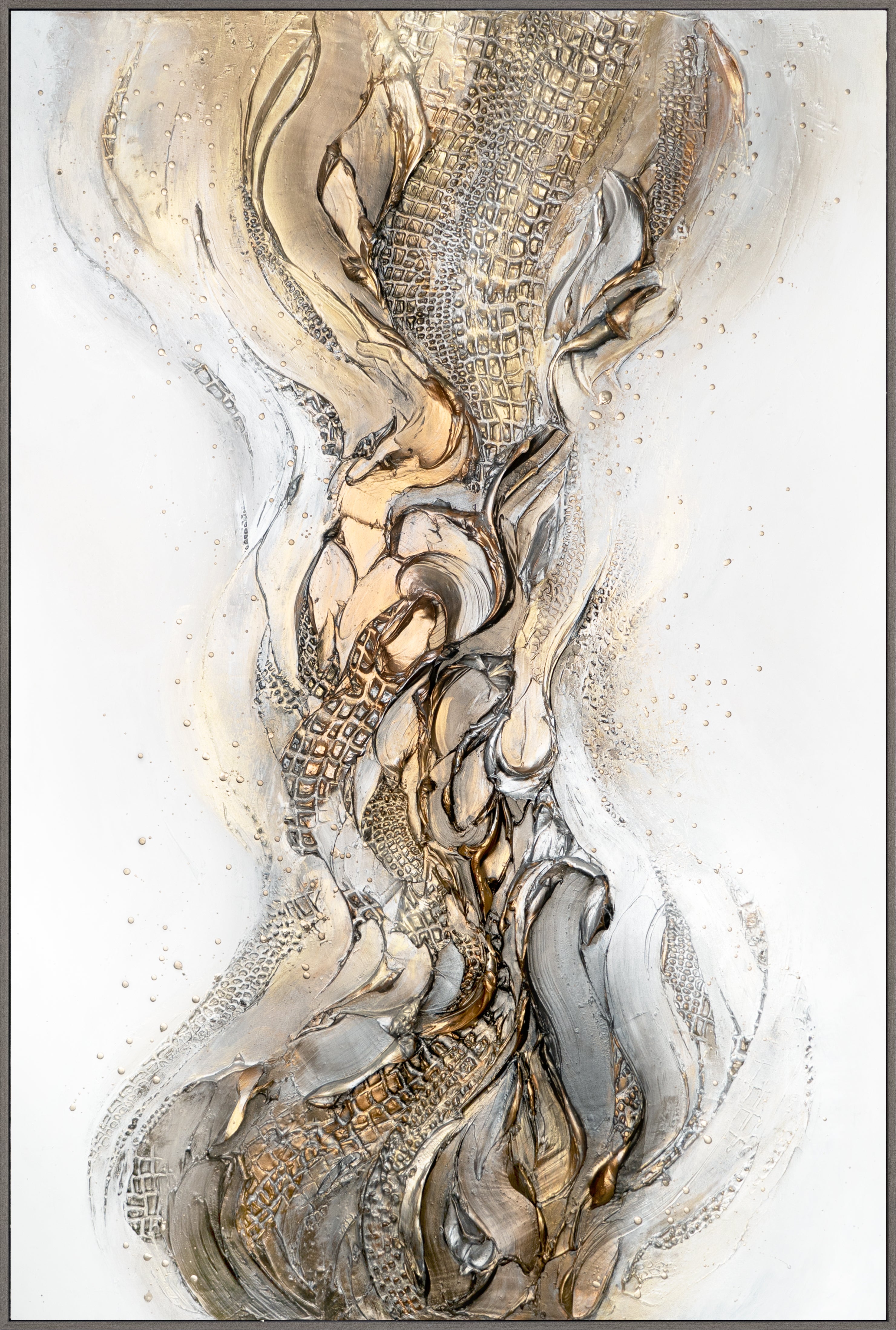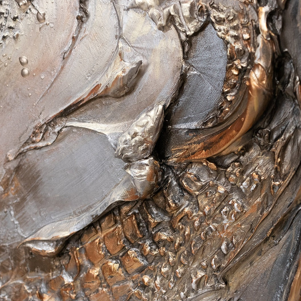 Die Atmosphäre der Abstraktion in diesem leinwandbilder acryl ist faszinierend. Verschiedene Texturen, Blattgold und ein dünner Rahmen verleihen Luxus und Eleganz. Dieses Kunstwerk wird sowohl im Wohnzimmer als auch im Schlafzimmer oder Arbeitszimmer großartig aussehen.