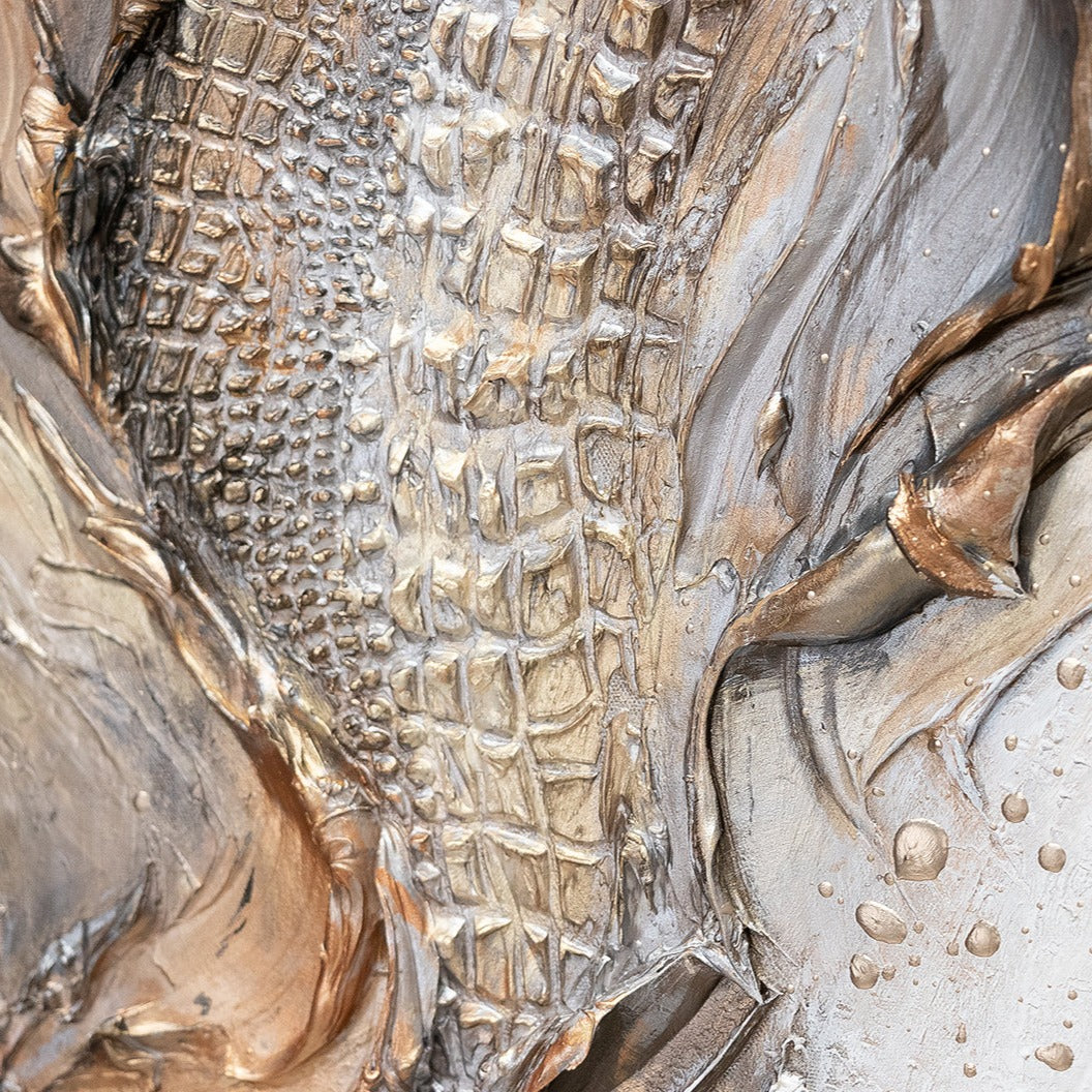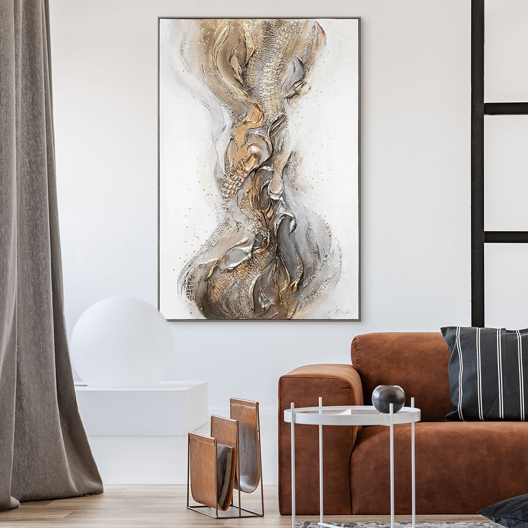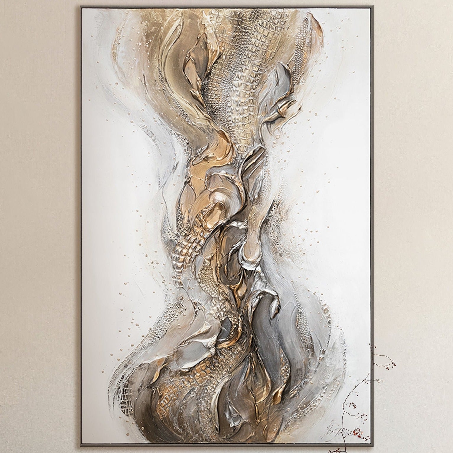 Die Atmosphäre der Abstraktion in diesem leinwandbilder acryl ist faszinierend. Verschiedene Texturen, Blattgold und ein dünner Rahmen verleihen Luxus und Eleganz. Dieses Kunstwerk wird sowohl im Wohnzimmer als auch im Schlafzimmer oder Arbeitszimmer großartig aussehen.