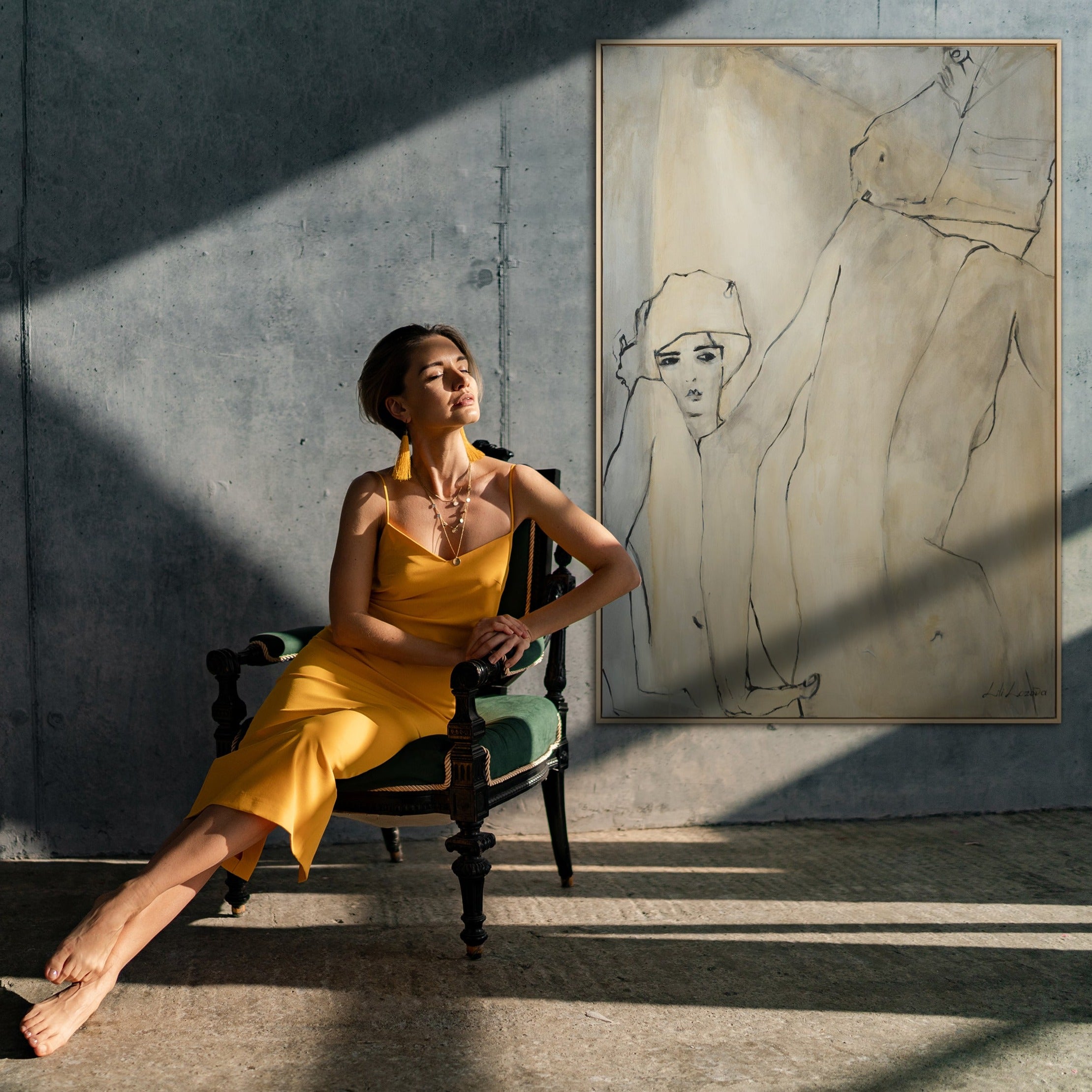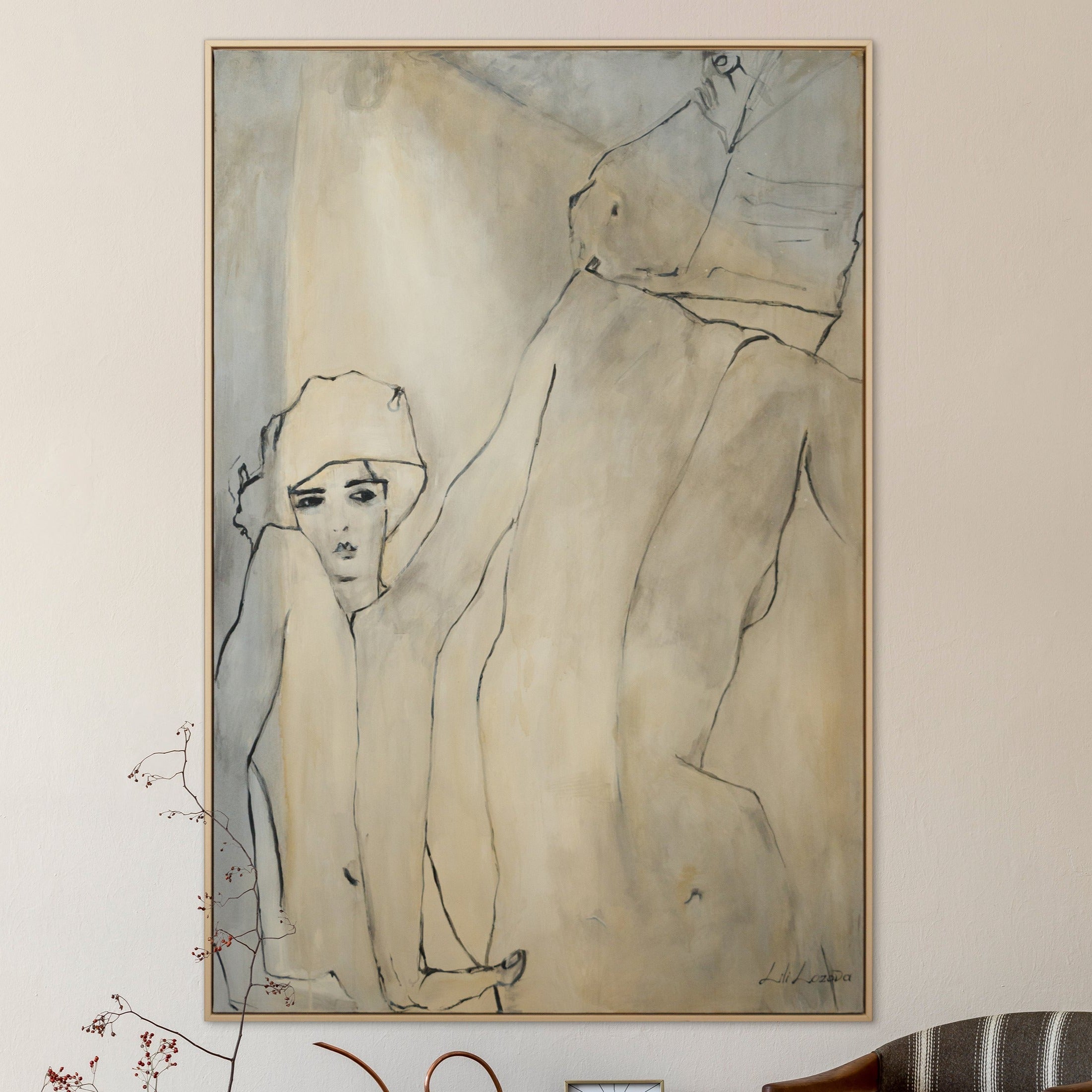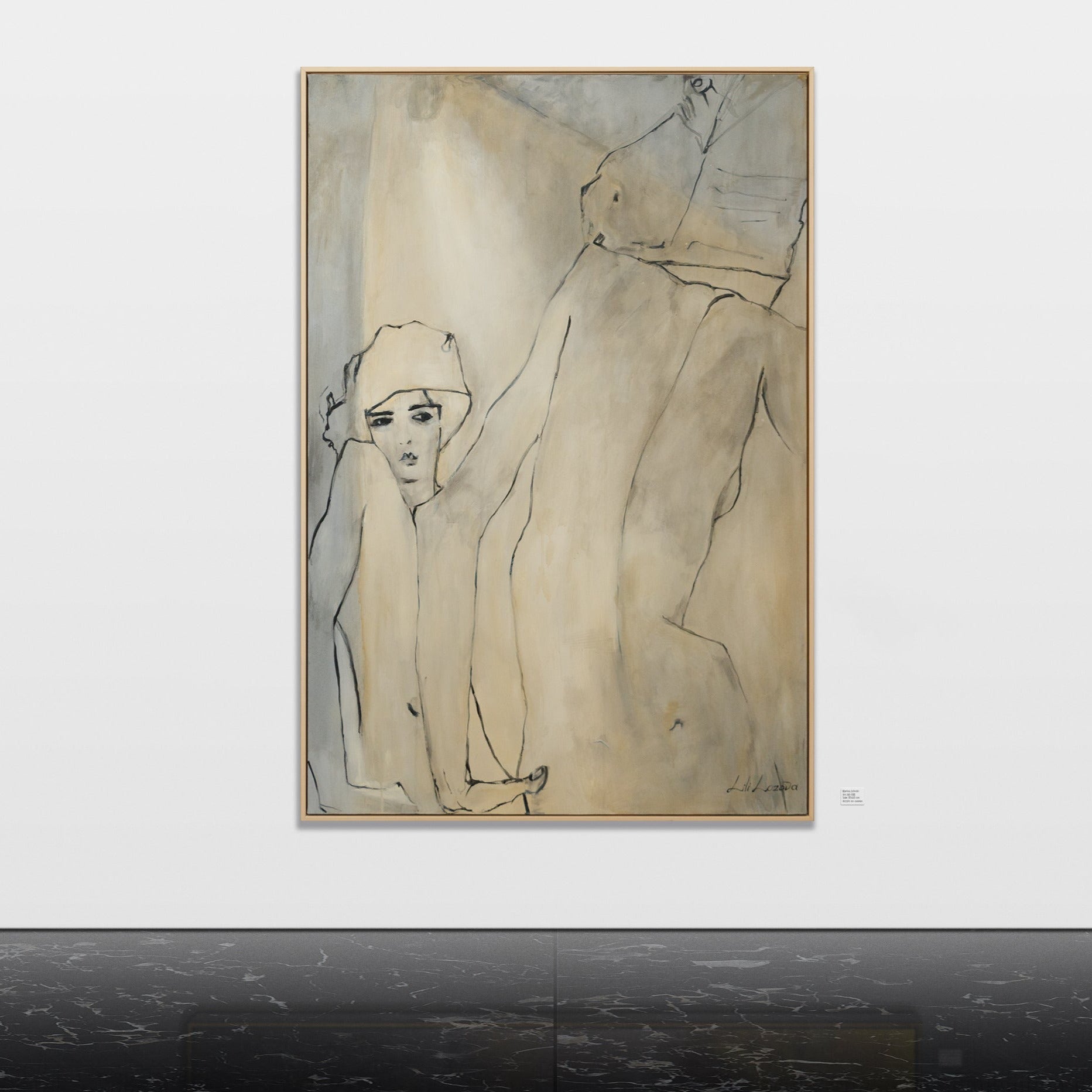 • Großes abstraktes Gemälde Frau in modernem Interieur mit Holzkonsole