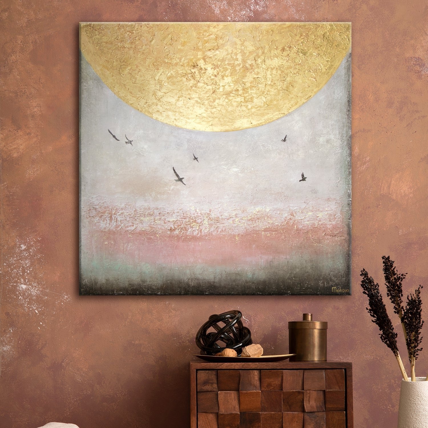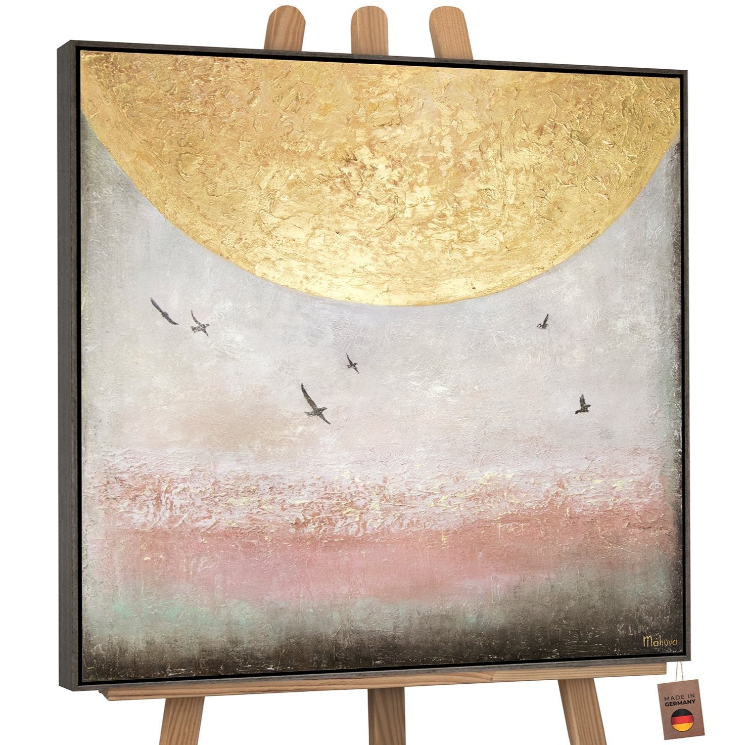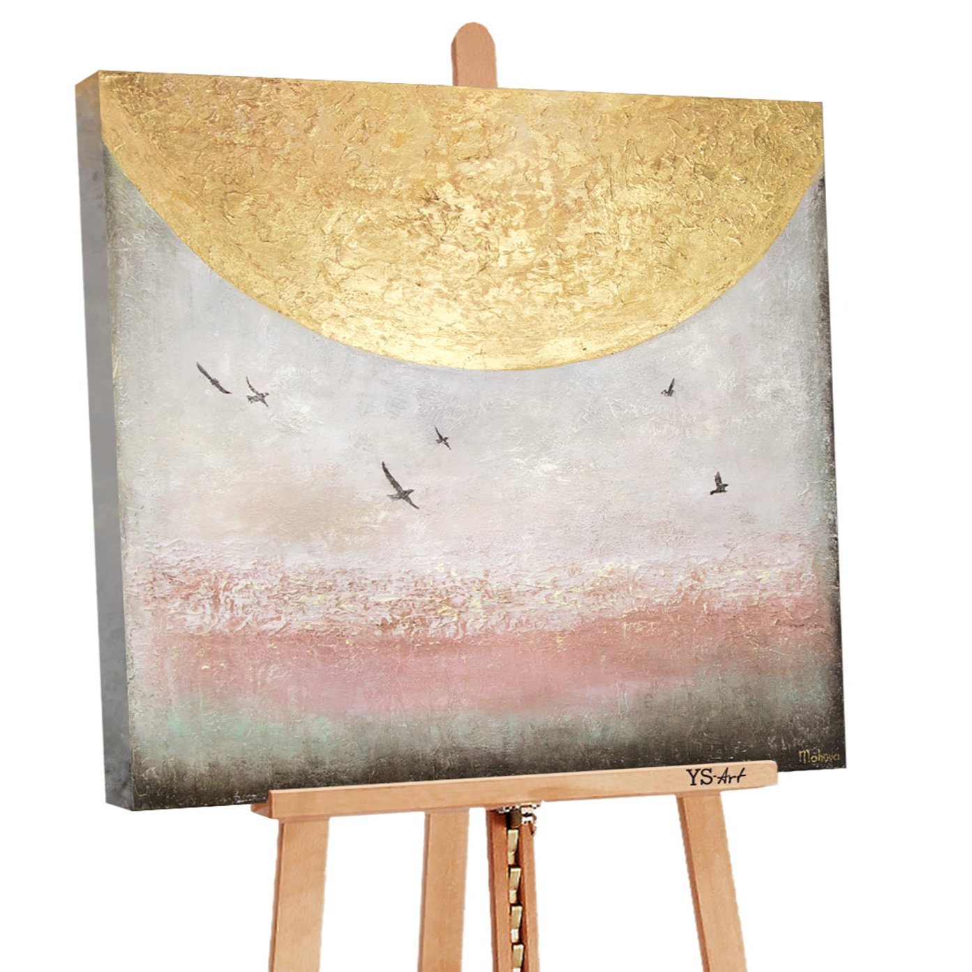 Dieses beeindruckende Acrylbild vereint die beruhigende Schönheit einer Landschaft mit der edlen Eleganz von goldenen Akzenten. Der goldene Halbkreis, der sich über die gesamte Breite des Bildes erstreckt, symbolisiert die untergehende Sonne und verleiht dem Kunstwerk eine majestätische Ausstrahlung. Im Vordergrund sind sanfte Farbtöne zu sehen, die eine friedliche Atmosphäre schaffen, während die feinen Details der fliegenden Vögel dem Bild Leben einhauchen. Dieses Kunstwerk ist perfekt für alle, die eine raffinierte und zugleich beruhigende Dekoration für ihr Zuhause oder Büro suchen.