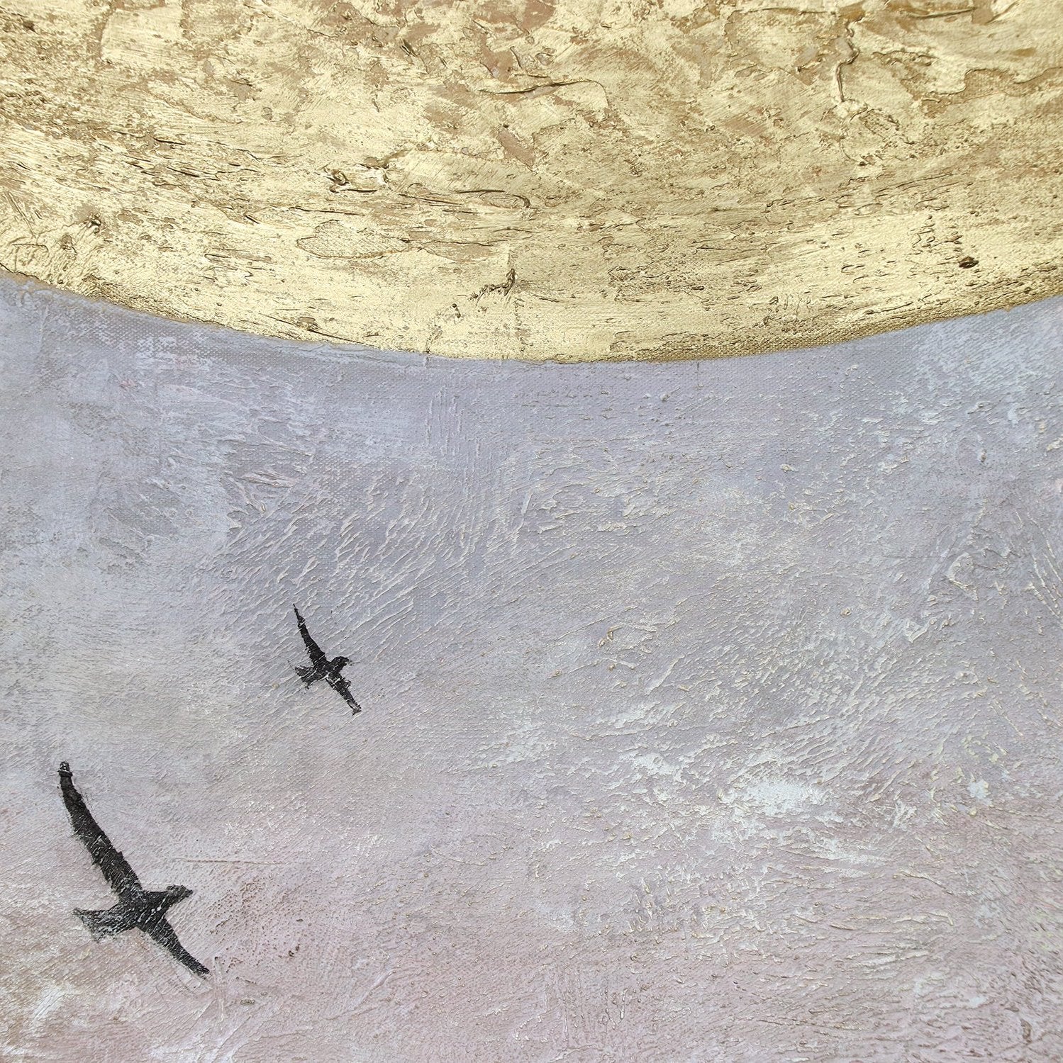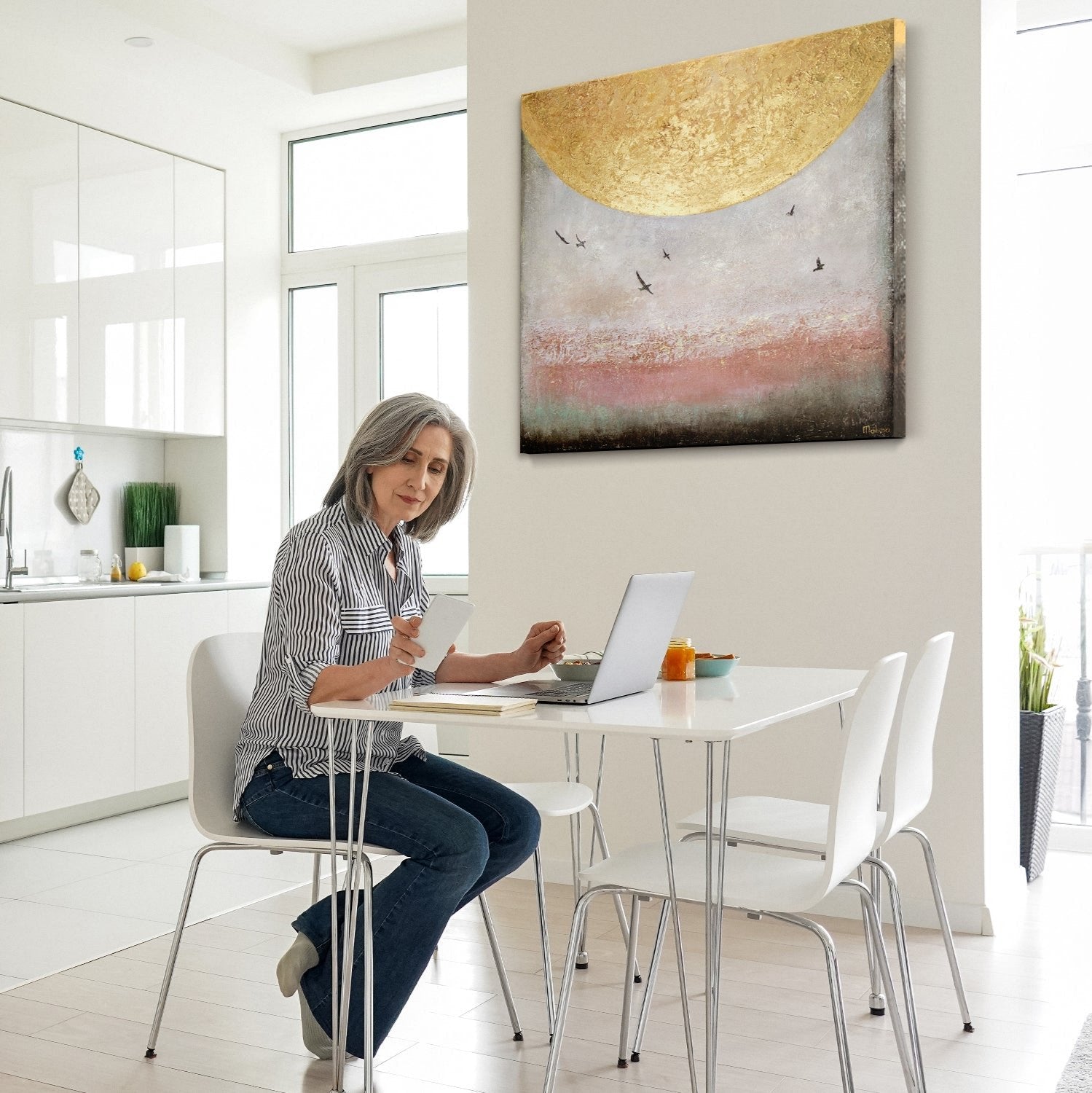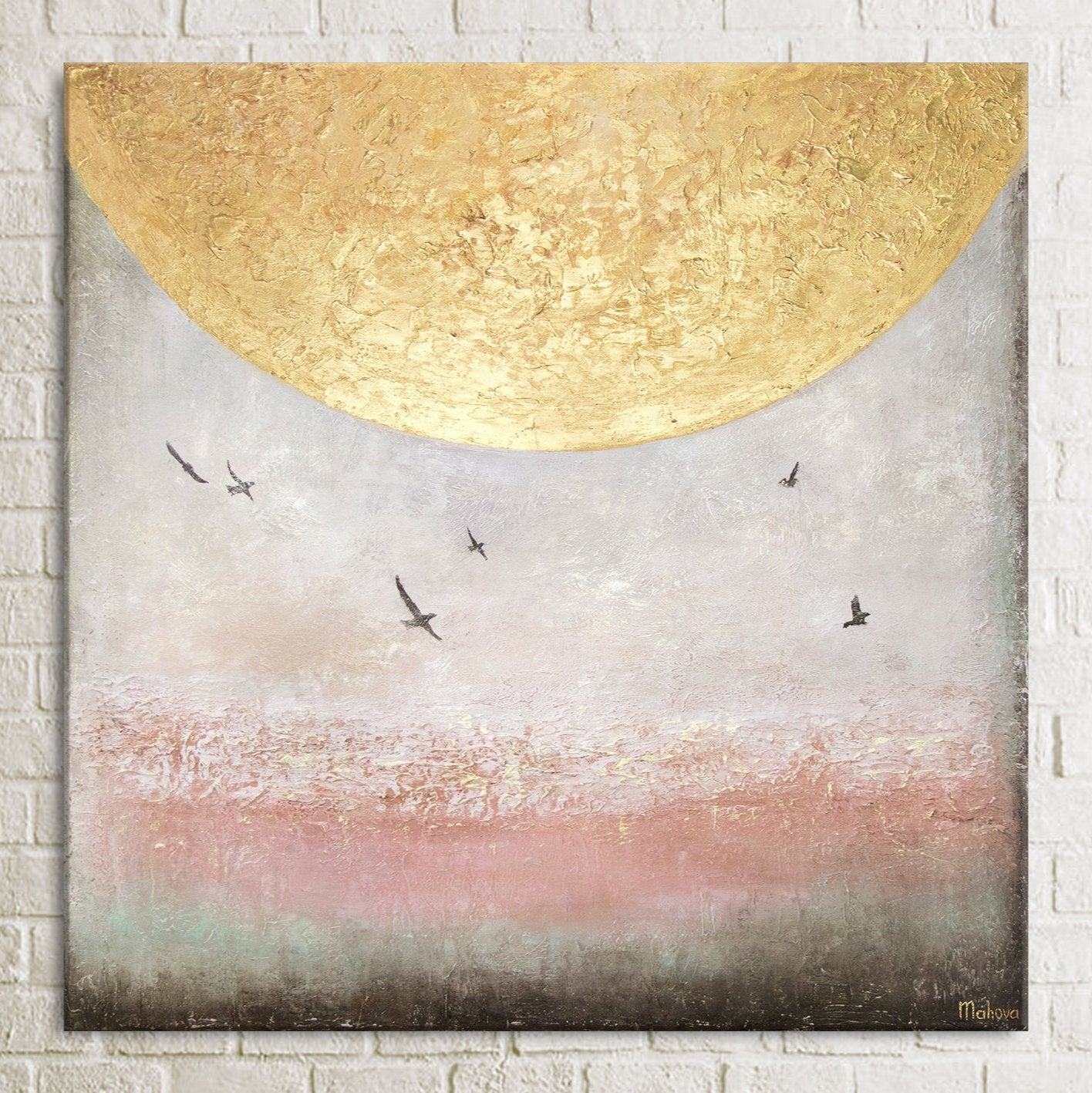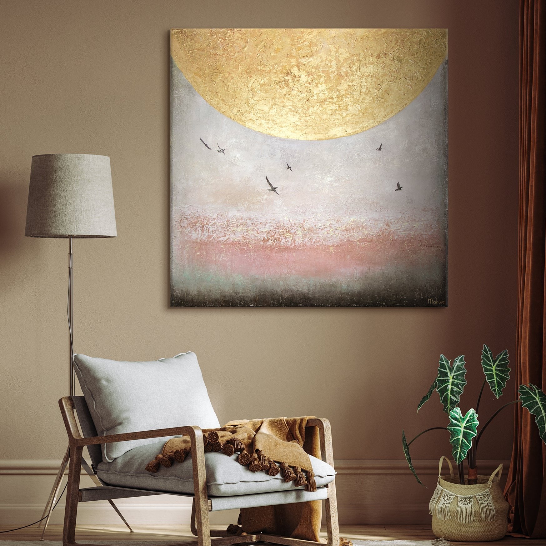 Dieses beeindruckende Acrylbild vereint die beruhigende Schönheit einer Landschaft mit der edlen Eleganz von goldenen Akzenten. Der goldene Halbkreis, der sich über die gesamte Breite des Bildes erstreckt, symbolisiert die untergehende Sonne und verleiht dem Kunstwerk eine majestätische Ausstrahlung. Im Vordergrund sind sanfte Farbtöne zu sehen, die eine friedliche Atmosphäre schaffen, während die feinen Details der fliegenden Vögel dem Bild Leben einhauchen. Dieses Kunstwerk ist perfekt für alle, die eine raffinierte und zugleich beruhigende Dekoration für ihr Zuhause oder Büro suchen.