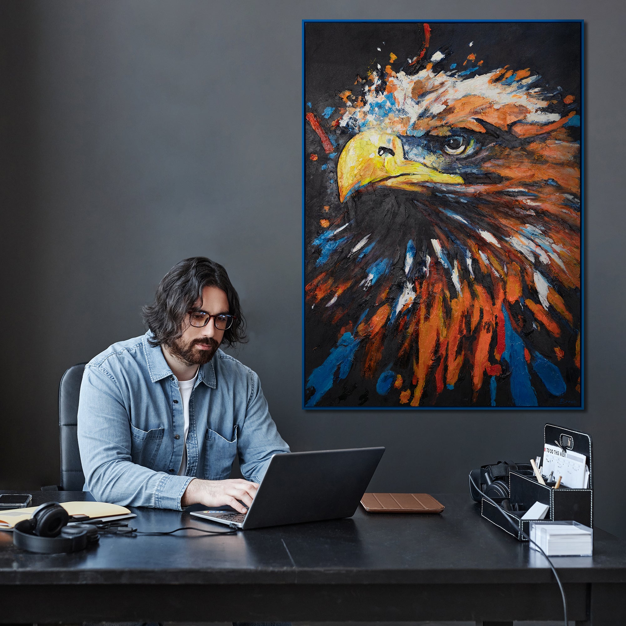 Das beeindruckende Kunstwerk 'Majestätischer Adler' zeigt einen stolzen Adlerkopf, der in intensiven Farben wie Orange, Blau und Gelb kraftvoll dargestellt ist. Diese moderne Interpretation eines der majestätischsten Tiere vereint dynamische Pinselstriche mit einem starken Ausdruck.