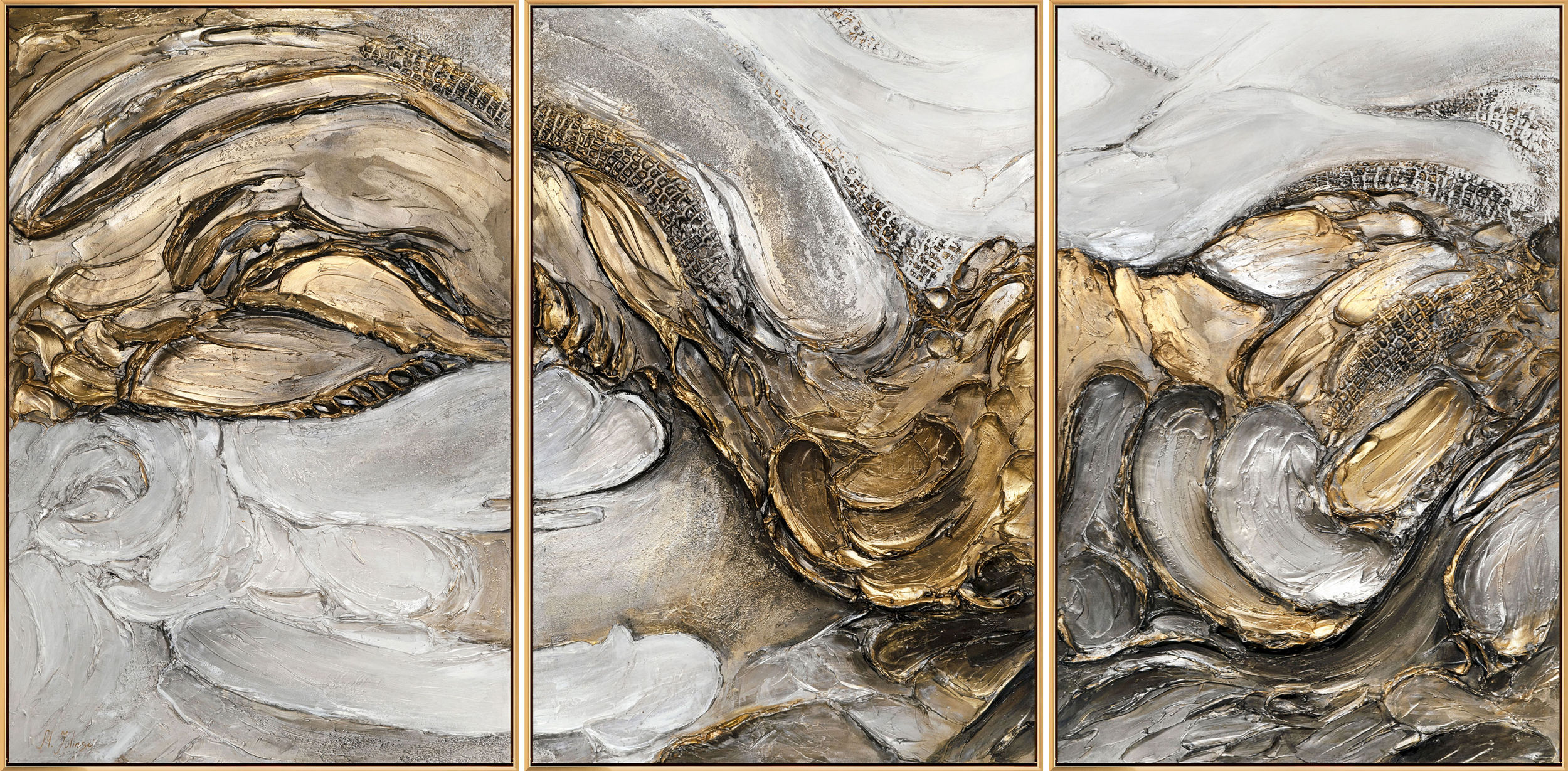 Dieses exklusive, handgemalte Triptychon beeindruckt durch seine dynamische Struktur und die edlen Gold- und Silbertöne. Die dreiteilige Komposition schafft eine ausdrucksstarke Wanddekoration und verleiht Ihrem Wohnraum eine luxuriöse und moderne Atmosphäre. Die aufwendig modellierte Oberfläche verleiht dem Kunstwerk Tiefe und Einzigartigkeit.
