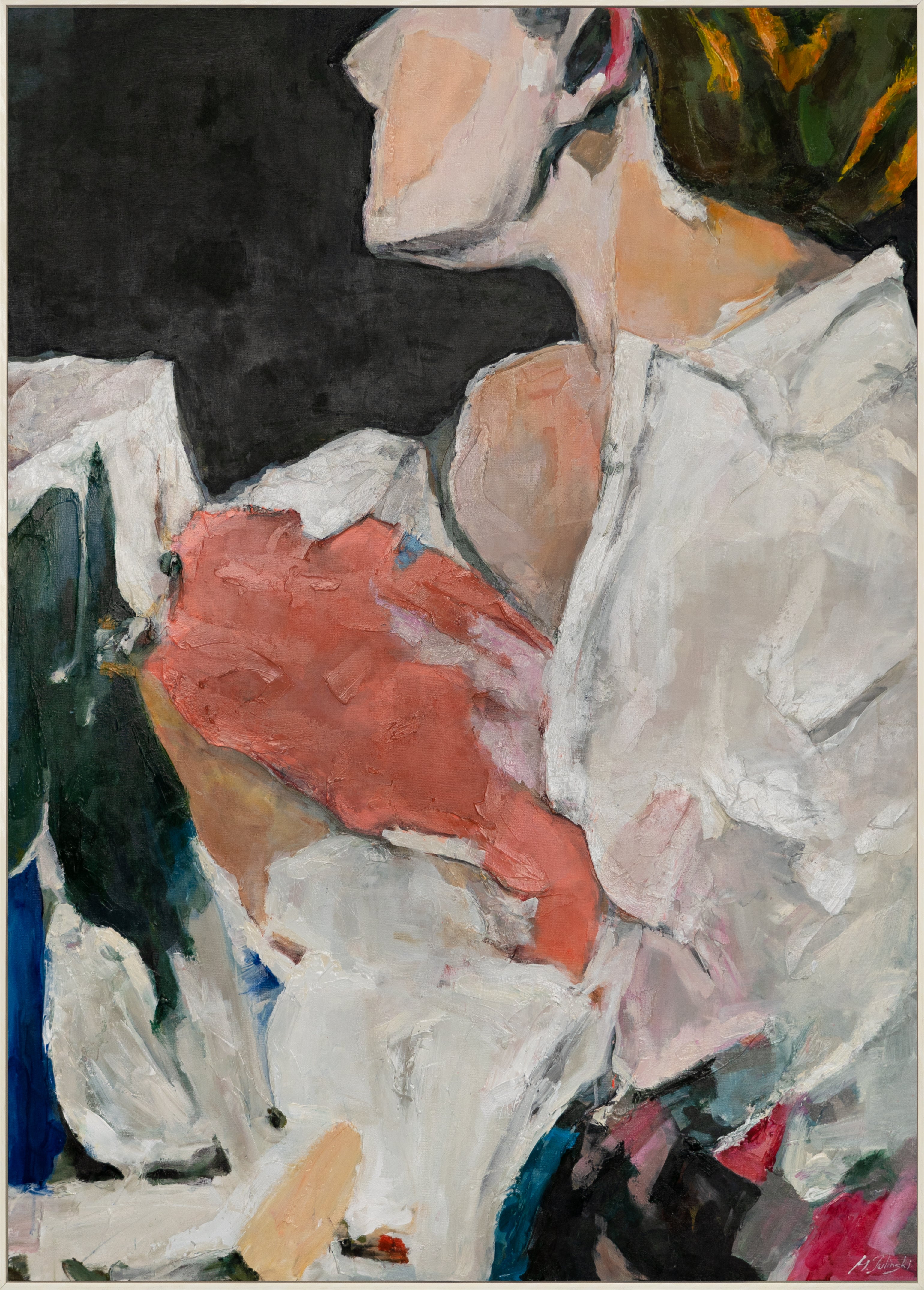 Diese handgemalte Komposition zeigt eine reduzierte, doch ausdrucksstarke weibliche Silhouette, eingebettet in ein harmonisches Zusammenspiel aus gedämpftem Rosa, Creme, Grau und Akzenten in Grün und Schwarz. Die abstrahierte Form des Gesichts verleiht dem Werk eine geheimnisvolle Aura, während grobe Pinselstriche und dicke Farbschichten Struktur und Tiefe erzeugen. Das Spiel zwischen Fläche und Form schafft einen modernen und zugleich sensiblen Kunstmoment.