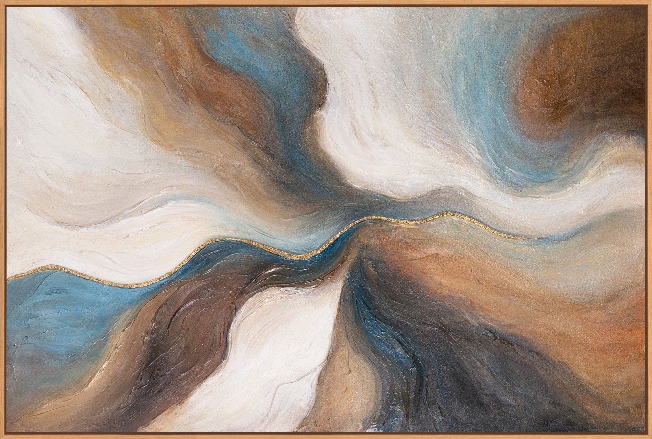 « Passage du Temps » révèle une harmonie fluide de tons chauds et terreux, de délicates zones crème et d'accents bleus frais. Ses mouvements organiques évoquent les vagues, les sédiments ou des paysages en perpétuelle transformation. Un fin trait doré traverse la toile, conférant à l'œuvre élégance et subtile finesse. La texture en impasto donne à la surface un aspect vibrant et apporte de la profondeur à toute pièce.