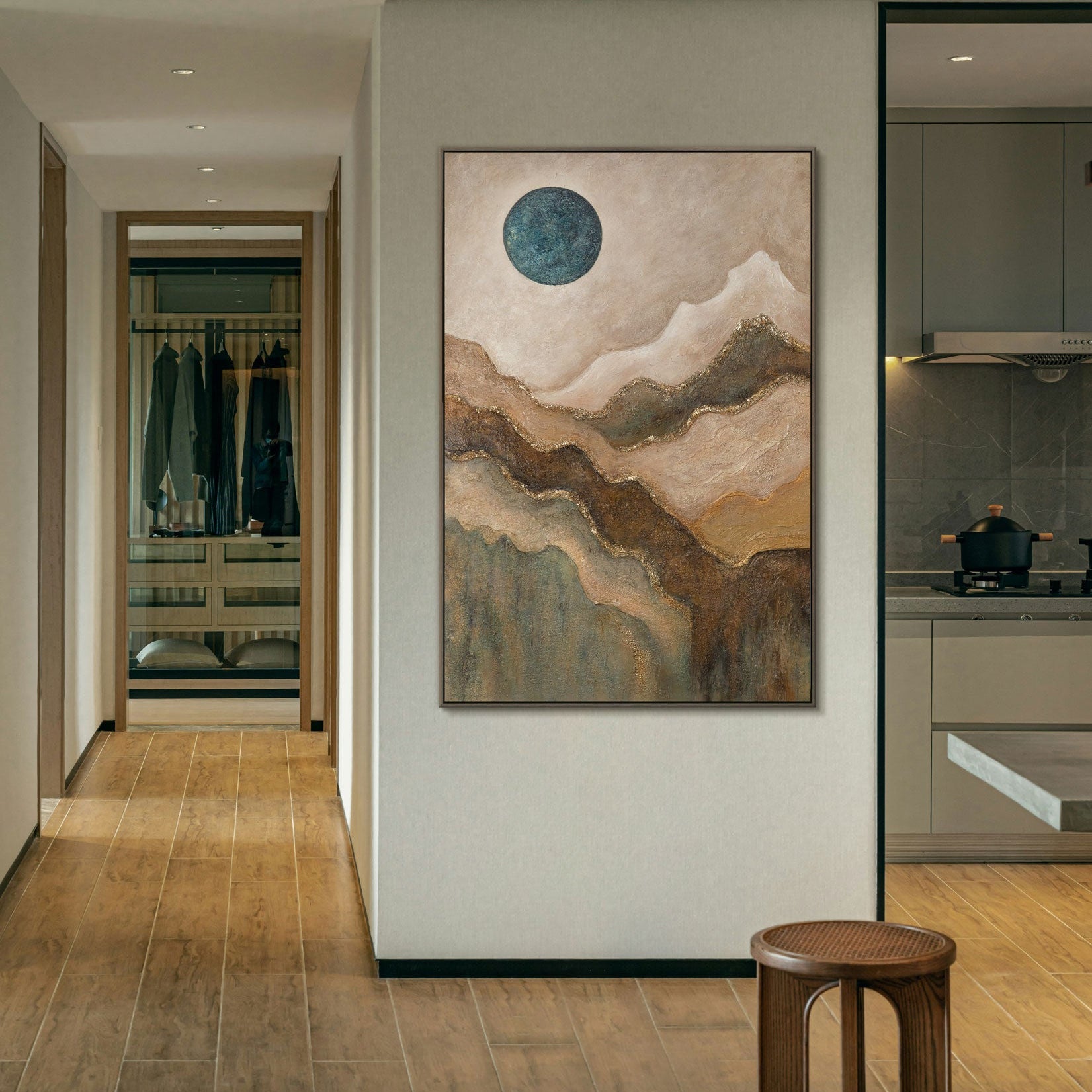 « Soleil vert émeraude » dévoile un paysage mystérieux où des sommets dorés rencontrent un soleil frais aux reflets vert-bleu. La composition de couches, de textures et de touches métalliques évoque des horizons lointains et le jeu de lumière sur les rochers et la brume. Chaque coup de pinceau traduit le mouvement, la profondeur et l'énergie tranquille de la nature.