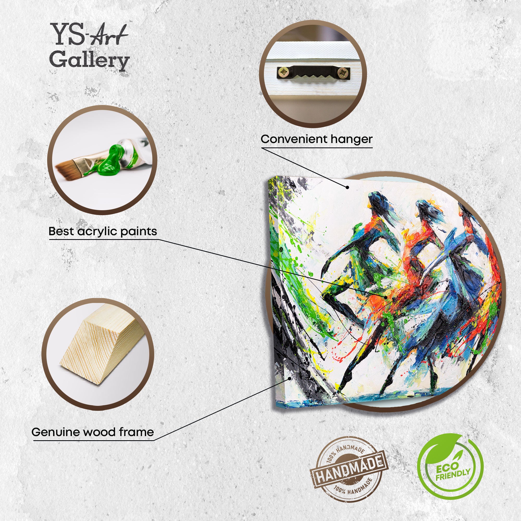 Dieses kunstvolle Acrylgemälde fängt die Eleganz und Lebendigkeit tanzender Frauen in explosiven Farbtönen ein. Die abstrakten Pinselstriche in Rot, Grün, Blau und Gelb verleihen dem Werk eine dynamische Bewegung und eine starke emotionale Ausdruckskraft.