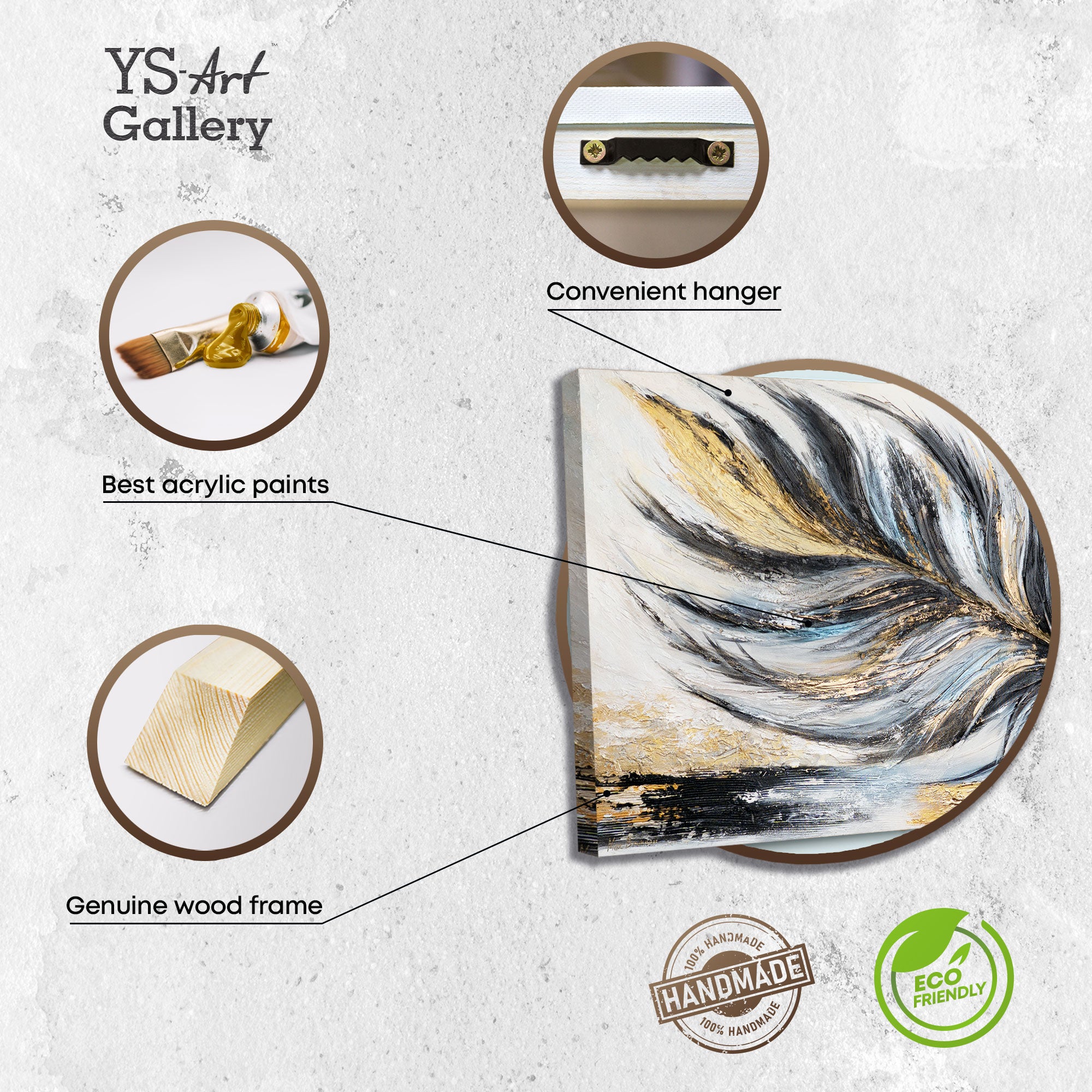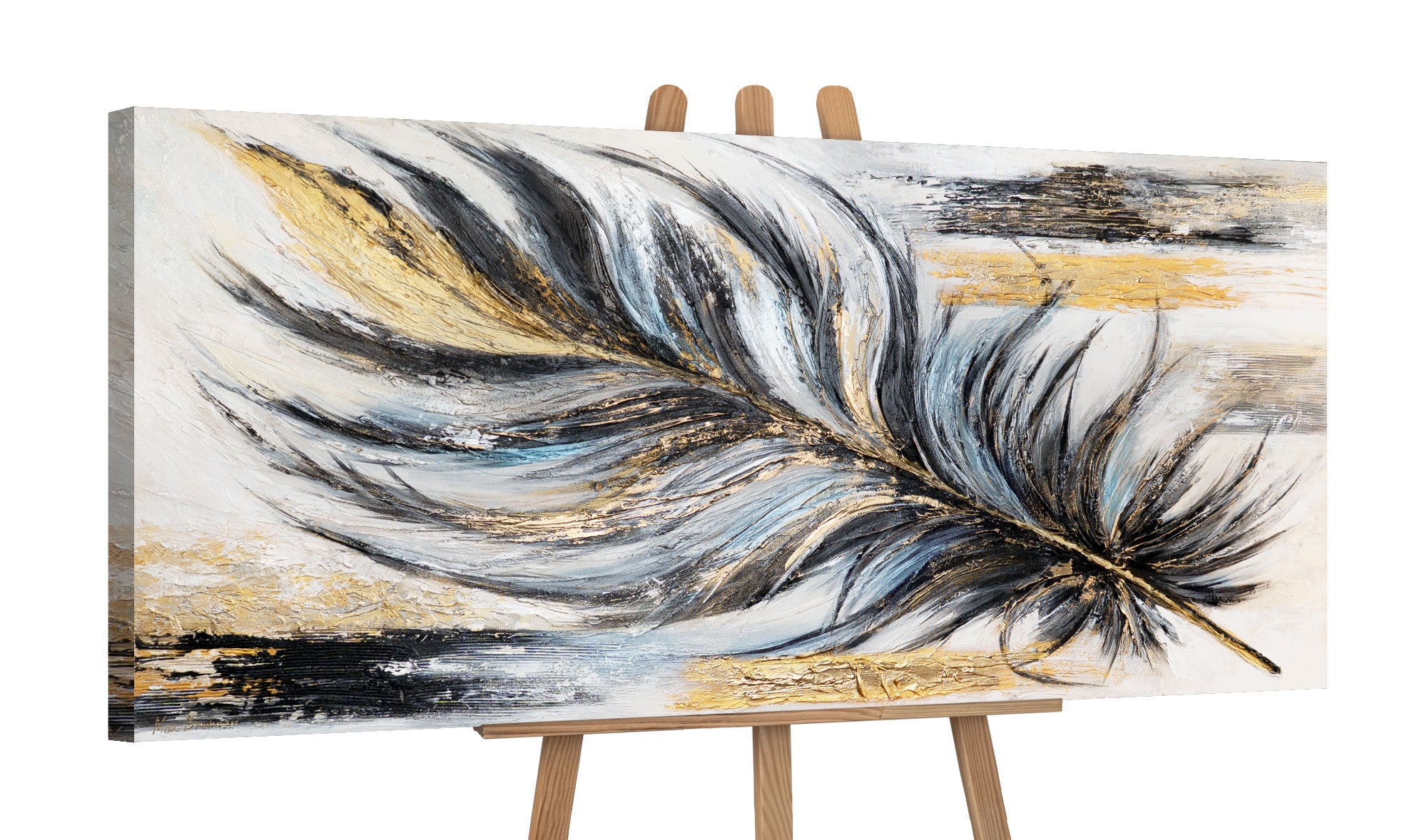 Ein edles handgemaltes Kunstwerk, das die Schönheit einer goldenen Feder in dynamischen Pinselstrichen einfängt. Die Kombination aus Schwarz, Weiß, Blau und metallischem Gold verleiht dem Acrylbild eine zeitlose Eleganz, die sowohl moderne als auch klassische Wohnräume bereichert.