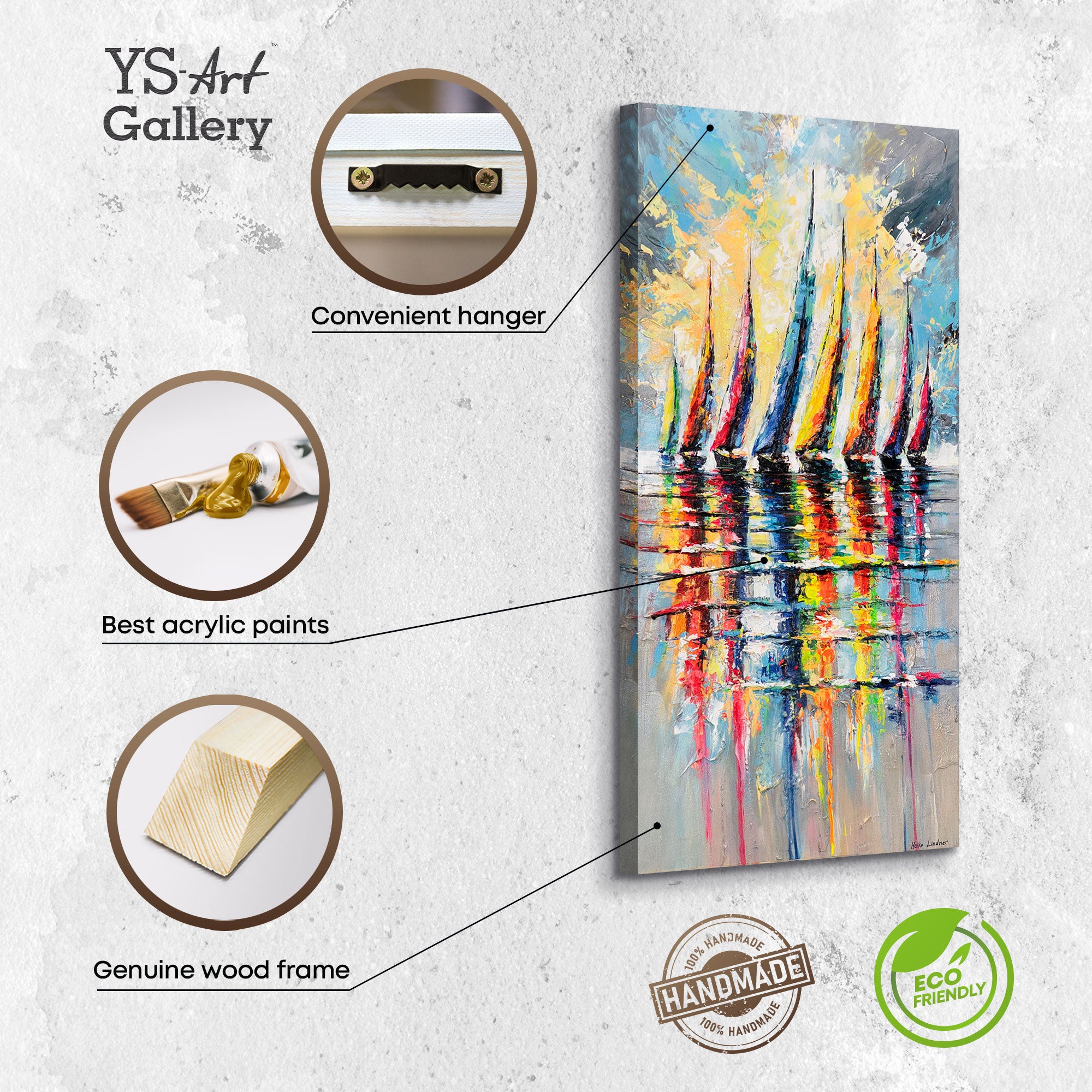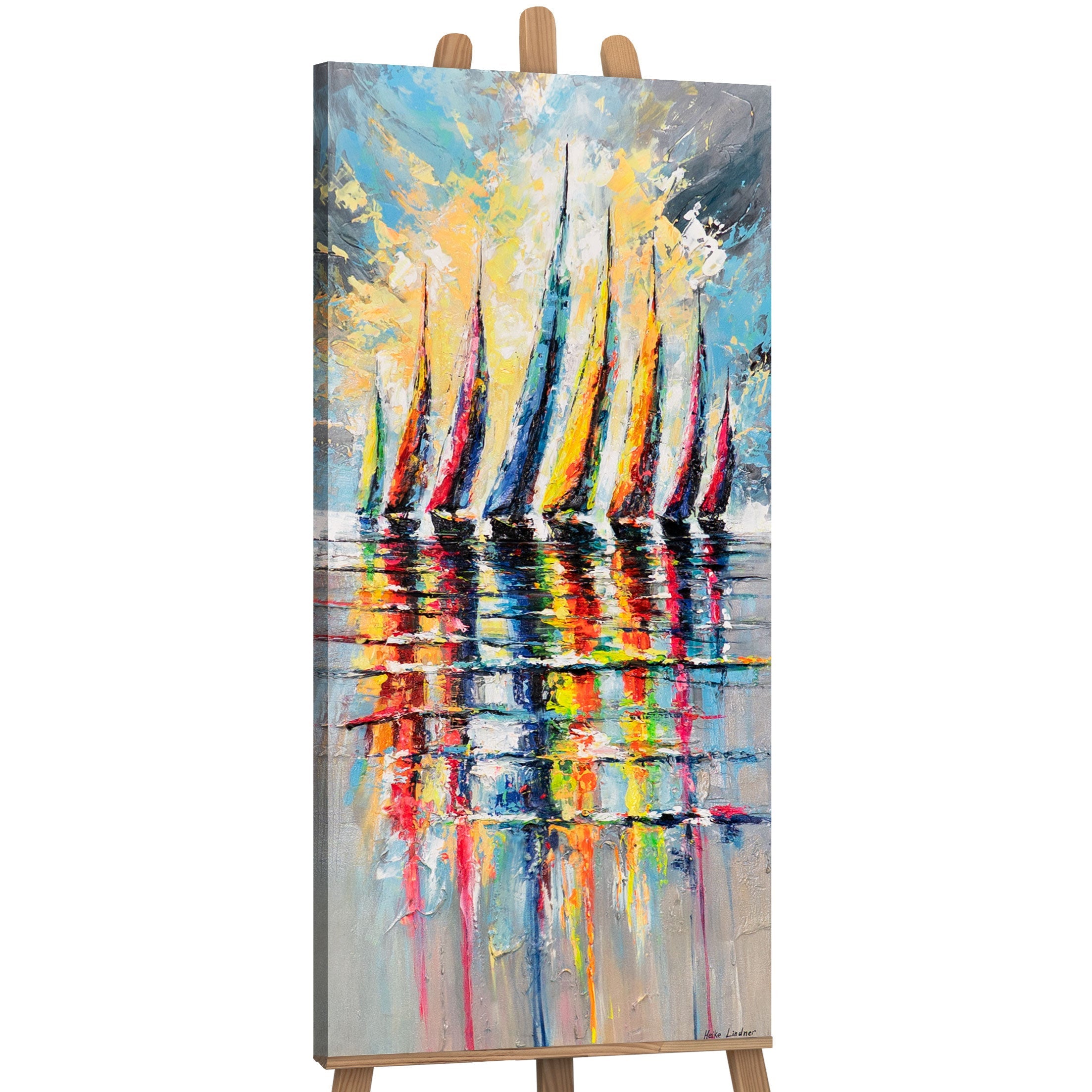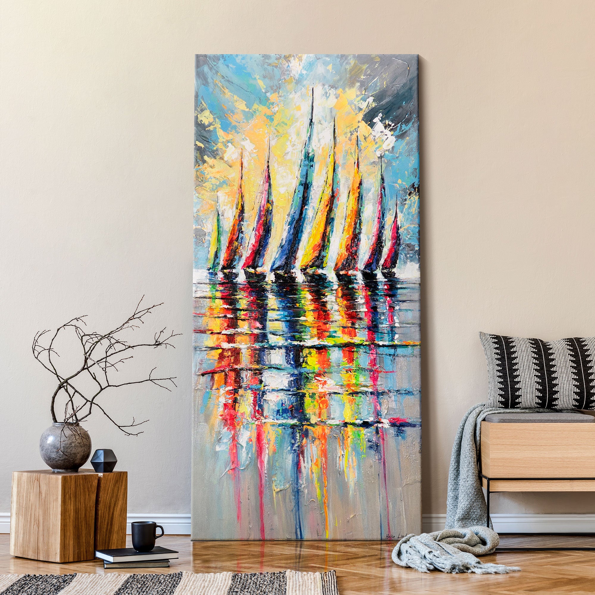 "Coloured Sails" ist ein handgemaltes Acrylbild auf Leinwand mit lebendiger Darstellung bunter Segelboote in abstrakter Form. Die kräftigen Farben spiegeln sich im Wasser und erzeugen eine dynamische, fröhliche Atmosphäre, ideal für moderne Wohnräume.