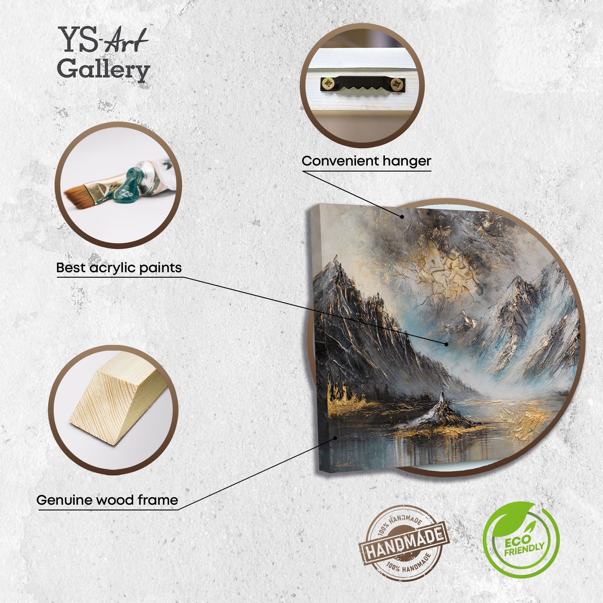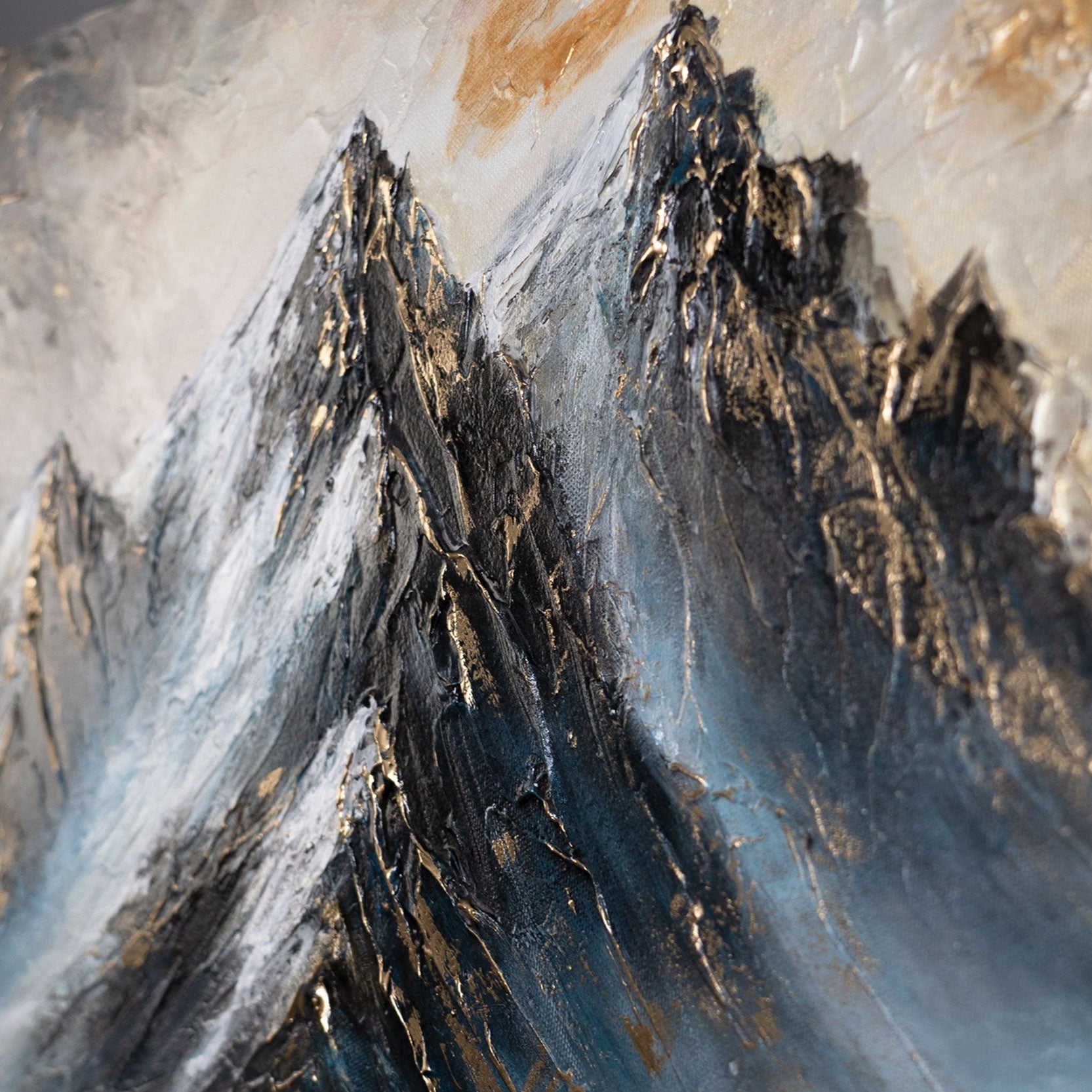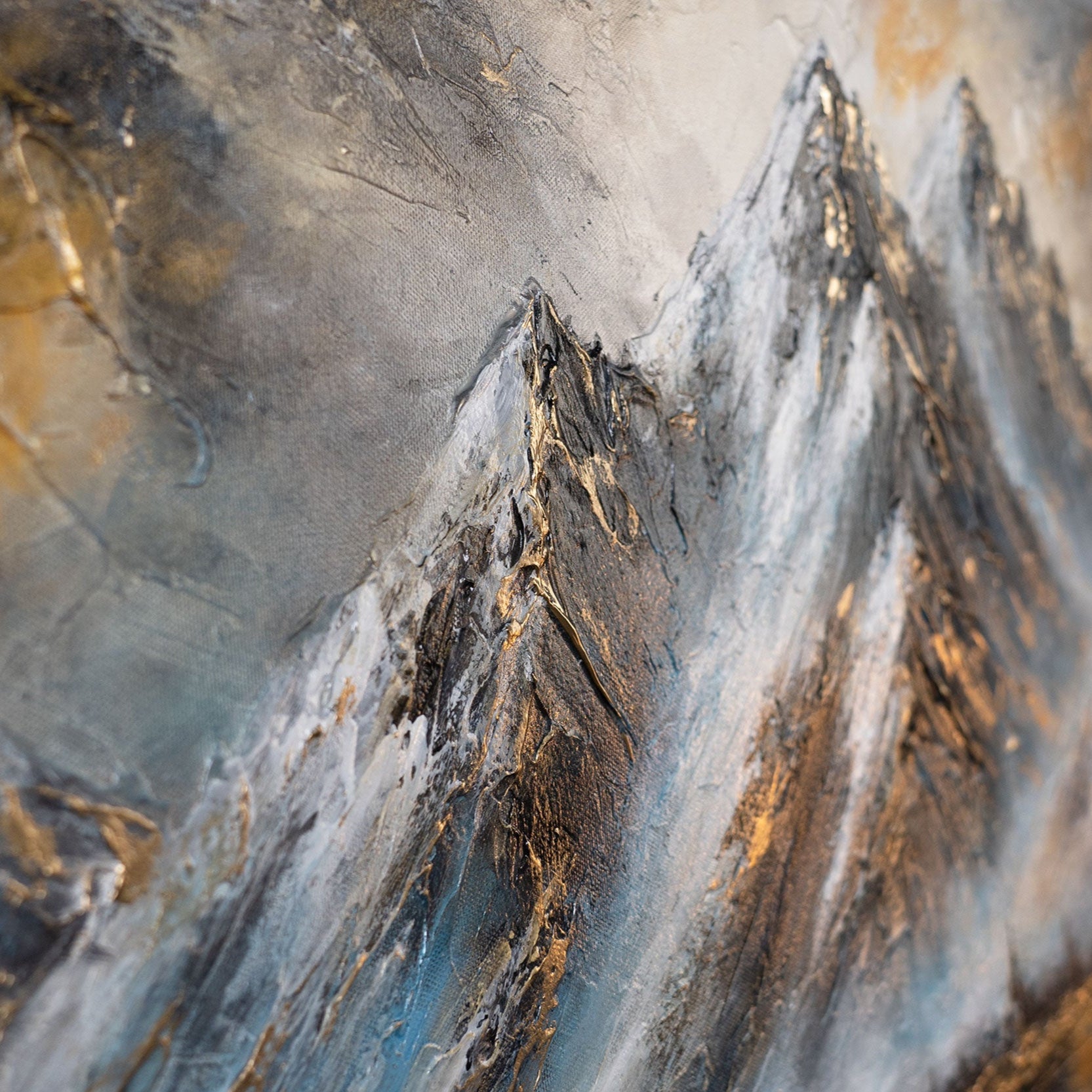 Ein imposantes Bergpanorama in kühlem Blau und leuchtendem Gold fängt die Magie der Alpen ein. Das Gemälde zeigt verschneite Gipfel, die sich in einem ruhigen See spiegeln. Mit strukturierter Spachteltechnik und fein gesetzten Goldakzenten entsteht ein ausdrucksstarkes Kunstwerk.