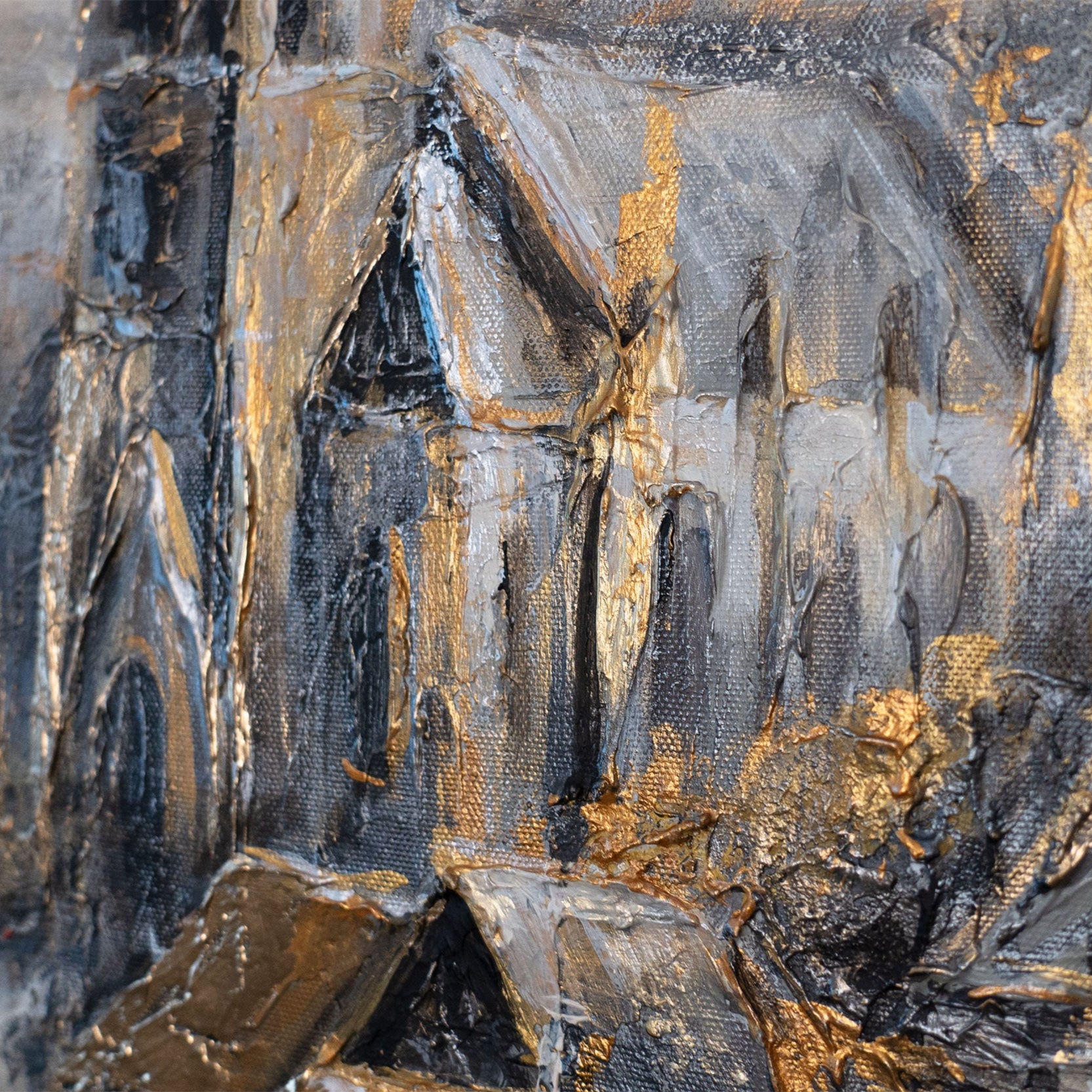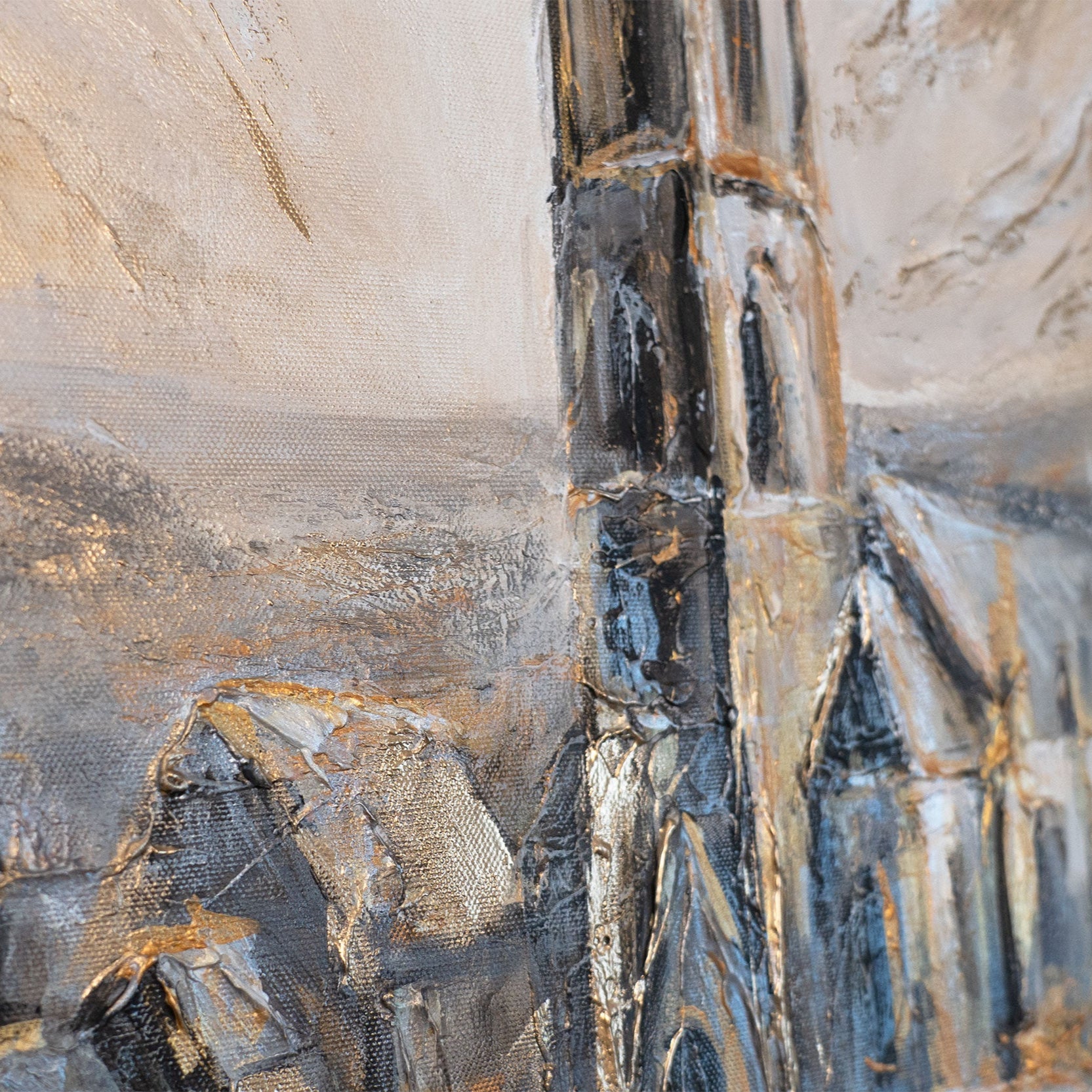 Das Gemälde „Antike Kathedrale“ zeigt eine detaillierte Stadtansicht mit einer monumentalen Kathedrale im Zentrum. Die harmonische Kombination aus Grau, Beige und Gold sowie die ausgeprägte Struktur verleihen dem Werk Tiefe und Eleganz.