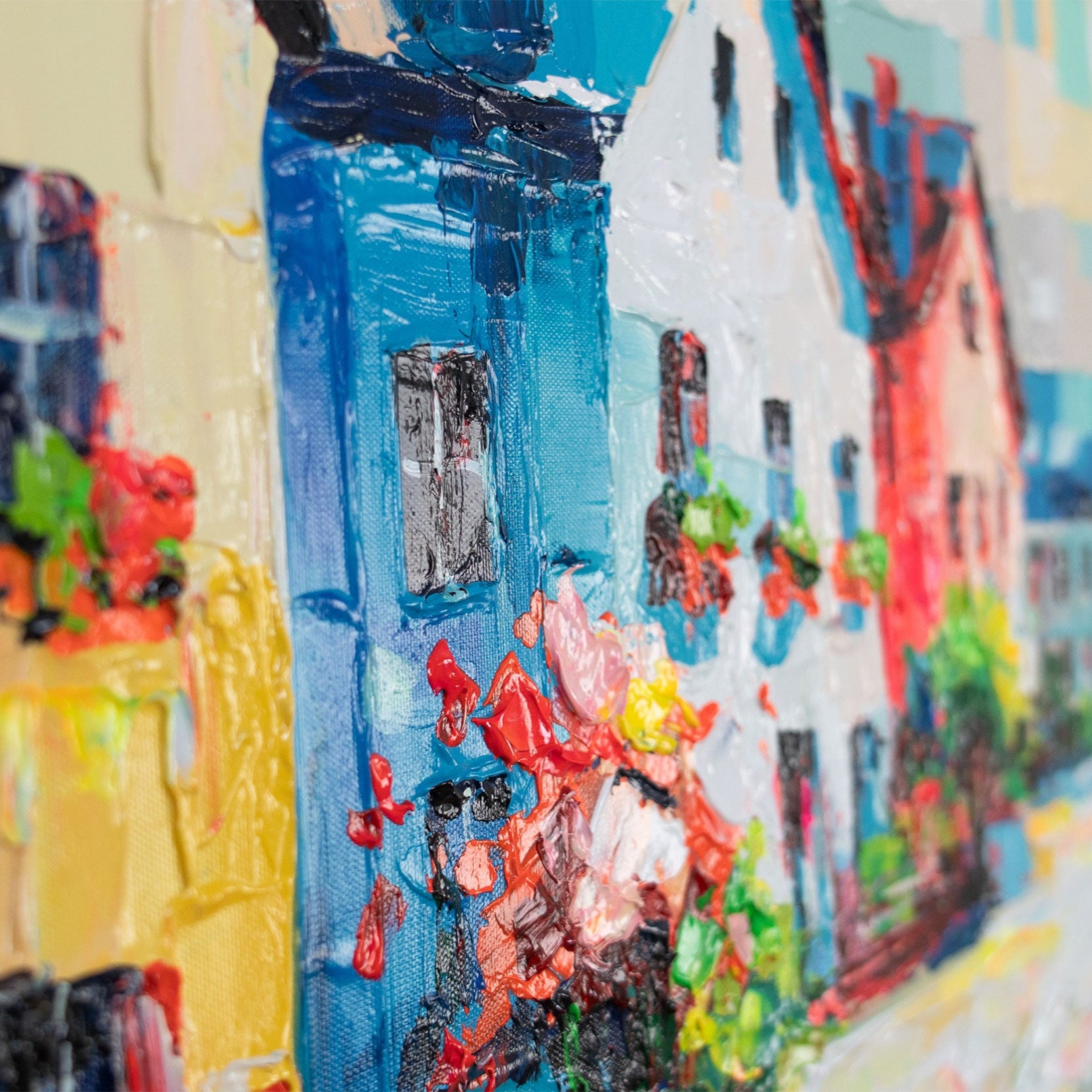 • Nahaufnahme Acrylbild mit bunten Hausfassaden, Leinwandstruktur