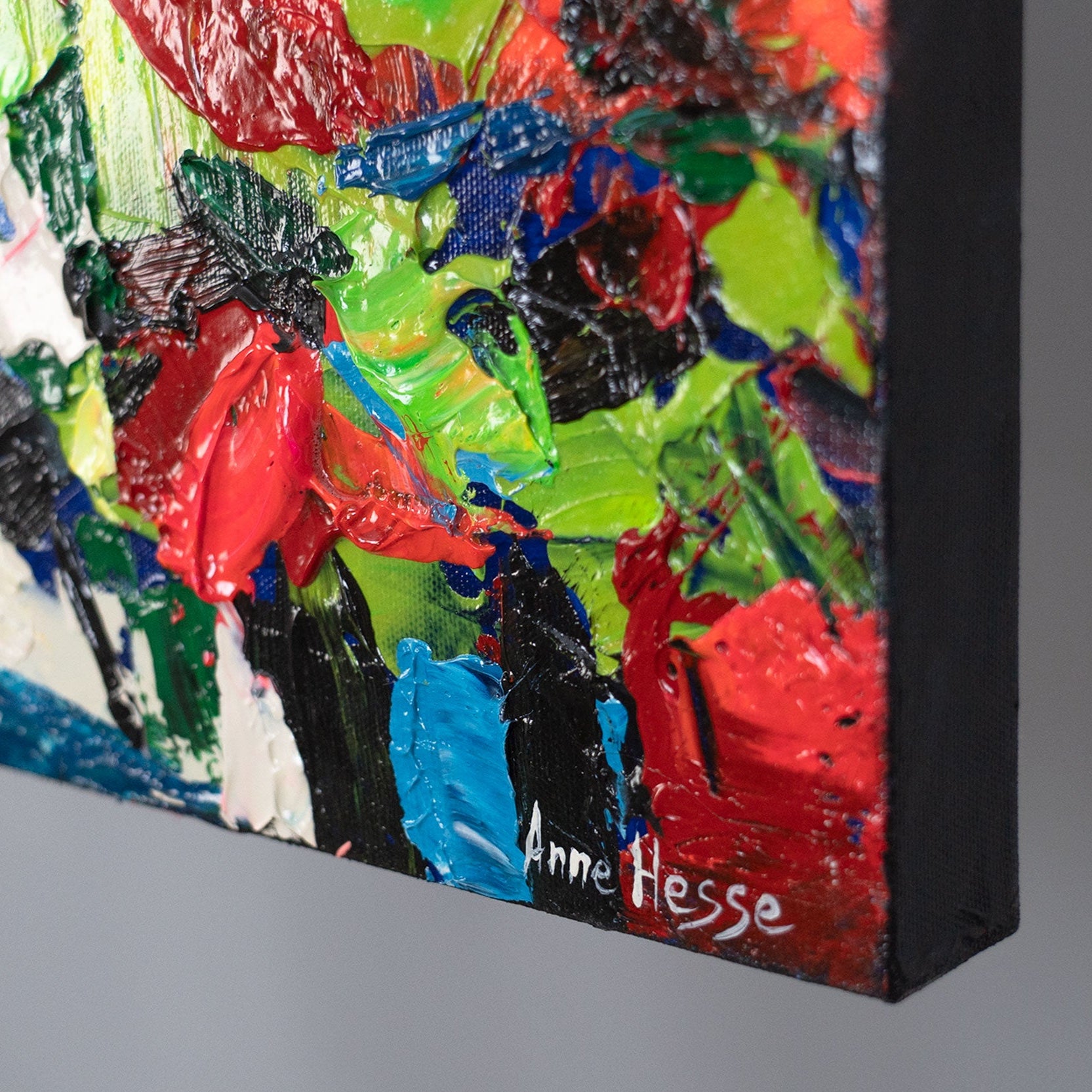 • Nahaufnahme Acrylbild mit roten Blüten und bunten Hausfassaden