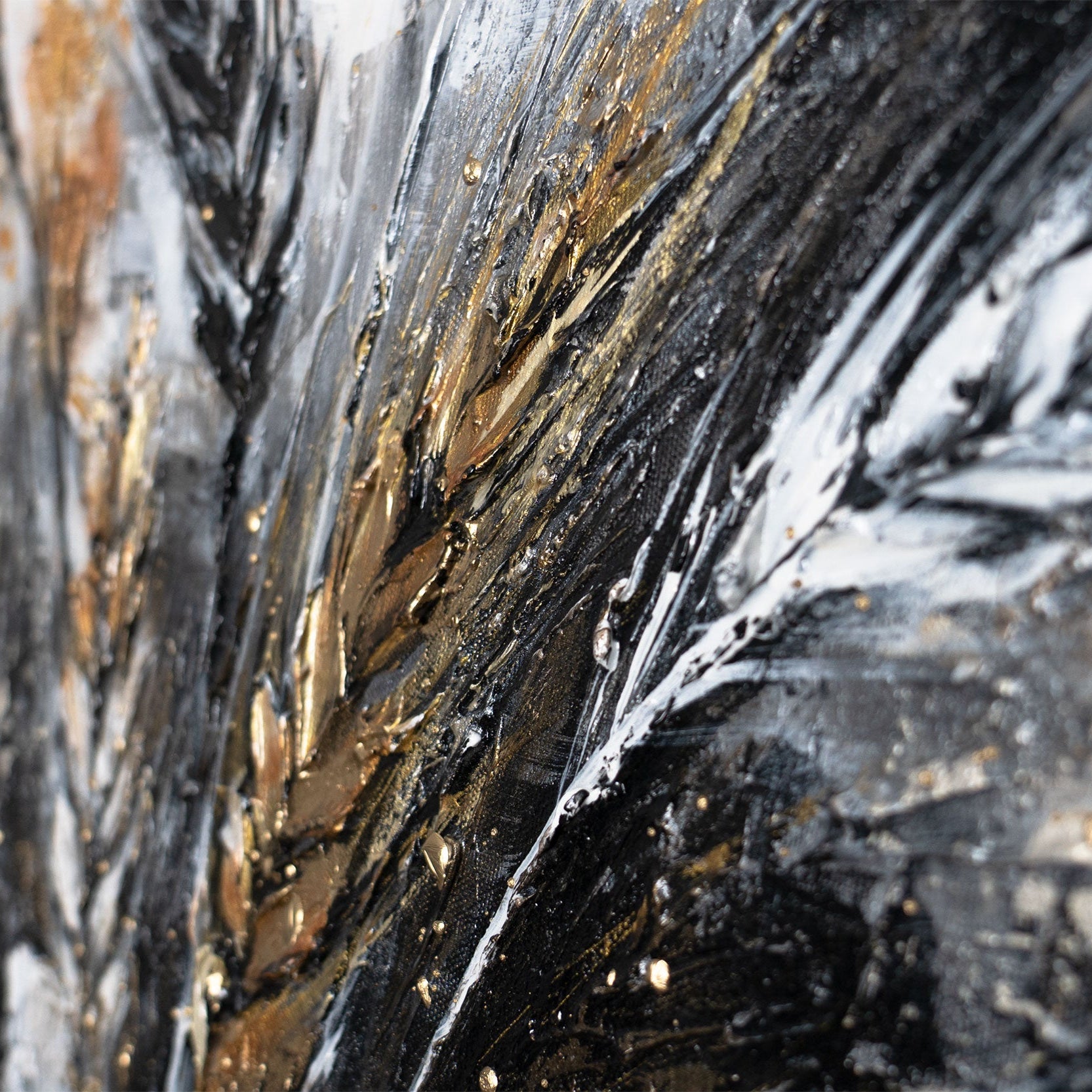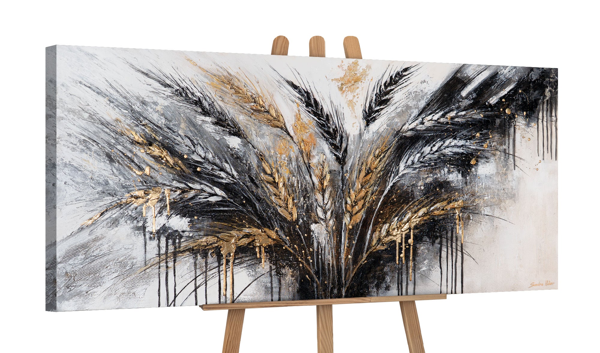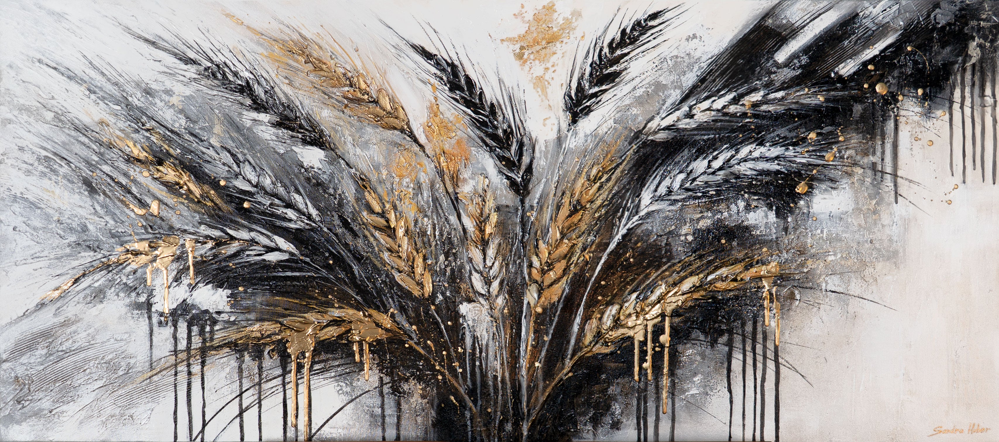 Das Kunstwerk „Stacheln“ zeigt ein modernes, handgemaltes Arrangement aus goldenen Ähren, das in seiner Tiefe und Dynamik sofort fasziniert. Die Kombination aus Schwarz, Weiß und glänzenden Goldtönen schafft ein elegantes Spiel aus Struktur, Bewegung und Kontrast.