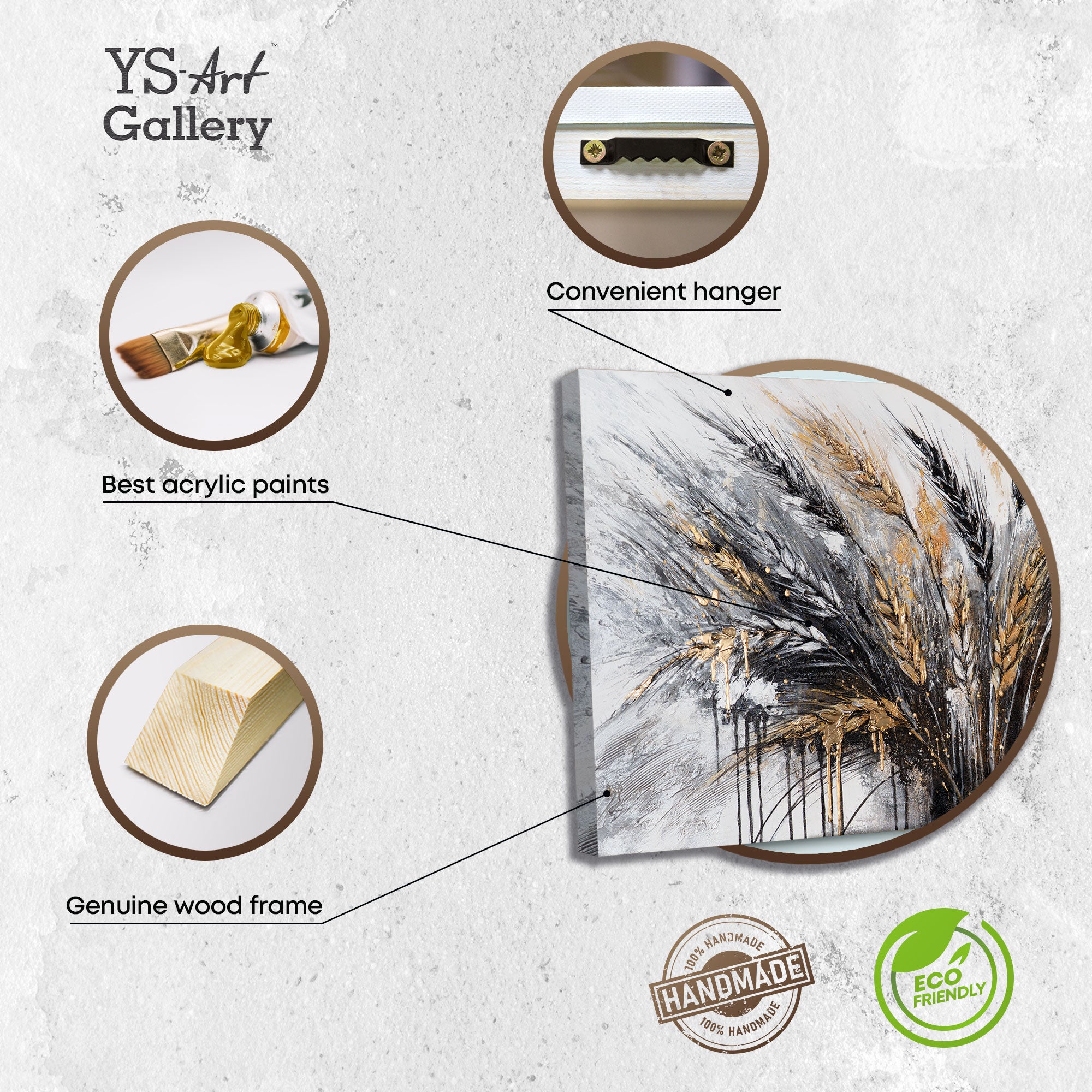 Diese Acrylmalerei wurde mit viel Liebe zum Detail auf Leinwand gefertigt und passt hervorragend zu stilvoll eingerichteten Wohn- oder Büroräumen. Die goldenen Akzente verleihen dem Bild einen edlen Charakter, während die abstrakte Gestaltung zeitgenössische Kunst in den Alltag bringt.